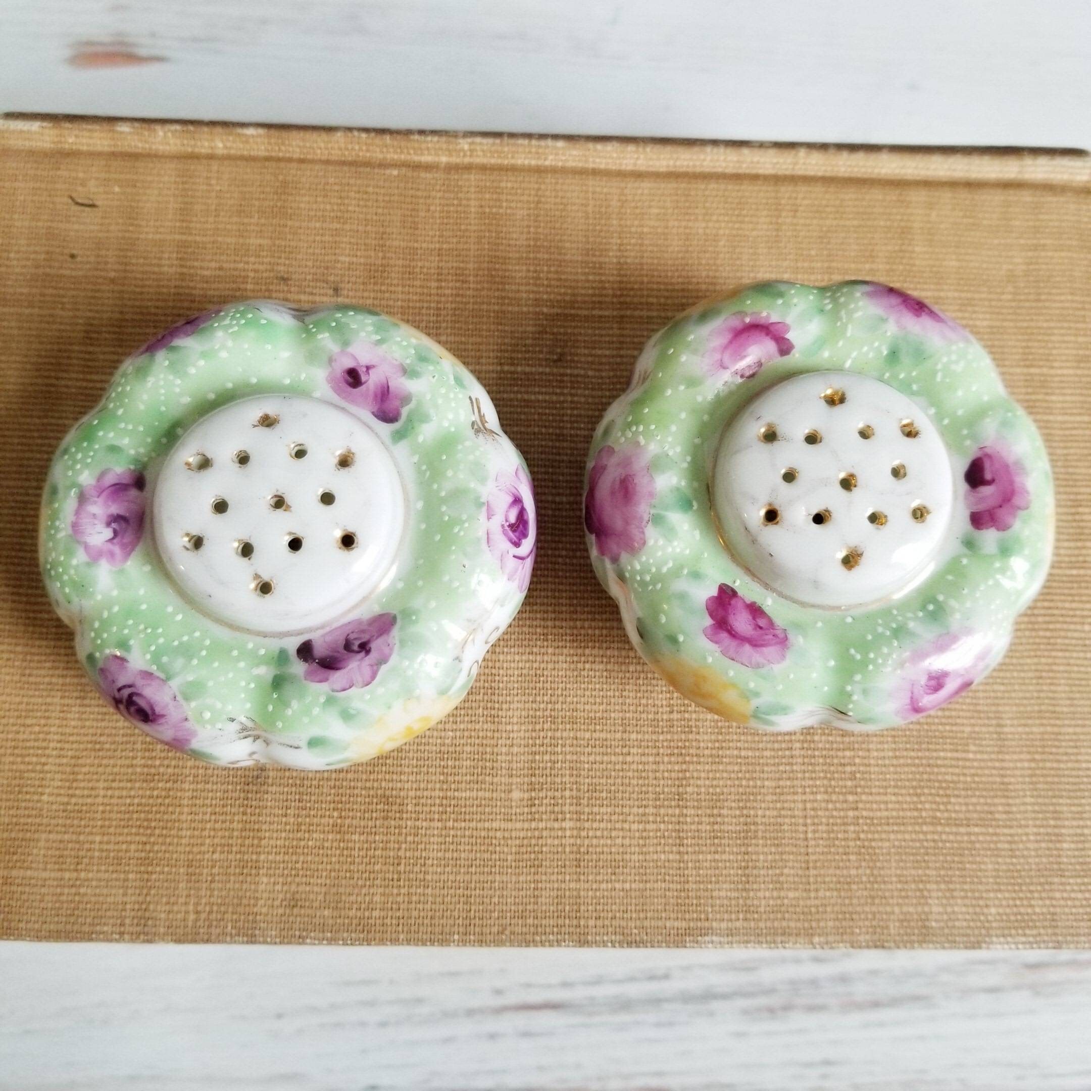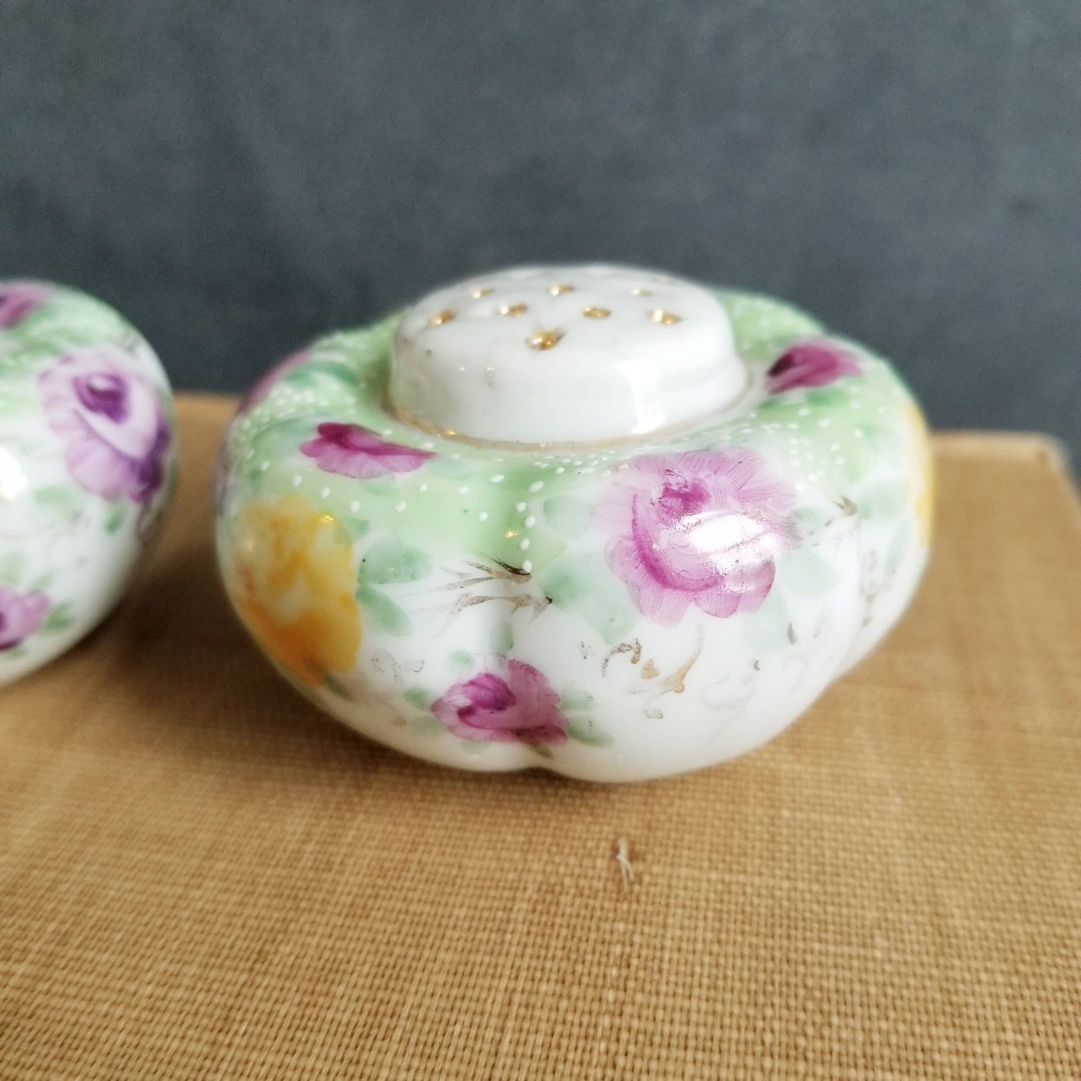 Pretty floral cottagecore salt and pepper shakers, purple and yellow roses with gold tipped highlights, some wear and tear.