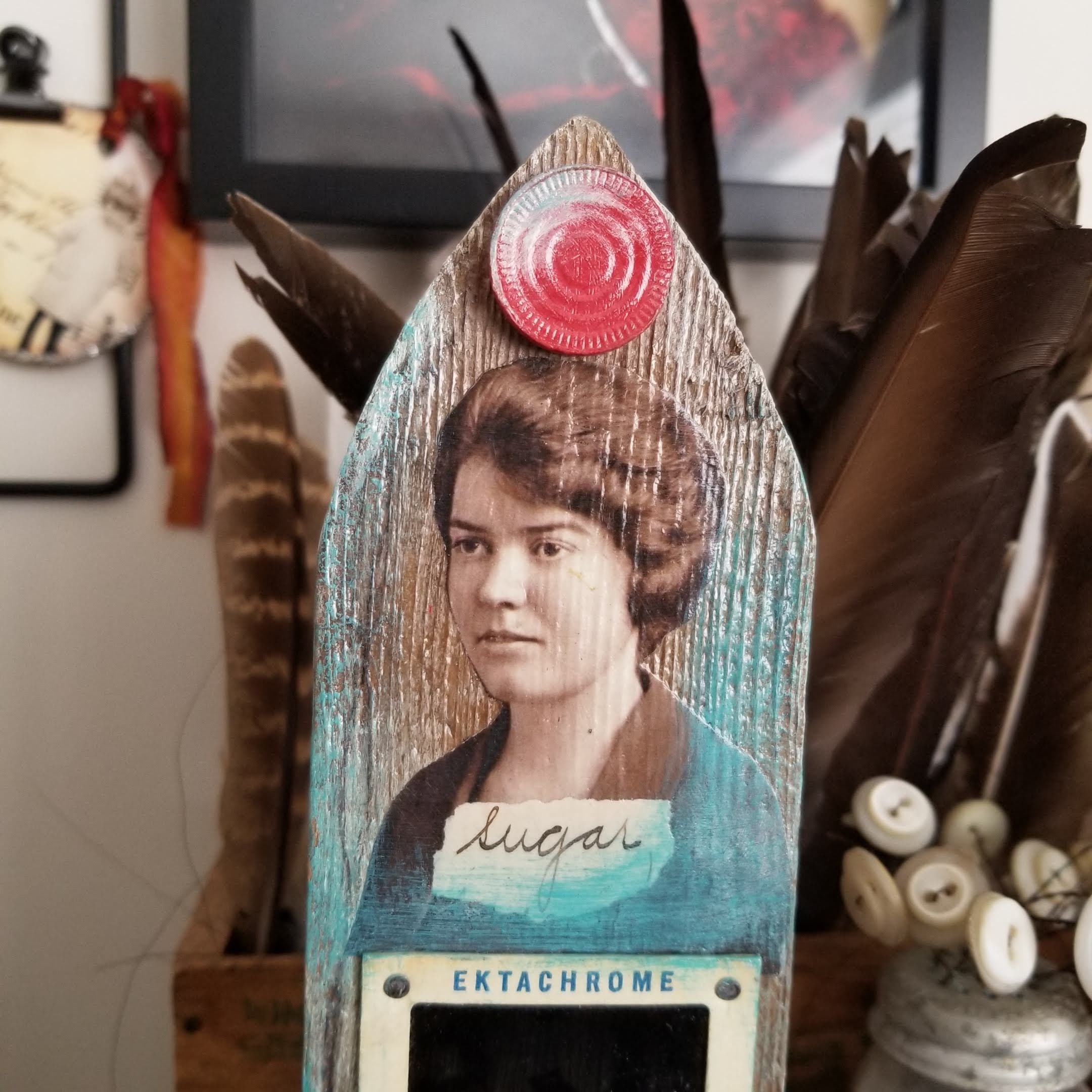 Sugar : Wooden assemblage on an old picket fence piece. Features a collage of a young woman, game pieces and vintage ectachrome slides. Has a sawtooth hanger on the back.