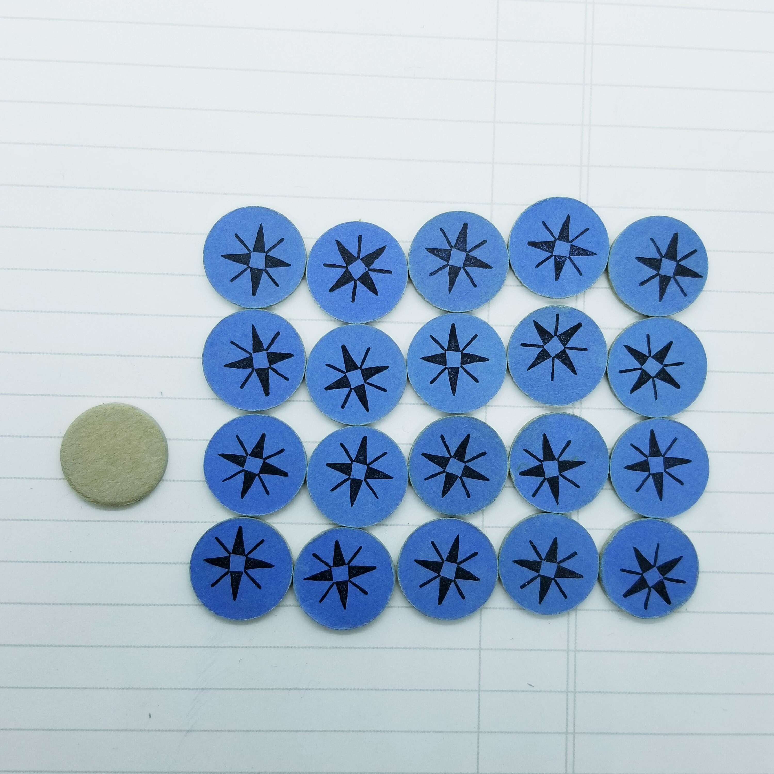 20 blue game pieces, cardboard, with blue one side and a star graphic in black, beige on back side. 18mm across.