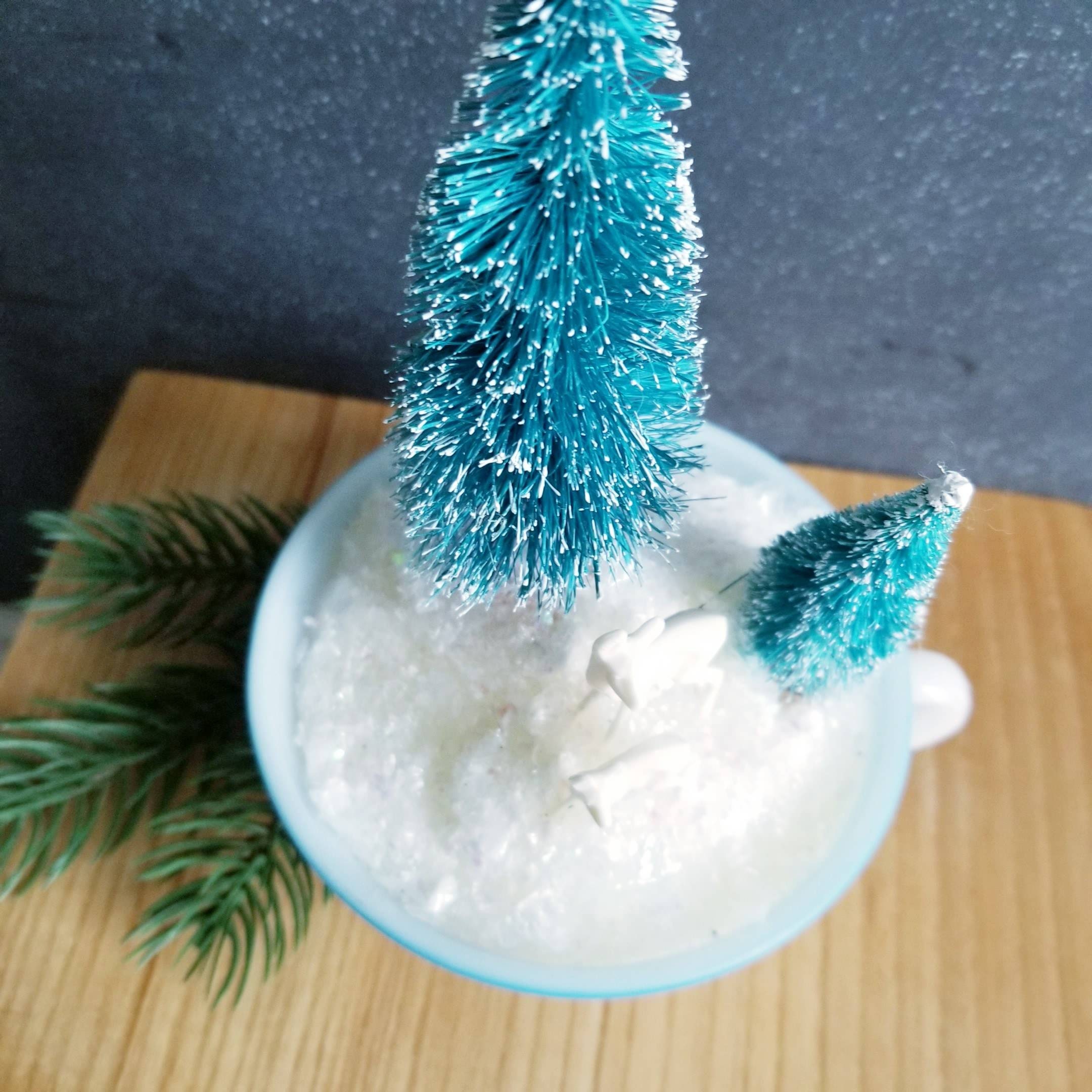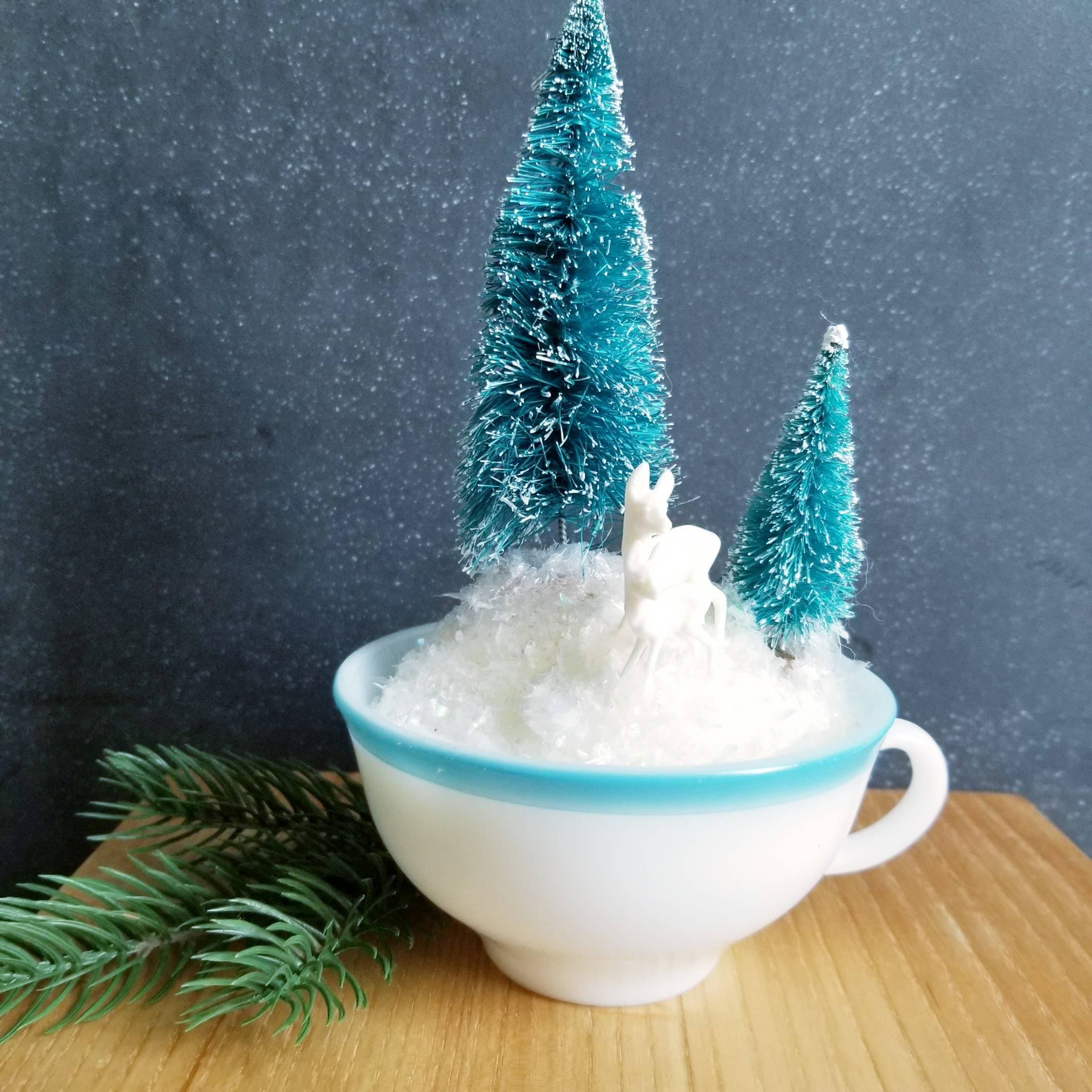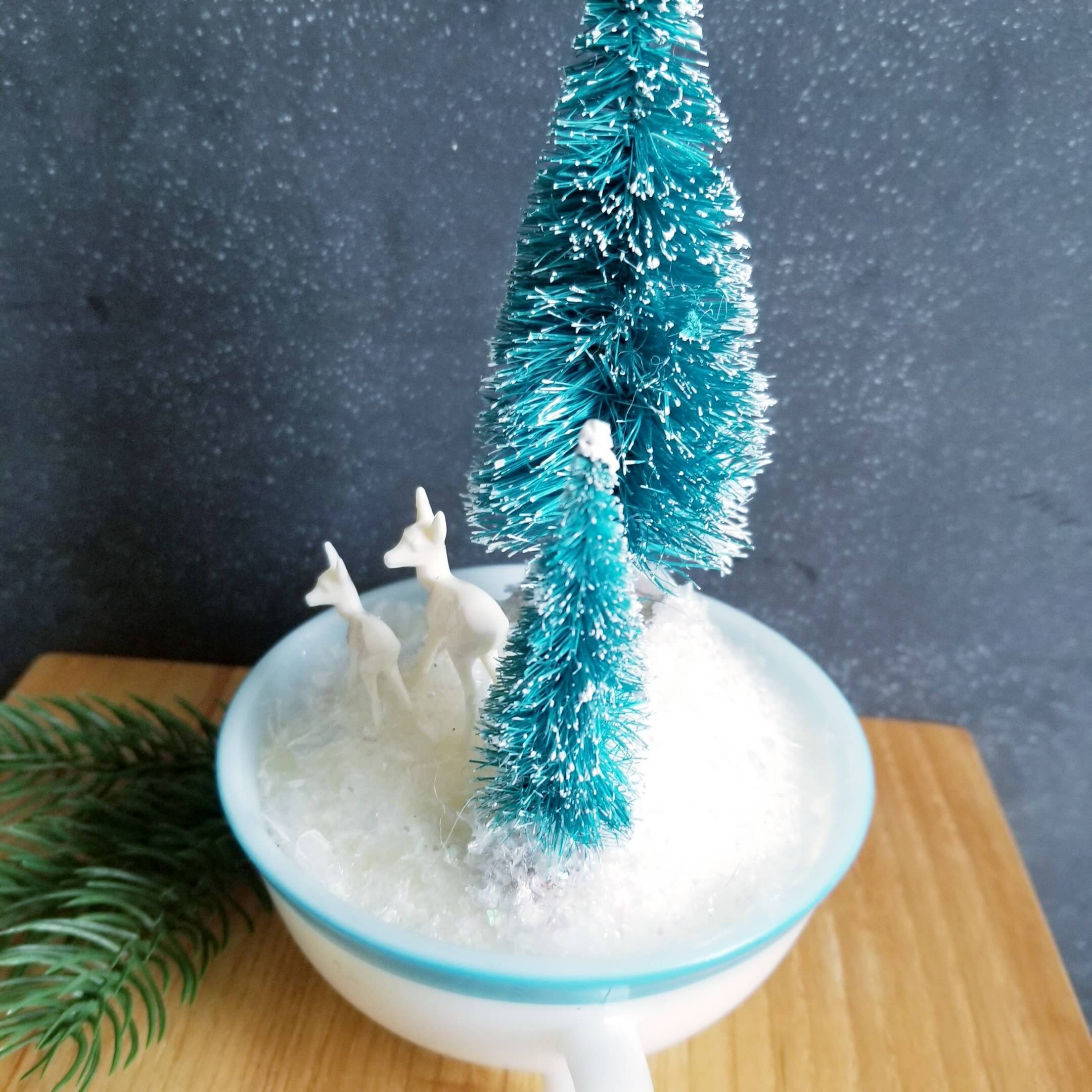 Pretty Christmas vignette nestled into a retro glass cup with blue trim. Two large bottle brush trees in blue are complimented by small creamy white plastic deer. All are nestled into soft fluffy plastic 'snow'.