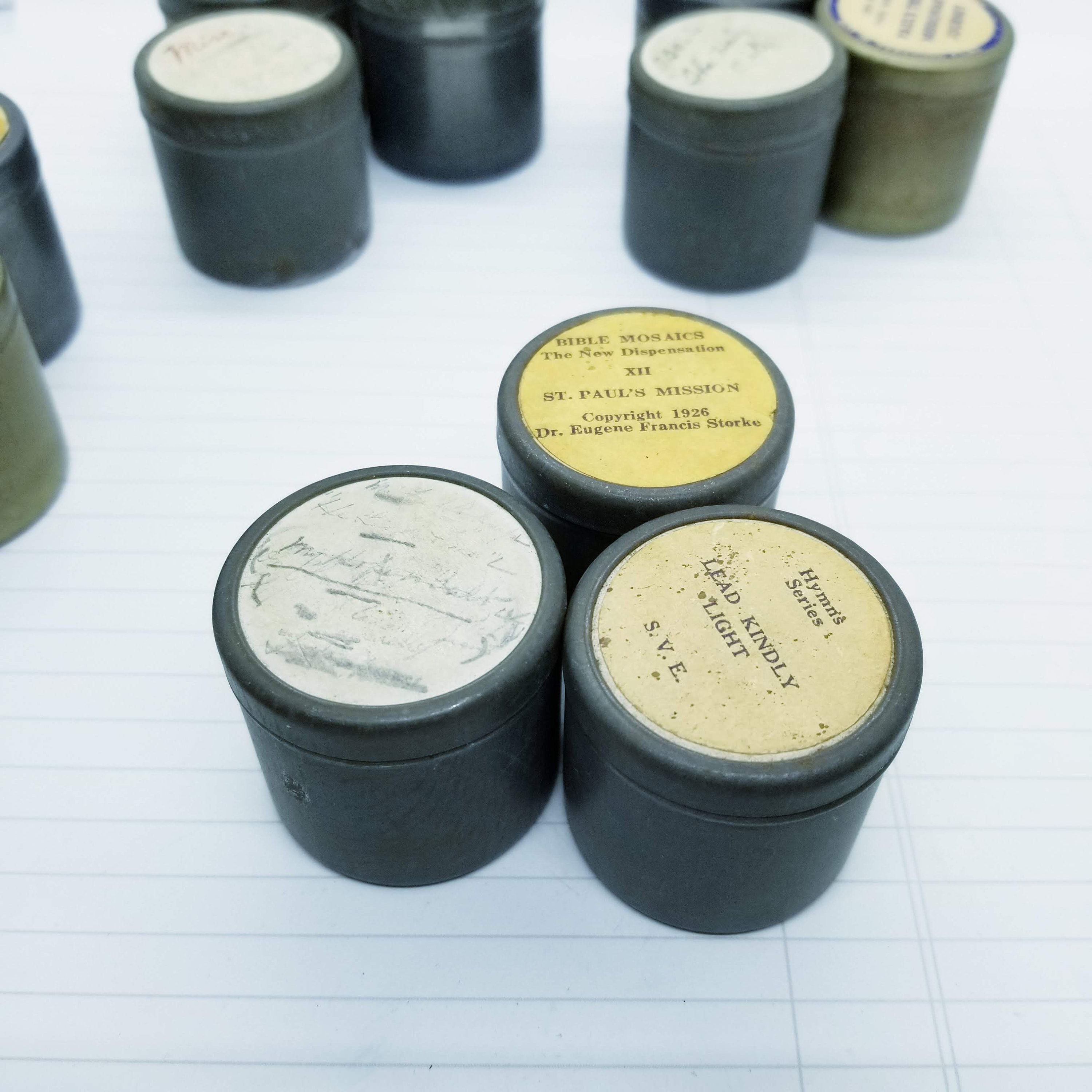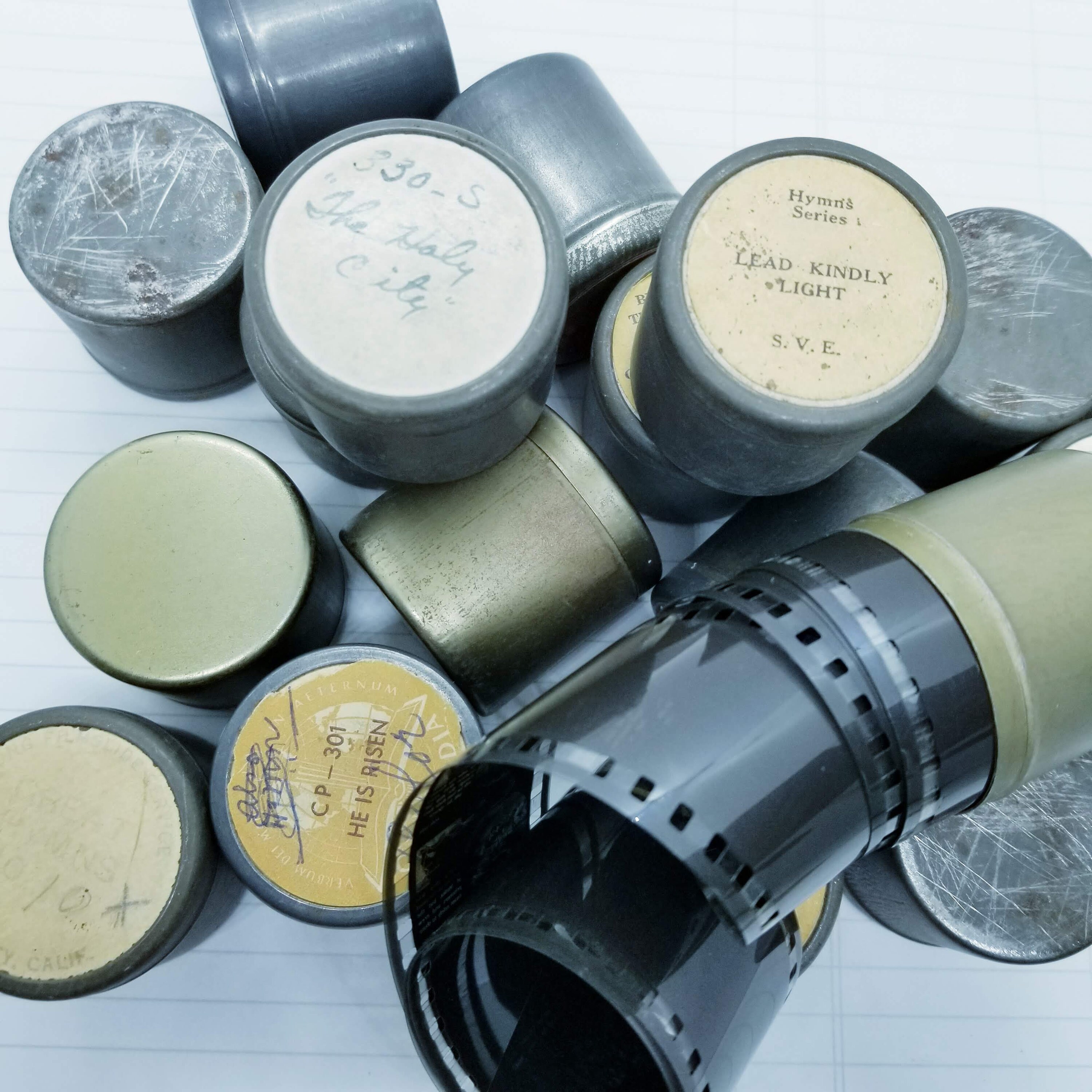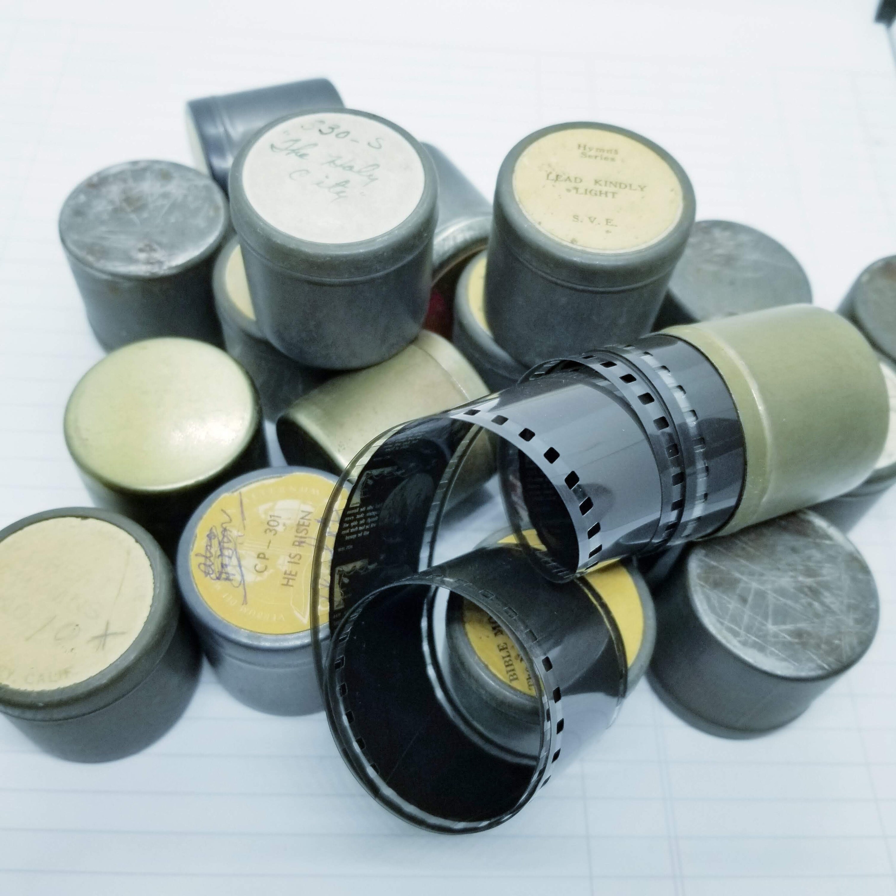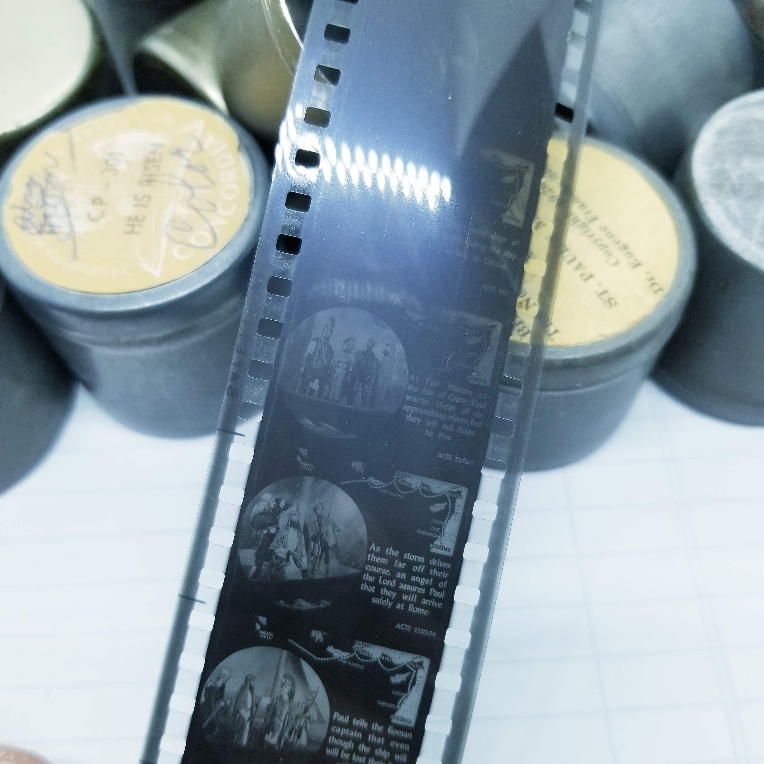 Randomly picked set of 3 metal filmstrip canisters with pieces of filmstrips inside. I do not know if the filmstrips are whats on the label or if they are intact. All canisters/filmstrips are Judeo-Christian in nature.