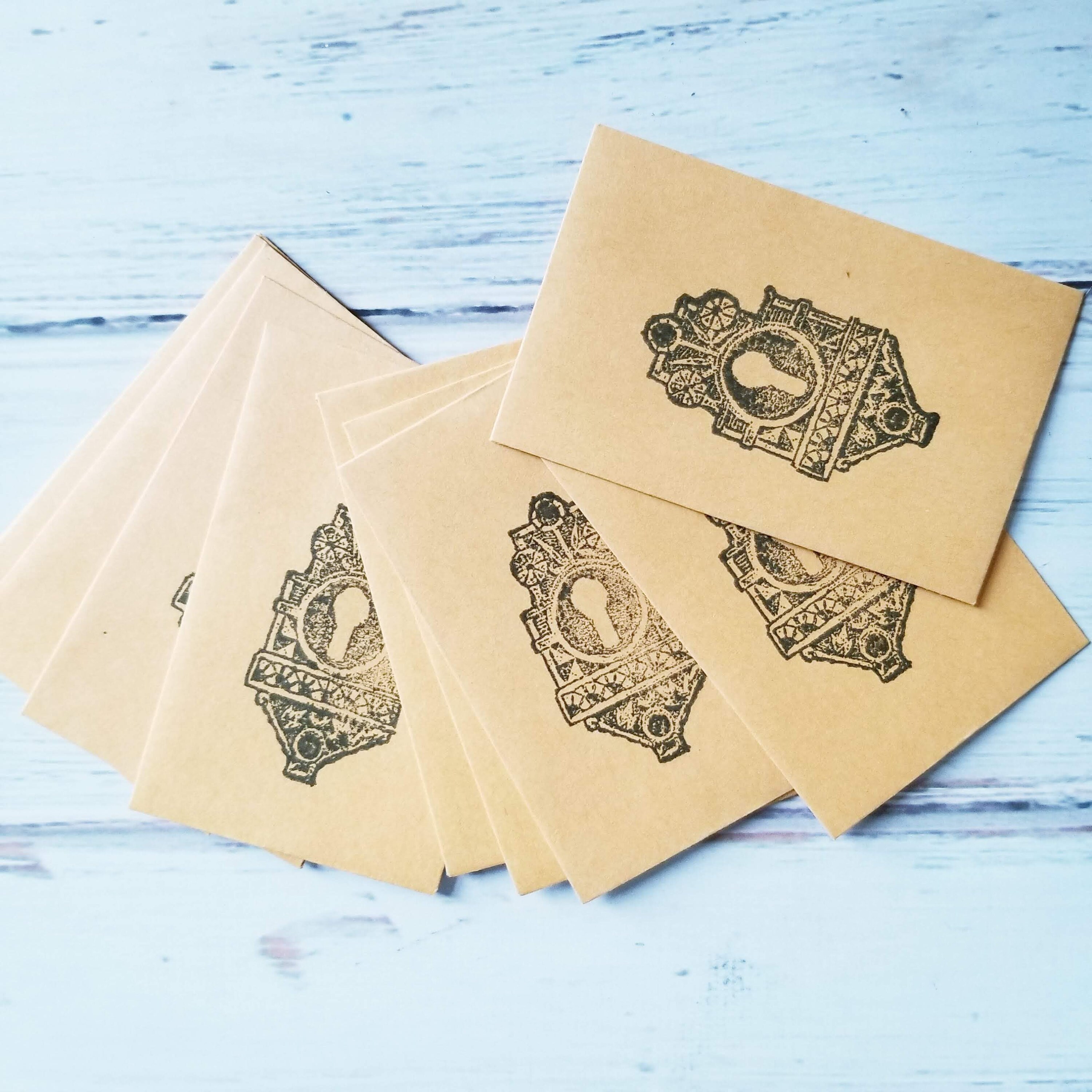 10 manila envelopes that I've stamped with a vintage lock stamp. Choose your favorite lock from the menu. Perfect for an addition to a scrapbook, add into an altered book or maybe use as a small gift for a friend?