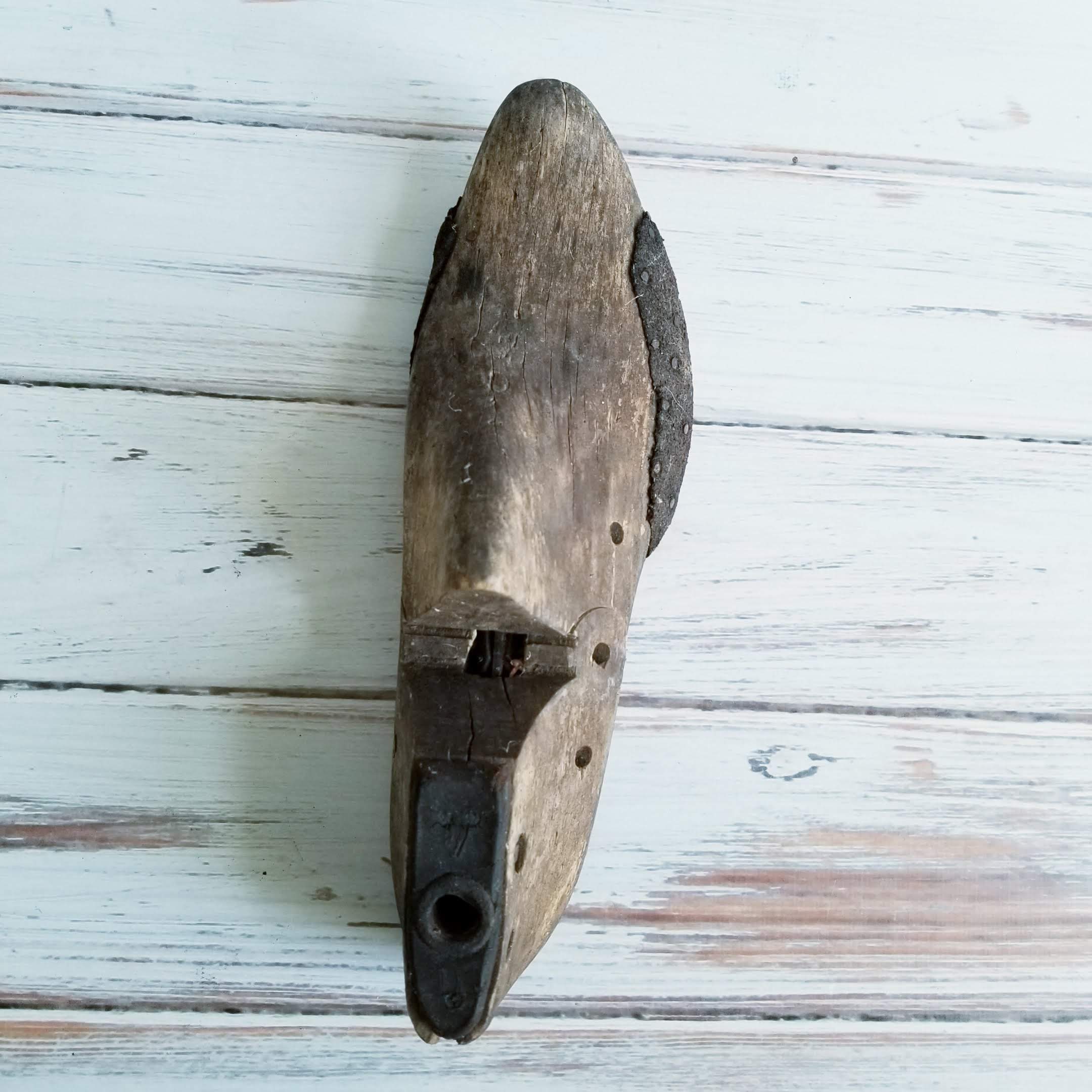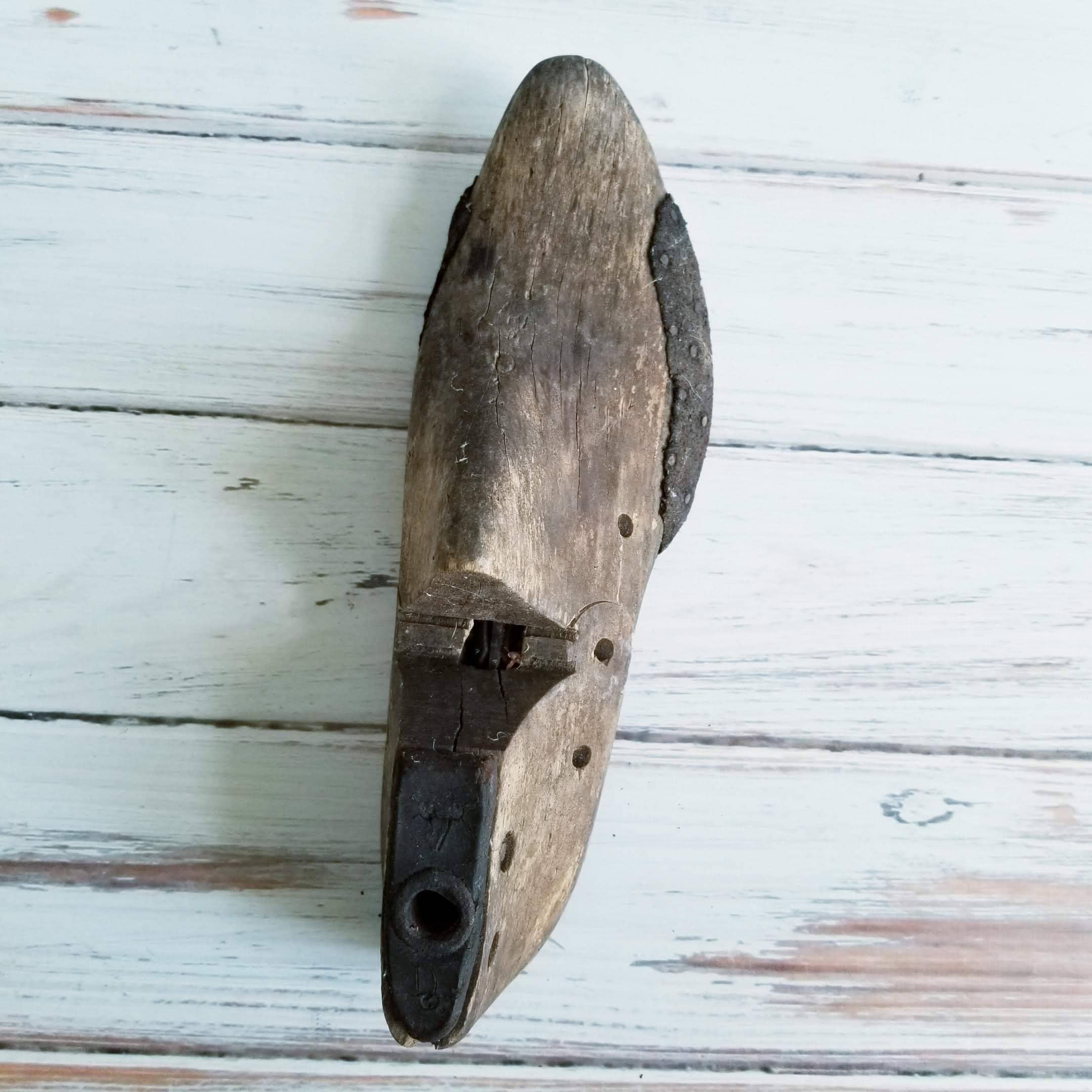 Vintage shoe last, shoe form. In rustic condition, still has leather nailed on around the edges.