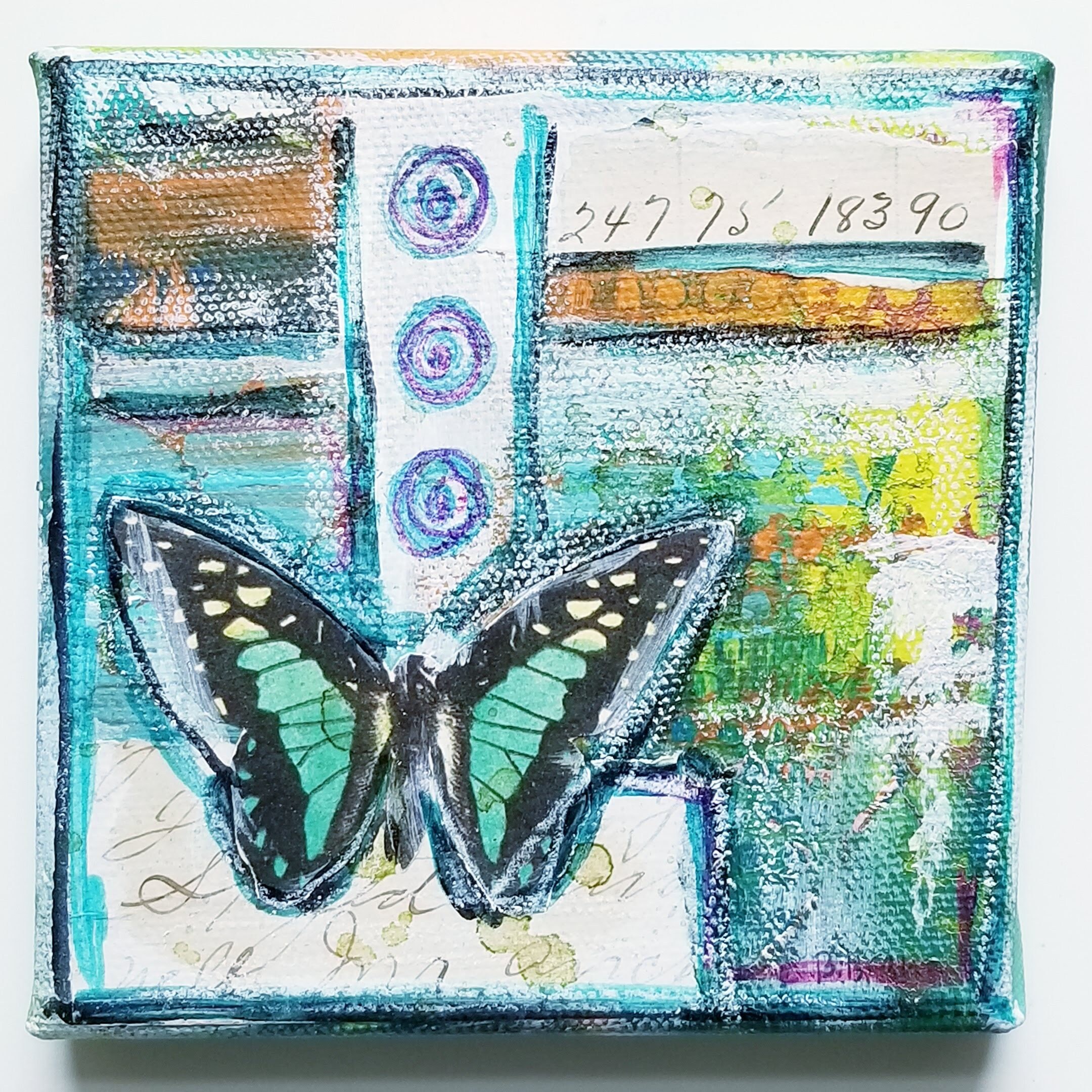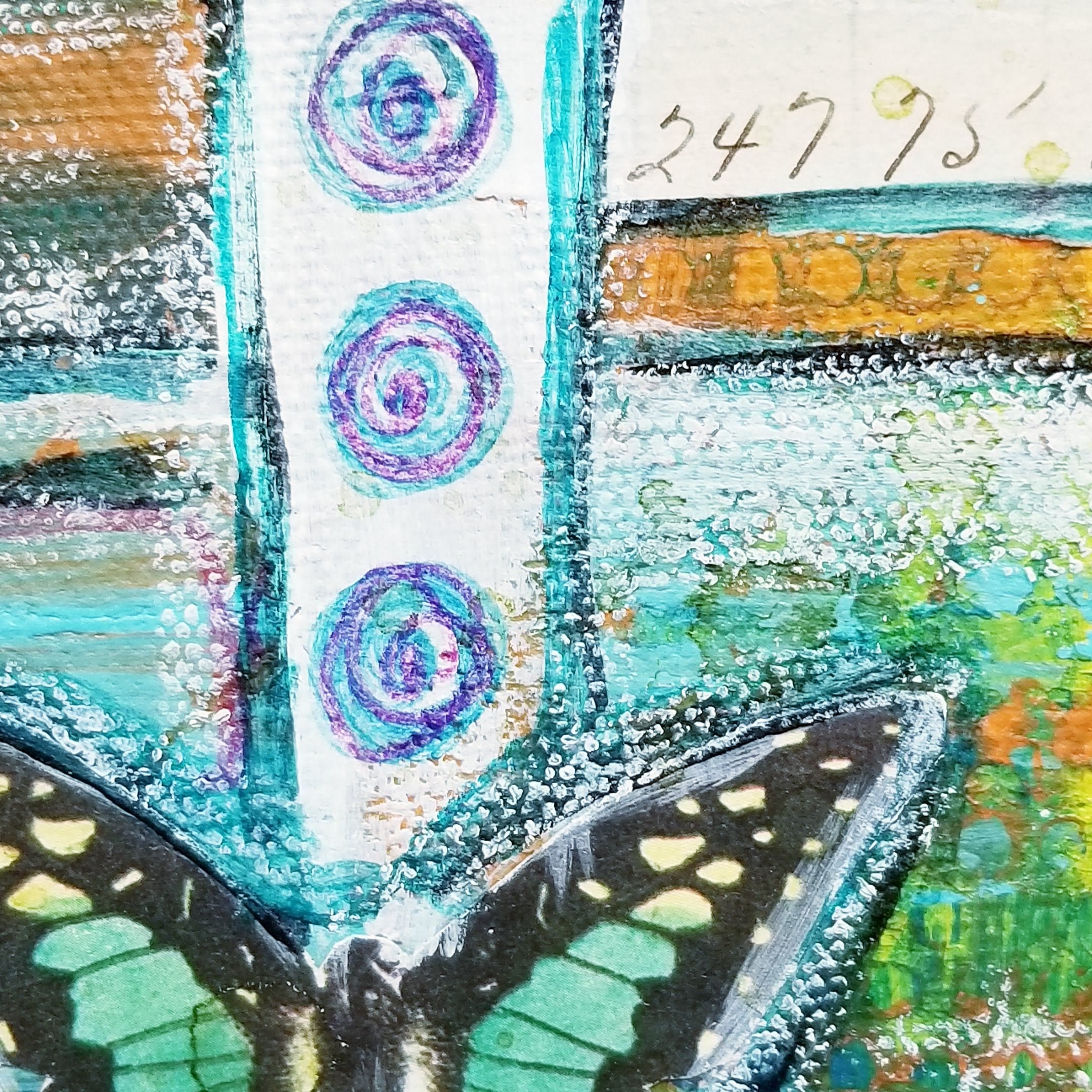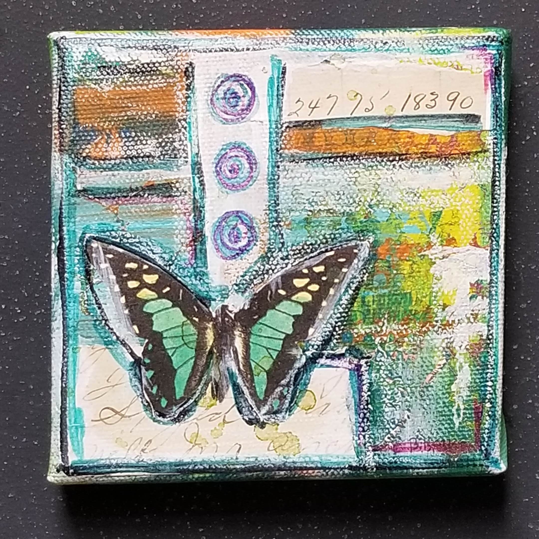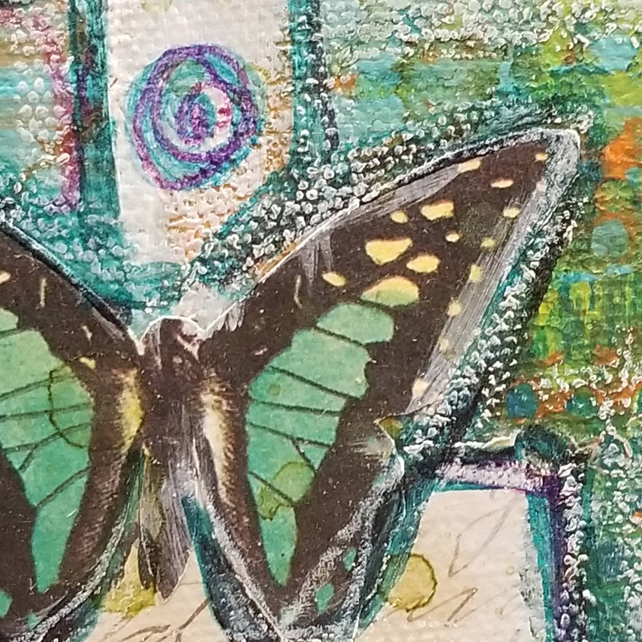 Mini Art Abstract Artwork- Green & Bisque Butterfly- Colorful Artwork- Acrylic, Markers, Collage