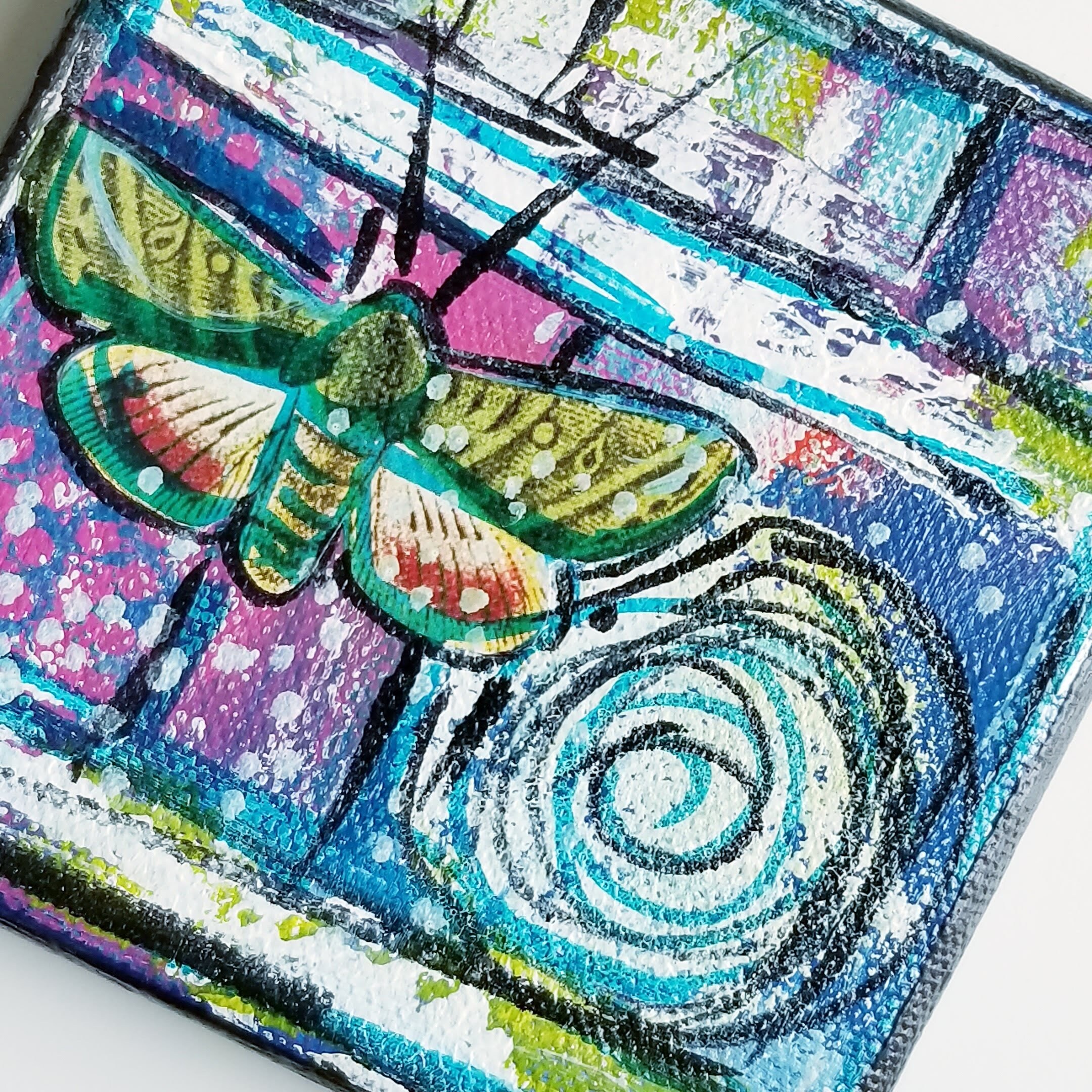 Mini Art Abstract Artwork- Green & Blue Butterfly- Colorful Artwork- Acrylic, Markers, Collage