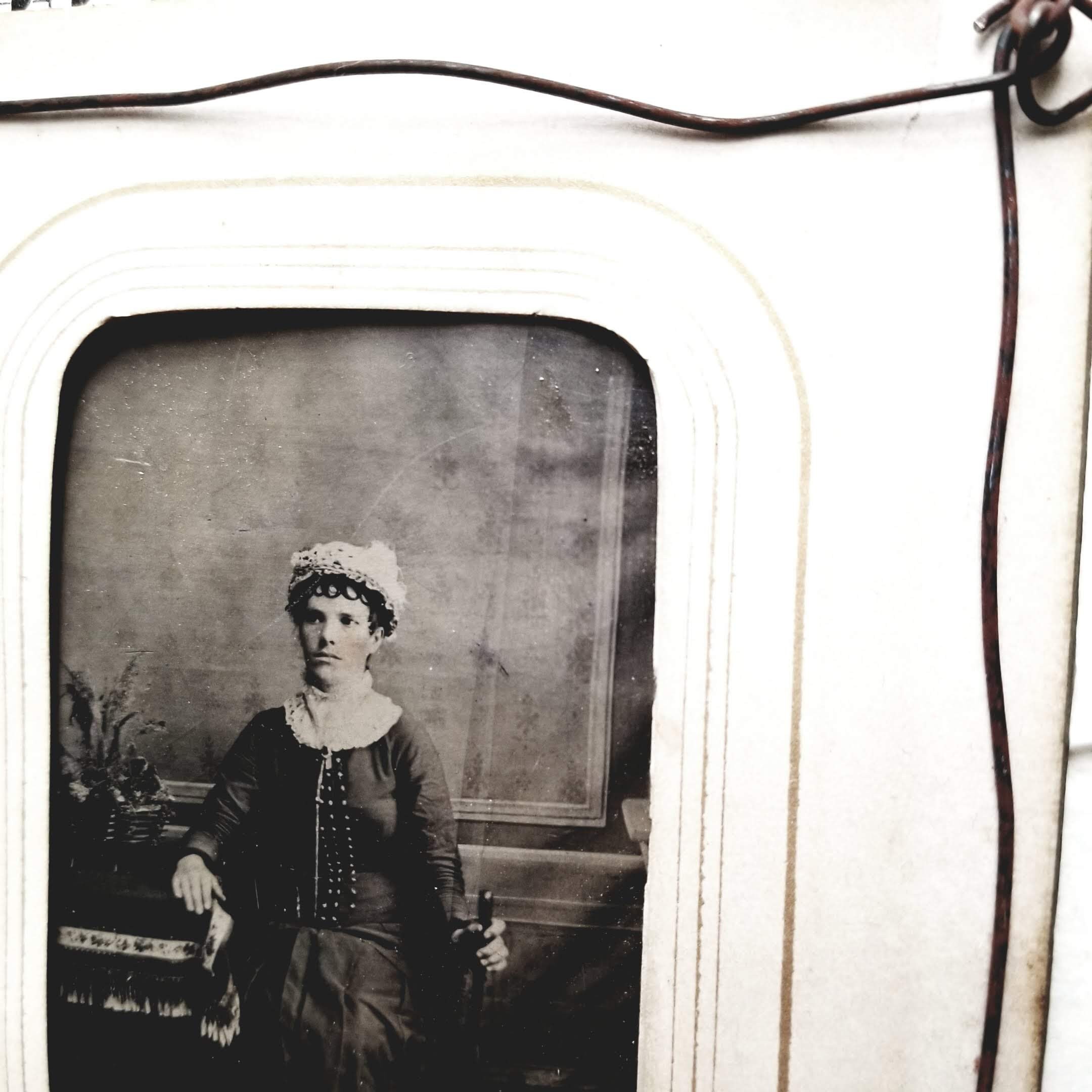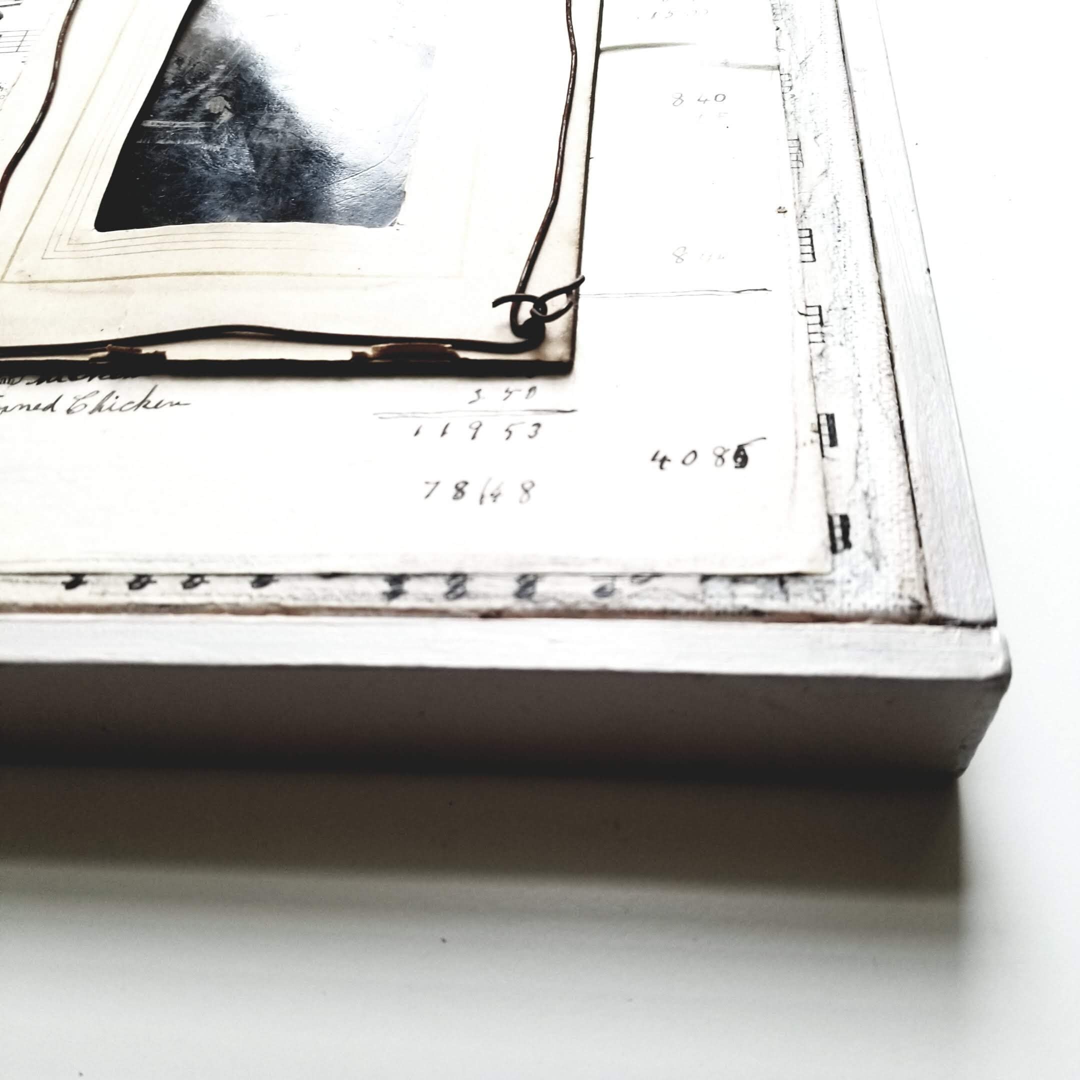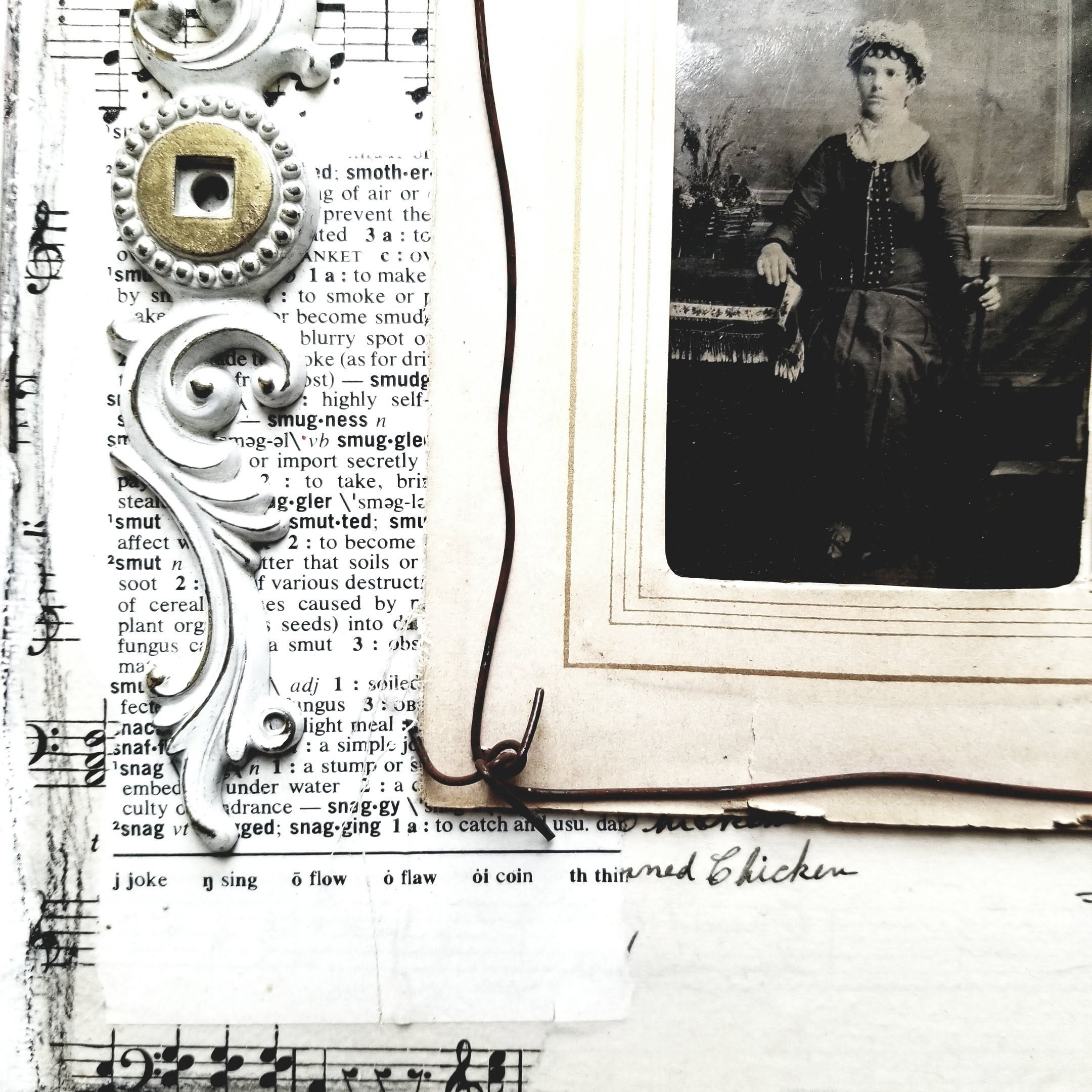 The Merry Widow Collaged Canvas, featuring the vintage tin type portrait, layers of music pages and papers, wire and metal embellishments.
