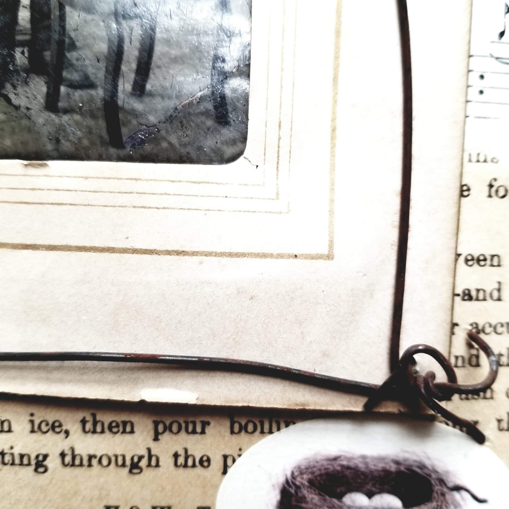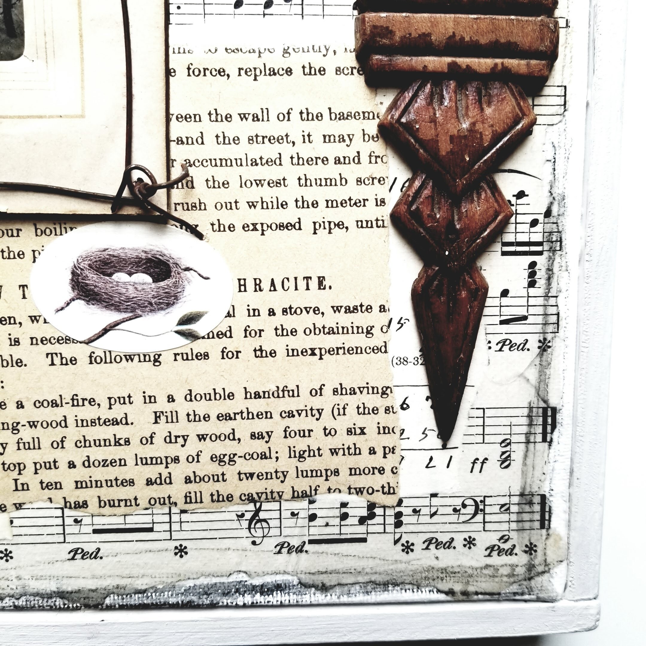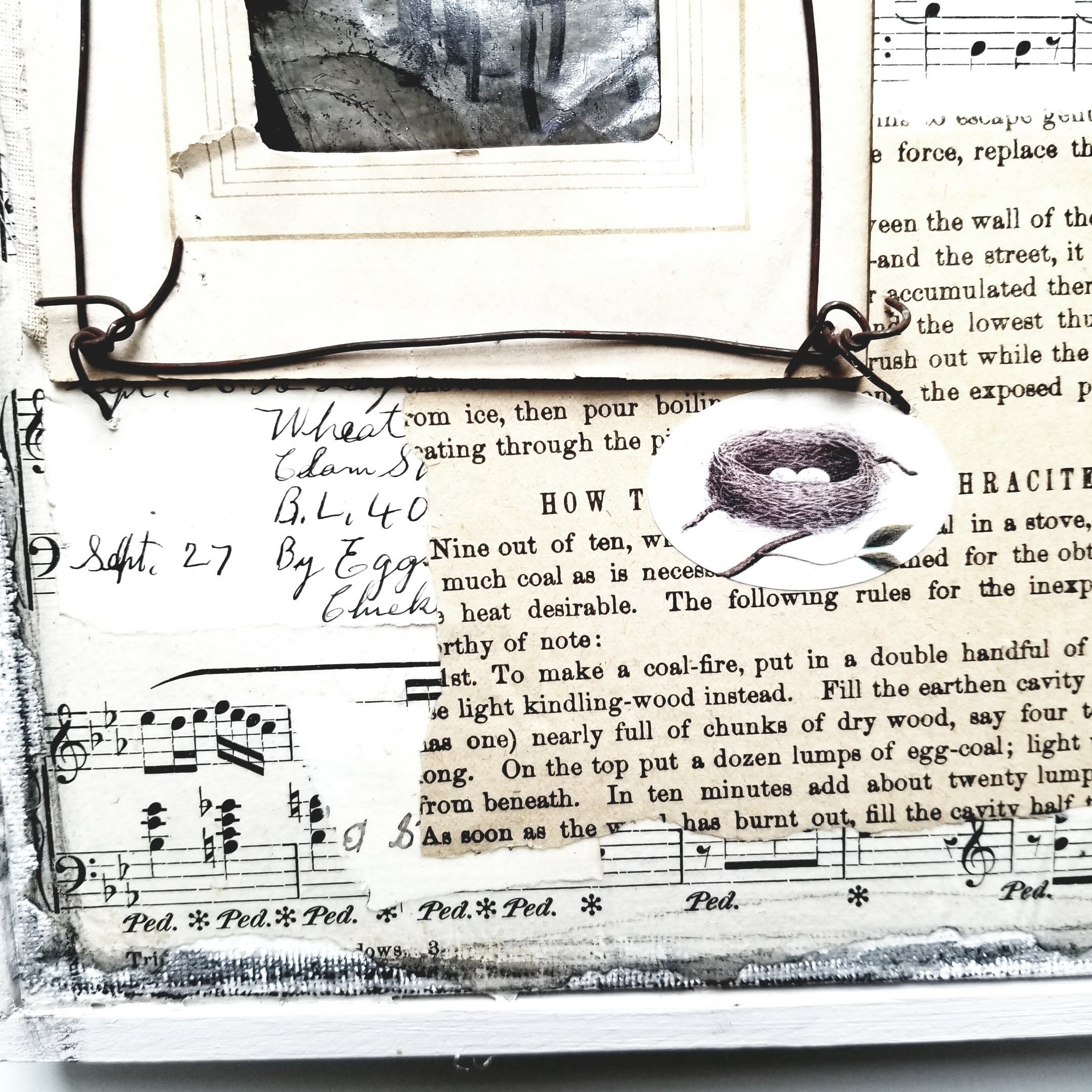 Collaged canvas featuring a real vintage tin type portrait, layers of vintage music sheets, papers and wire, wooden embellishments.