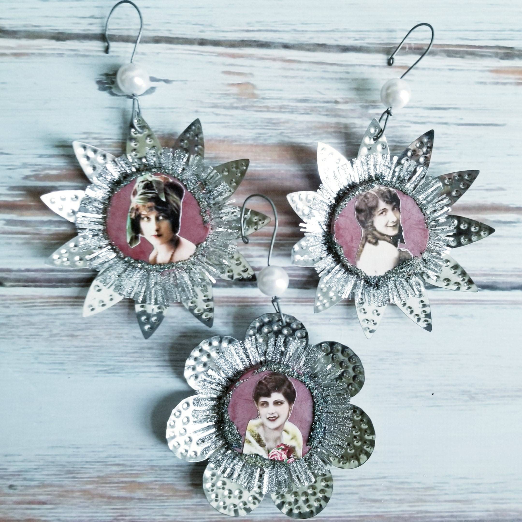 Handmade Christmas Ornaments created from vintage punched tin light reflectors and vintage images, glass glitter and tinsel trim.