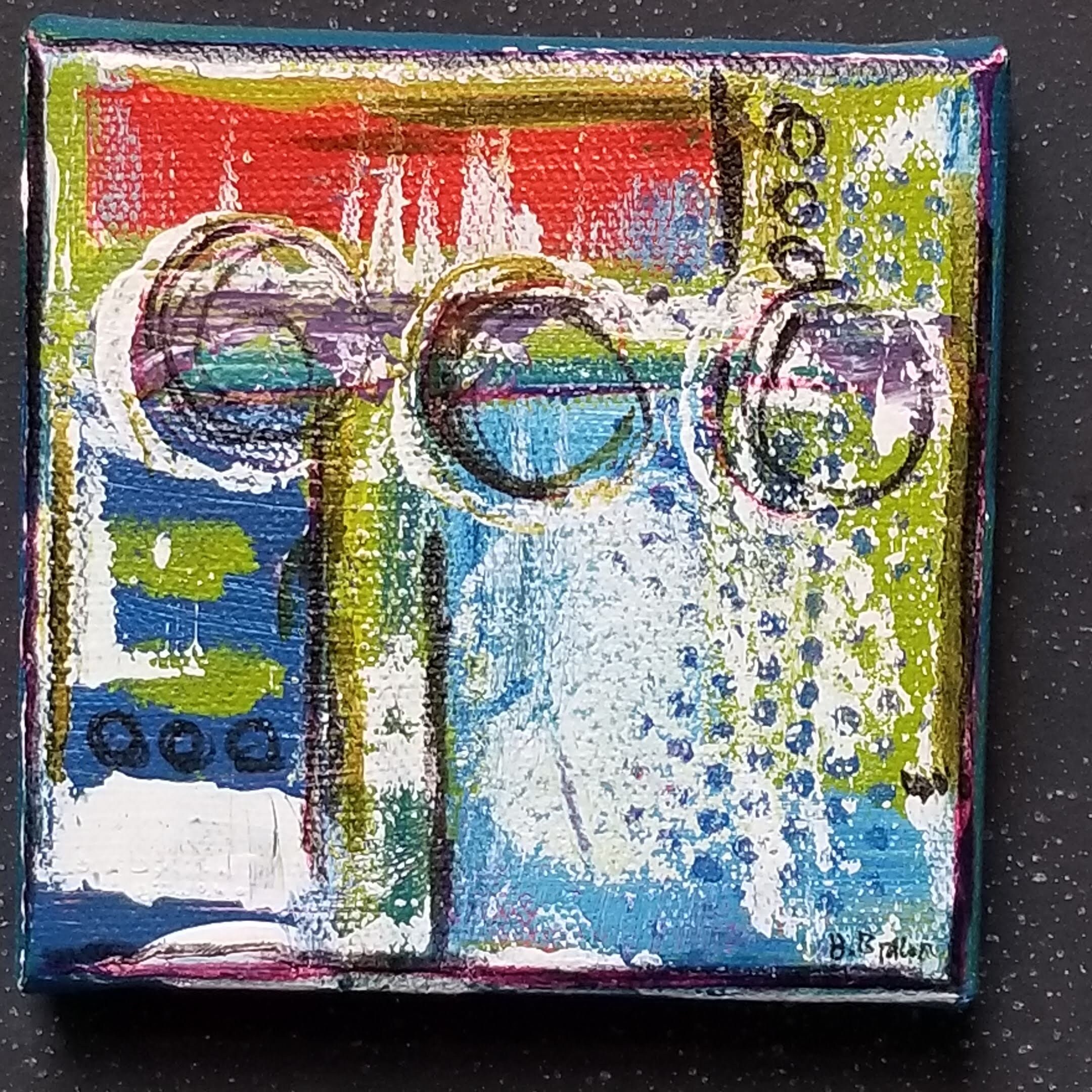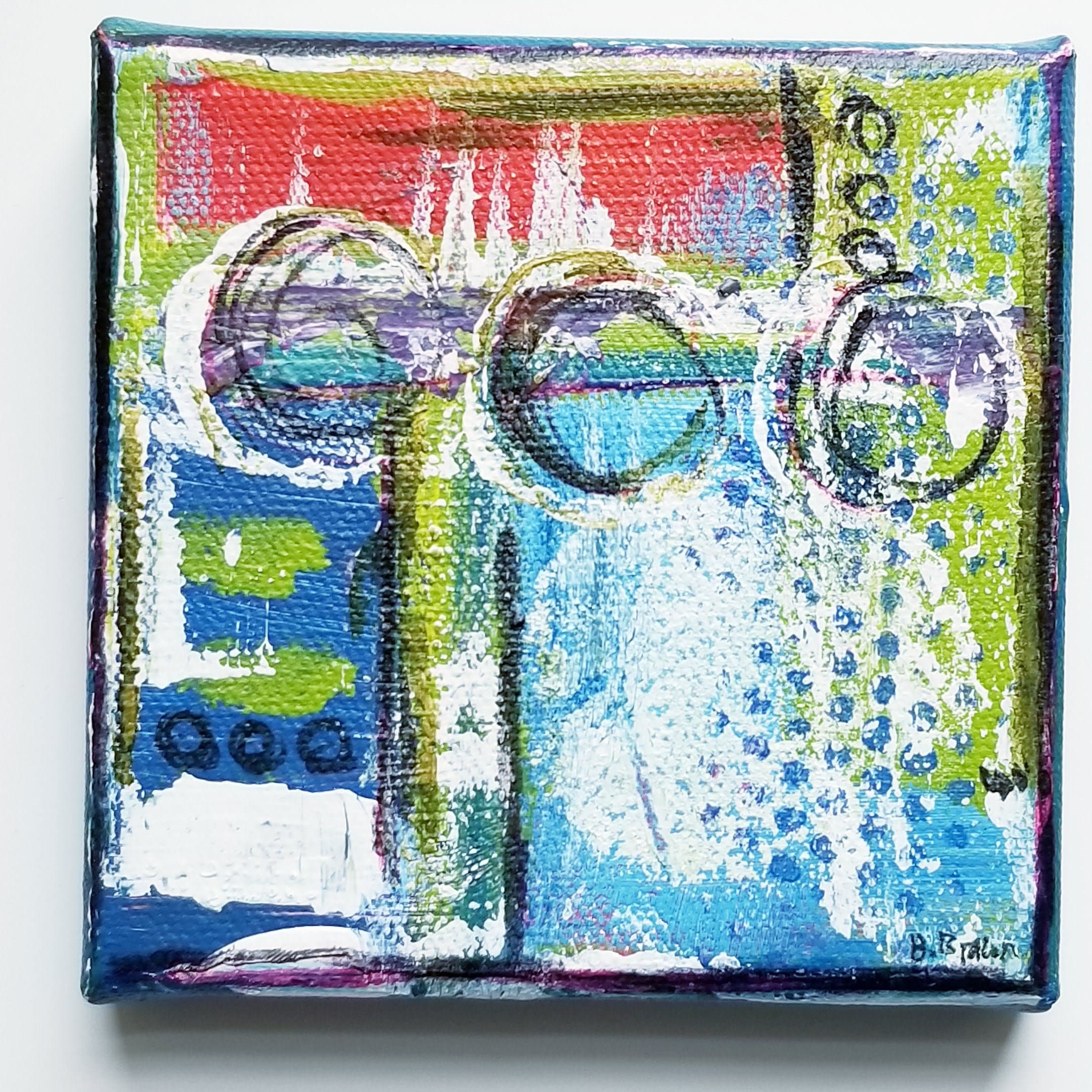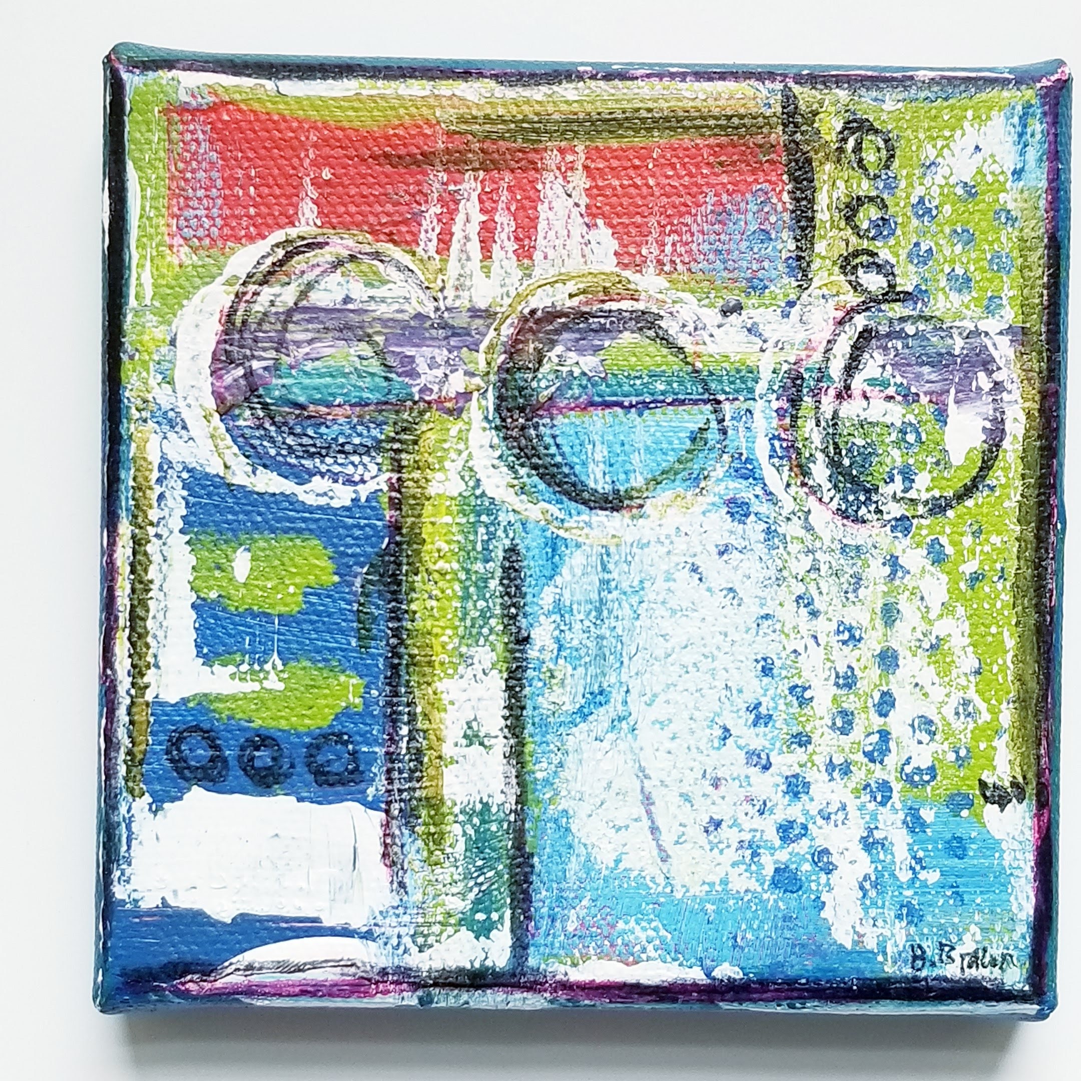 Bursts of colors and shapes come through this series of paintings I did recently, collaged images are interspersed with markers and acrylic paints. A small canvas (4 inches x 4 inches), they're a perfect size to nestle in with your other artwork or as a piece of interest in a nook or cranny.