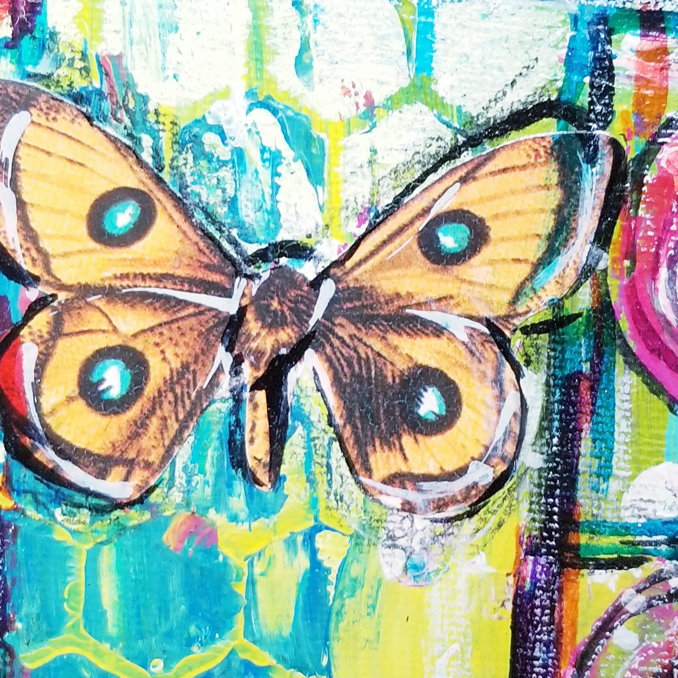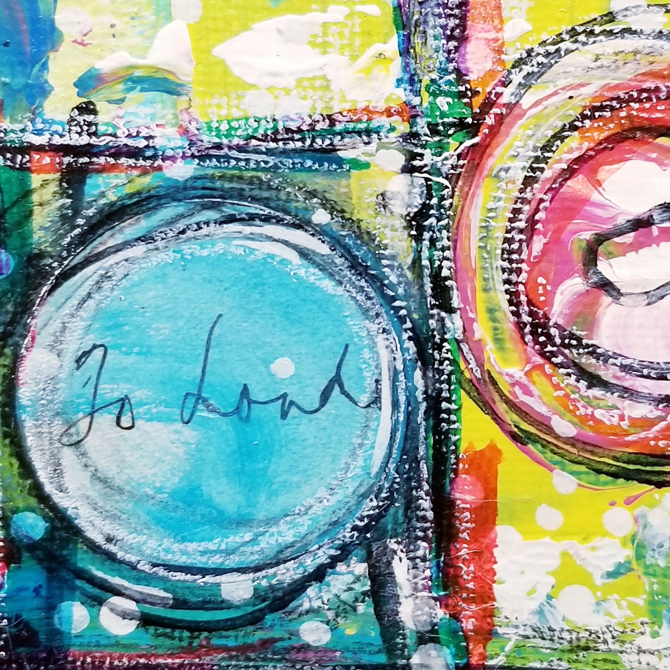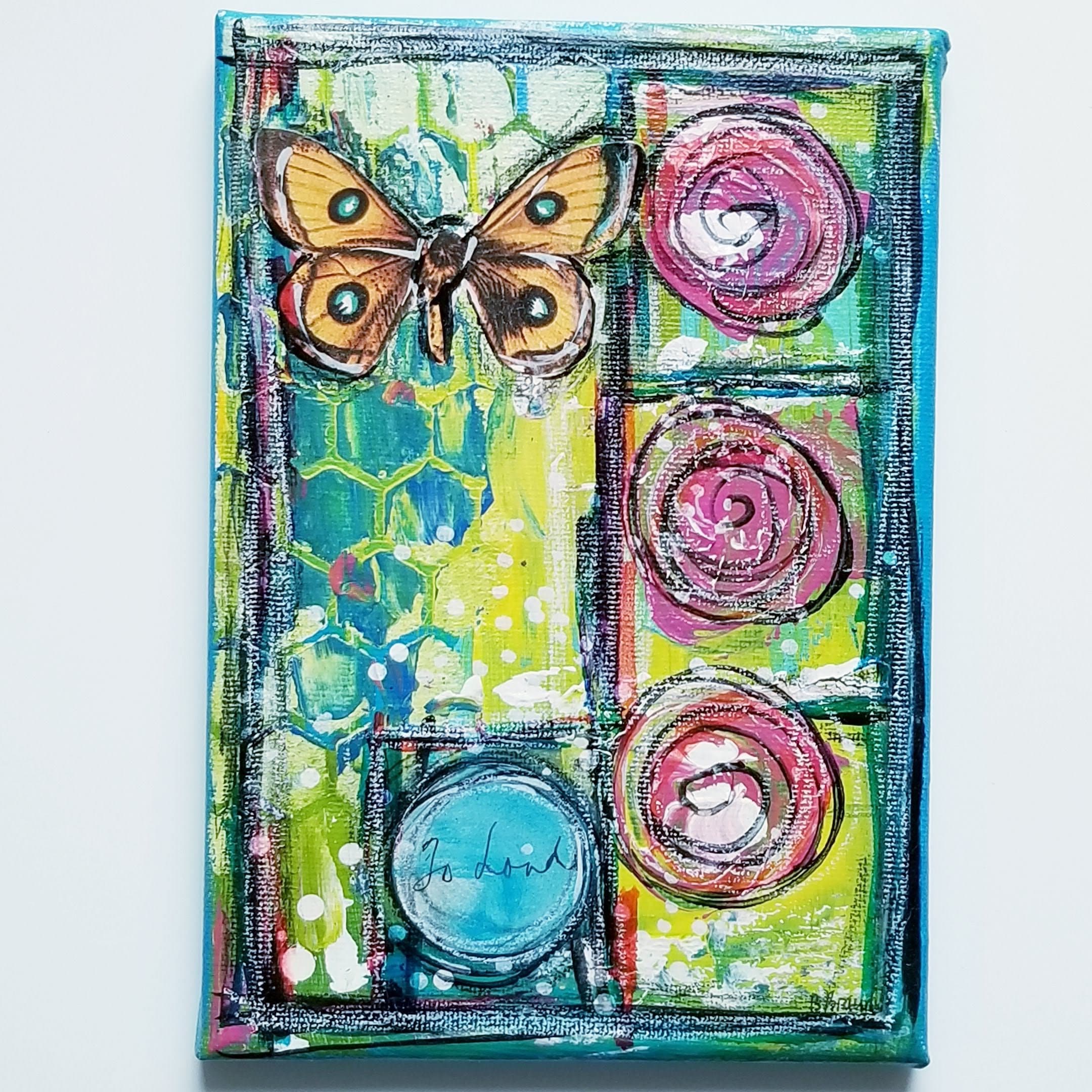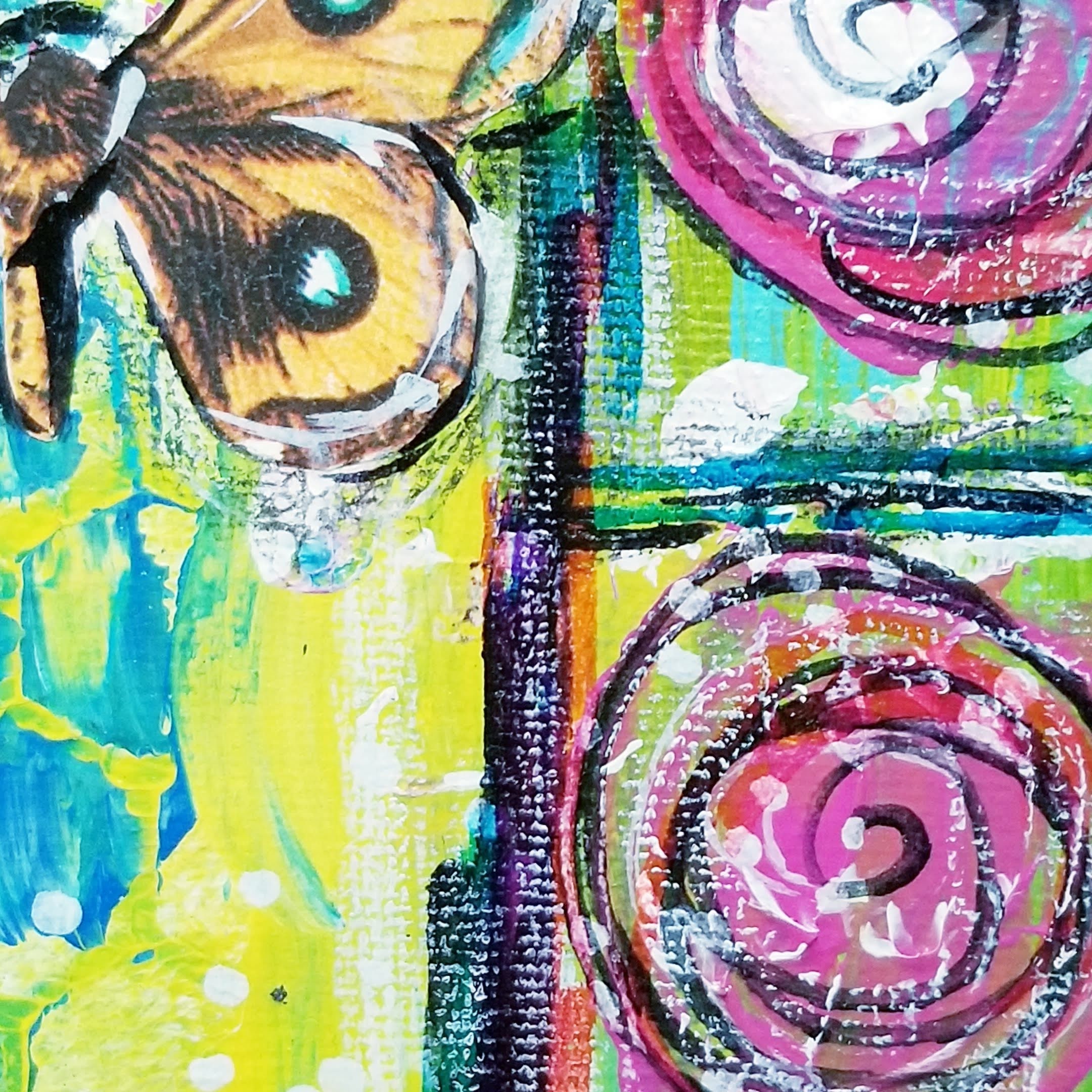 Bursts of colors and shapes come through this series of paintings I did recently, collaged images are interspersed with markers and acrylic paints. A small canvas at 5 x 7 inches, they're a perfect size to nestle in with your other artwork or as a piece of interest in a nook or cranny.