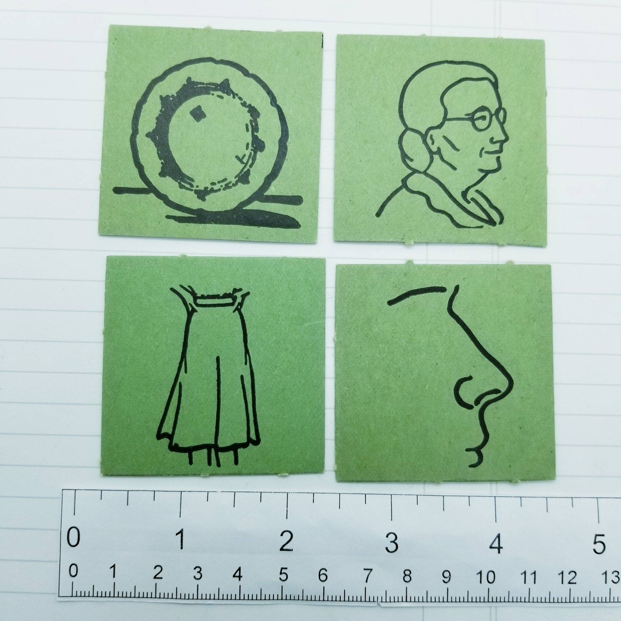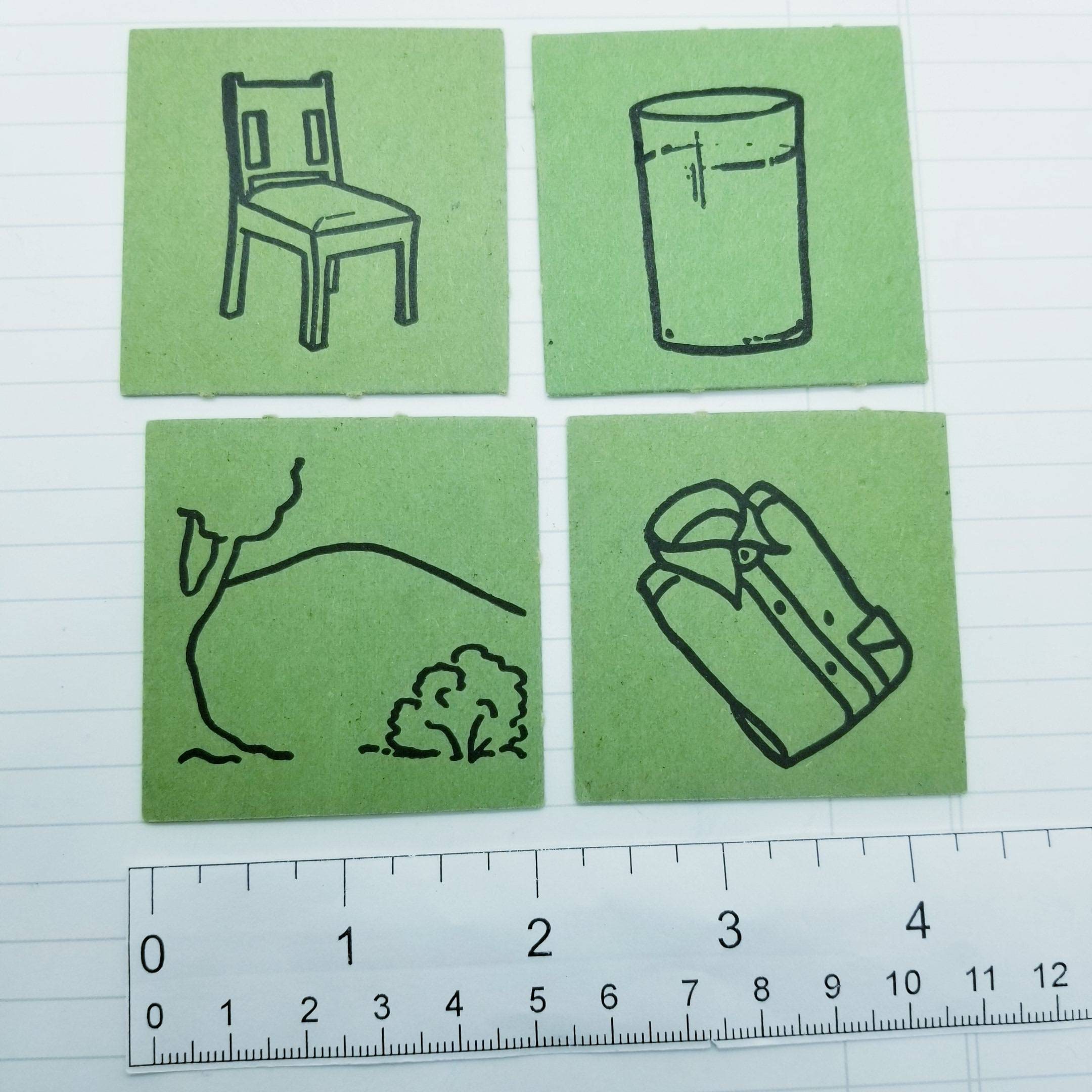 Card are a little over 2 inches square, 4 in a pack, feature line drawings of items.