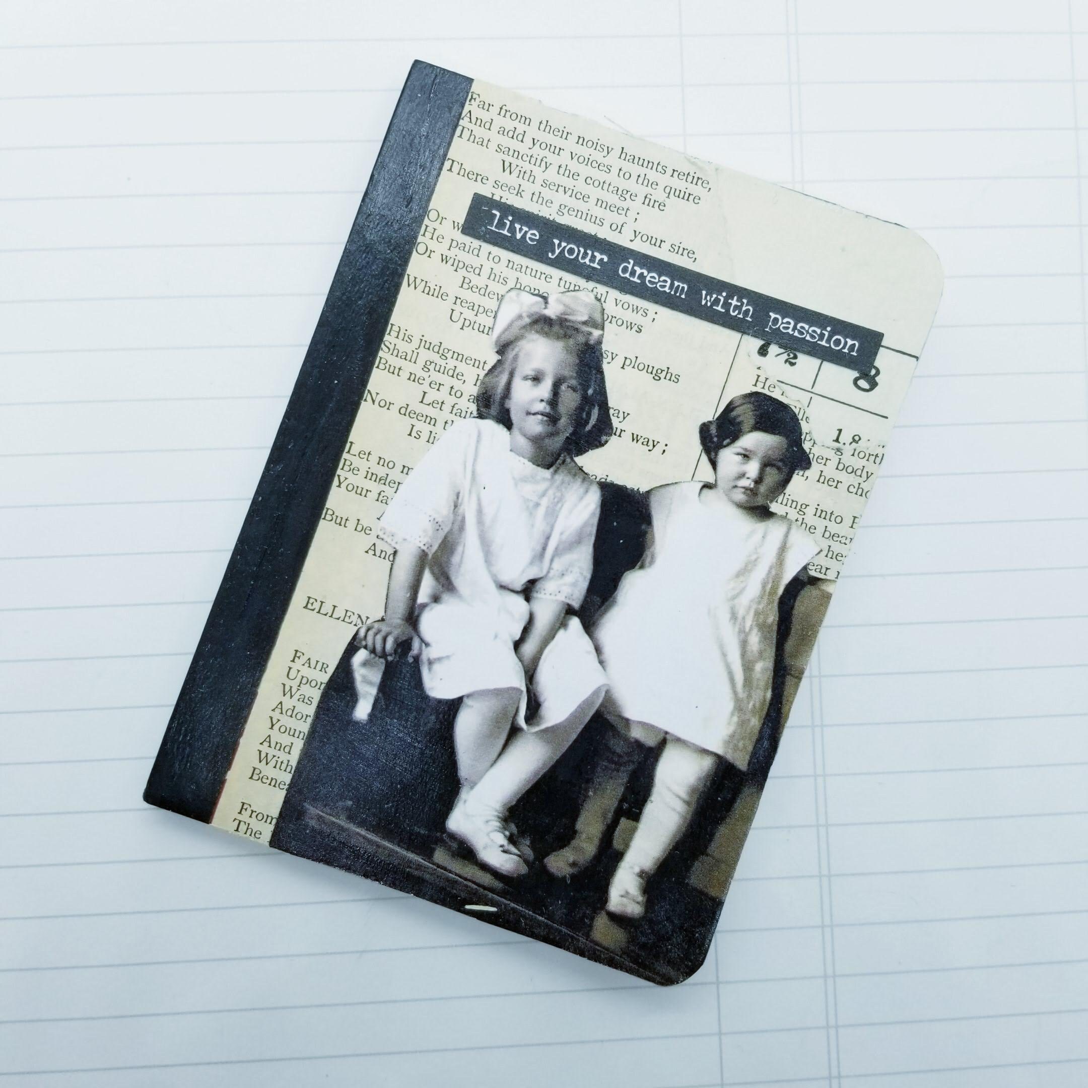 Collaged mini composition notebook- 150+ lined pages, 4 1/2 inches by 3 1/4 inches. Decorated with vintage ephemera, layers of images and text. Use for your diary, to do lists, record your thoughts and ideas.