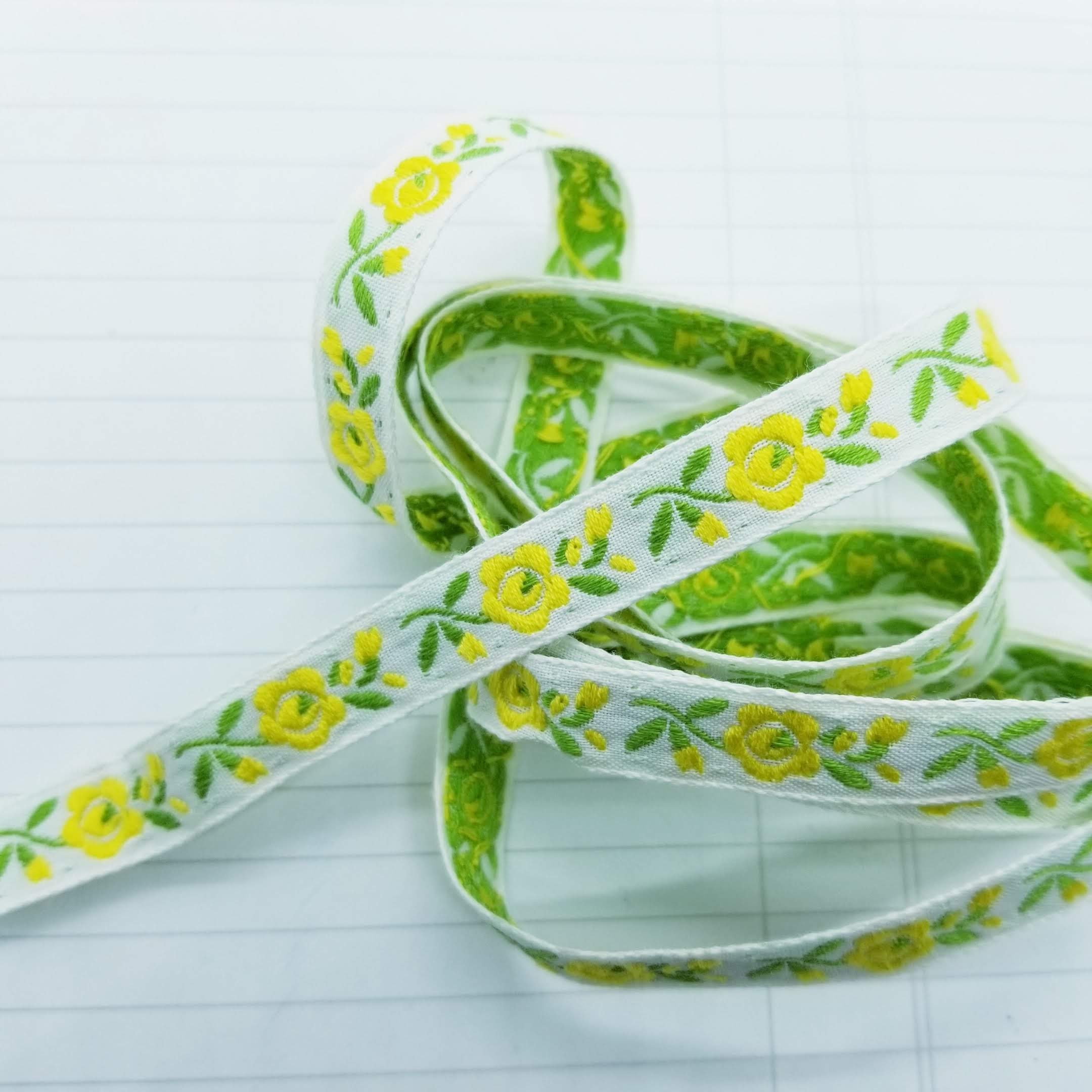 10 mm wide 1 yard length (3 feet) embroidered yellow flowers with green leaves.