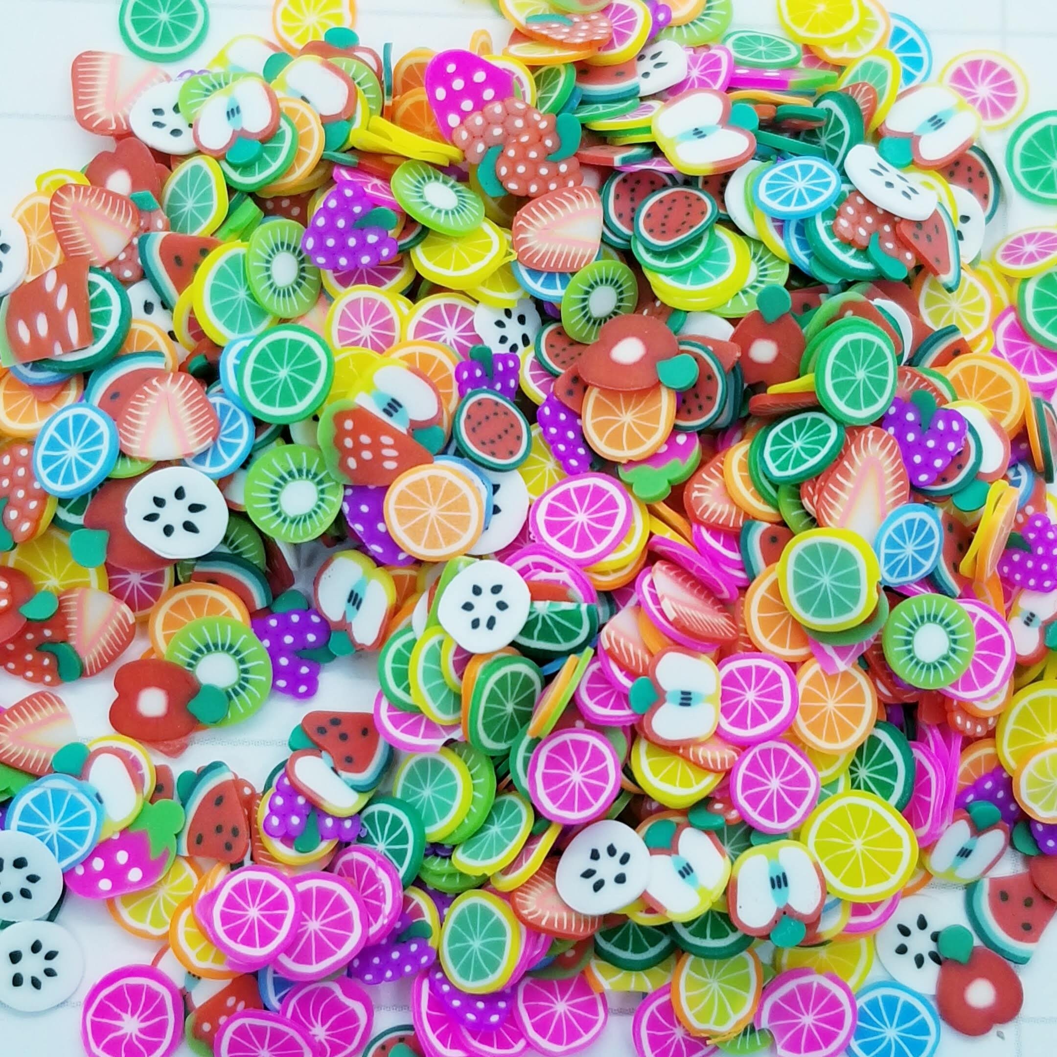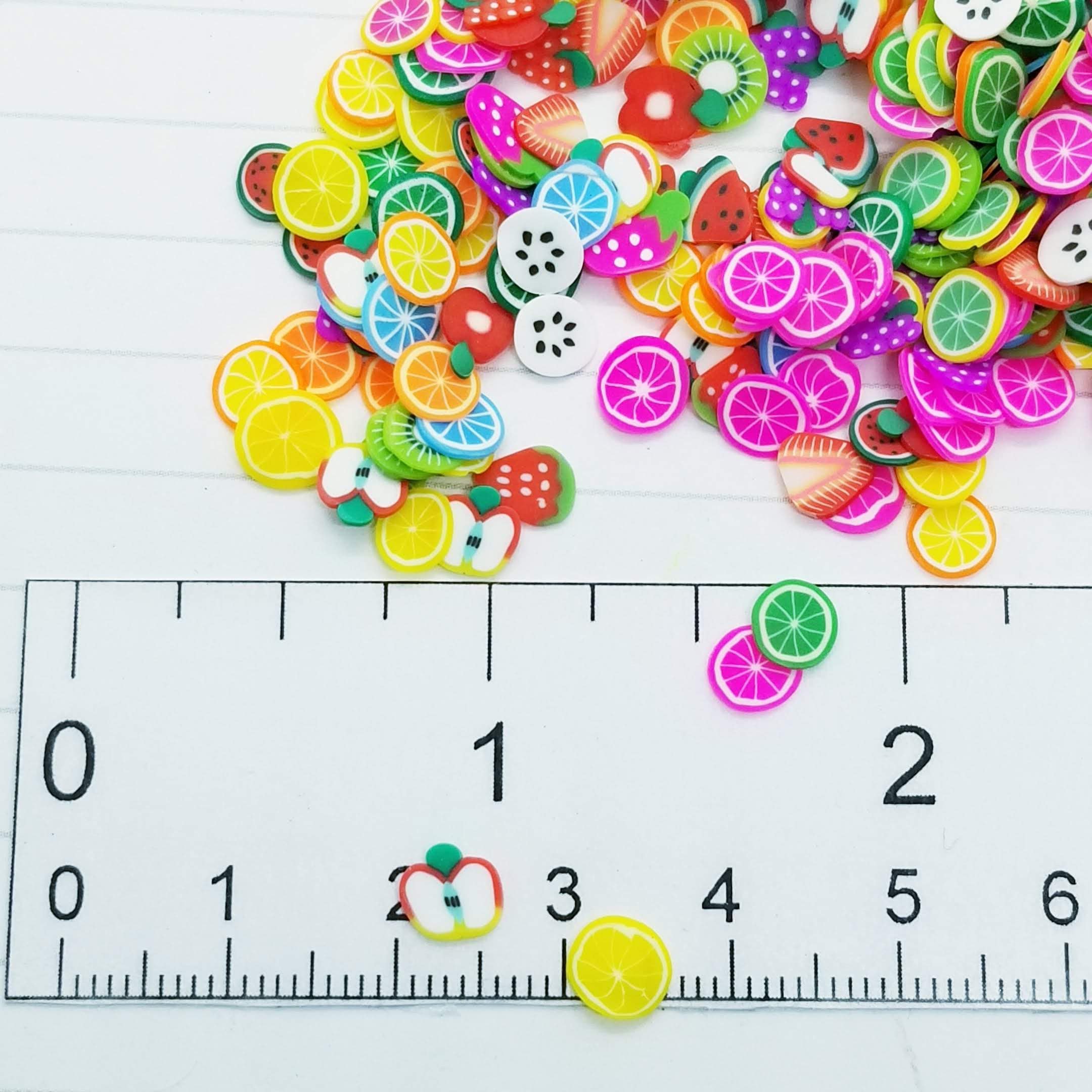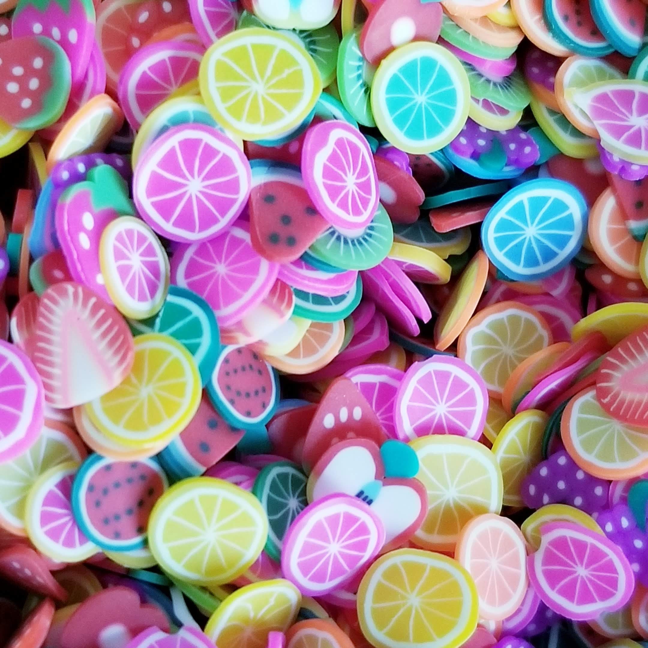 Tiny fruit slices of polymer clay bits.