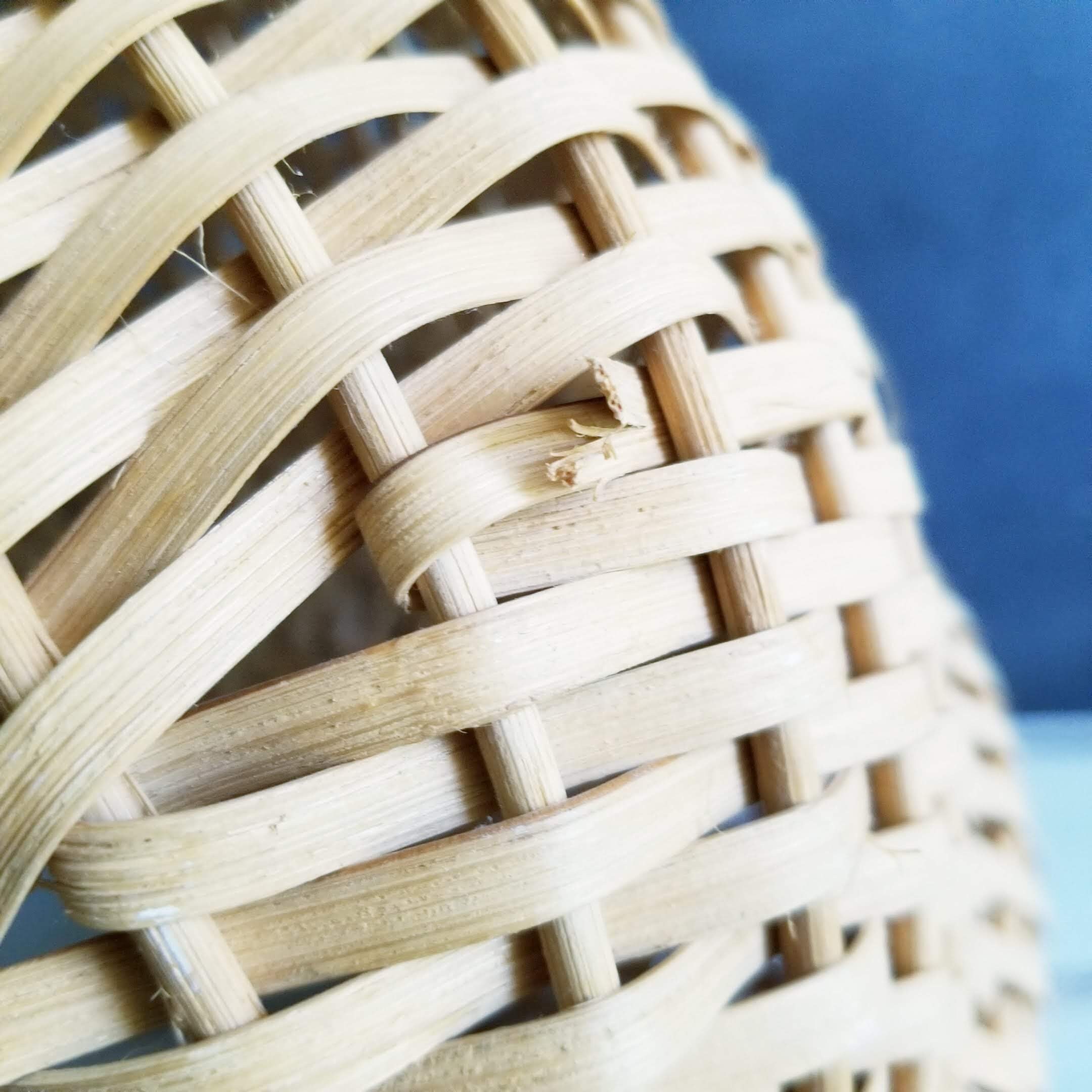 Cute woven buttocks basket in a light color, 12 inches across, 12 inches in depth with an overall height of 10 inches with the handle.