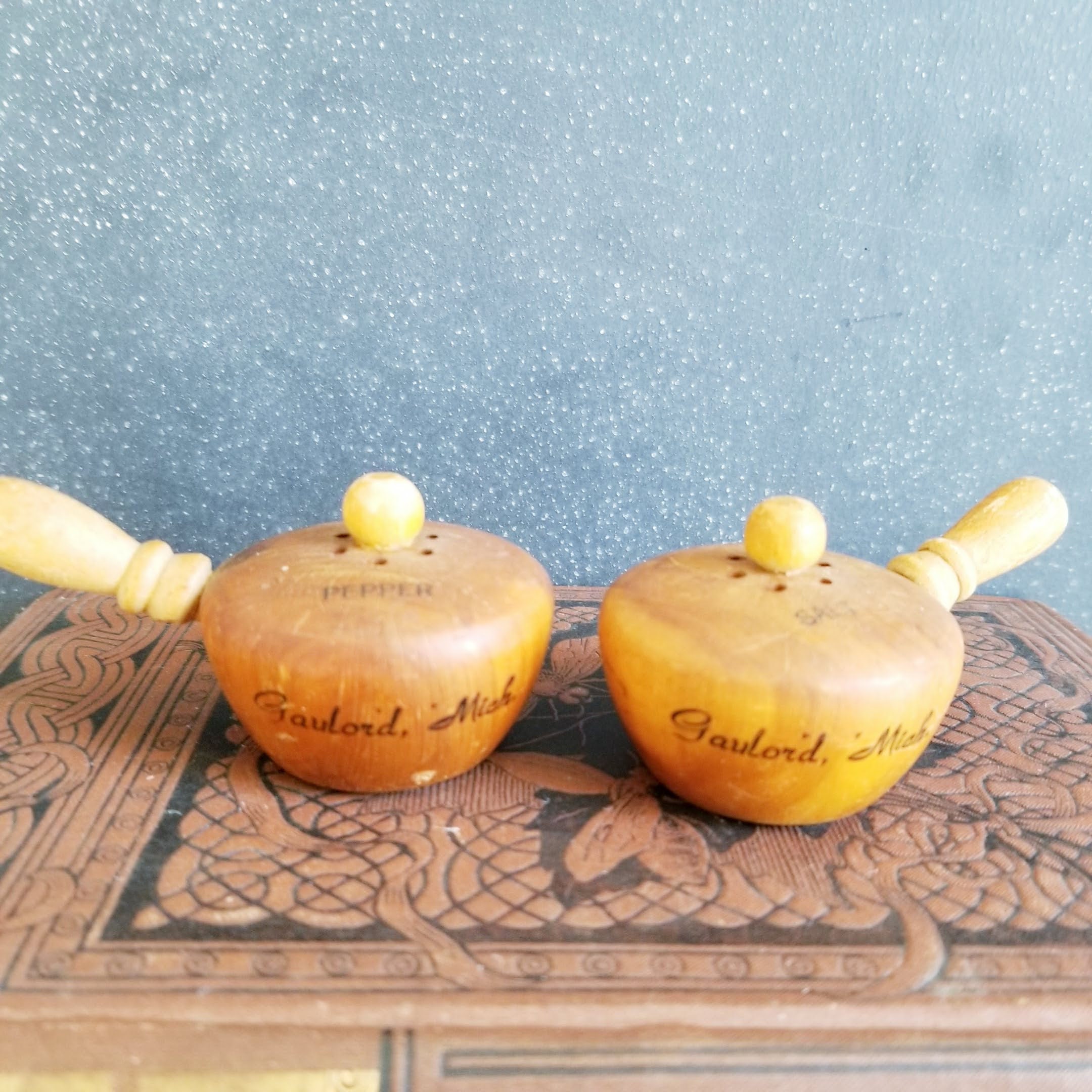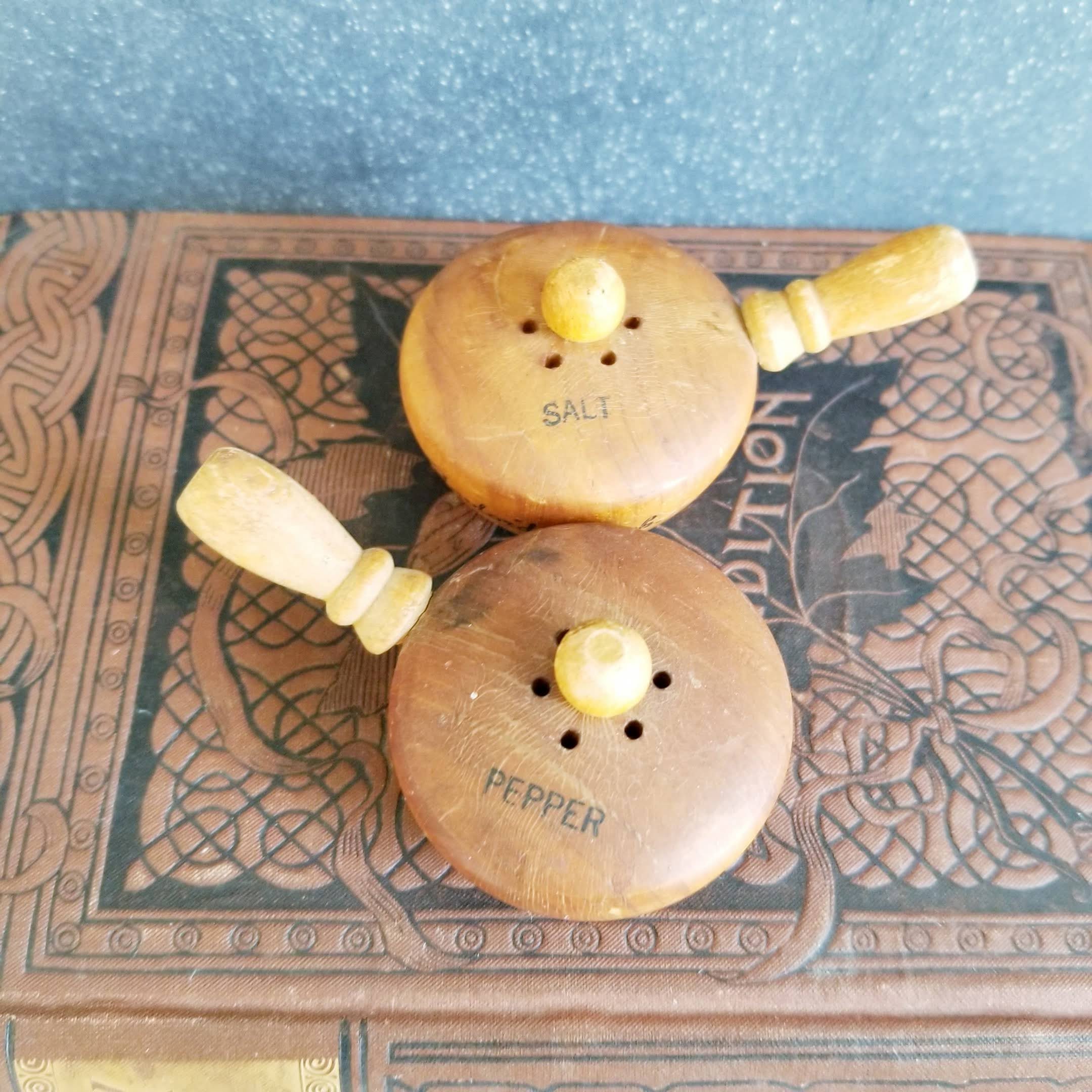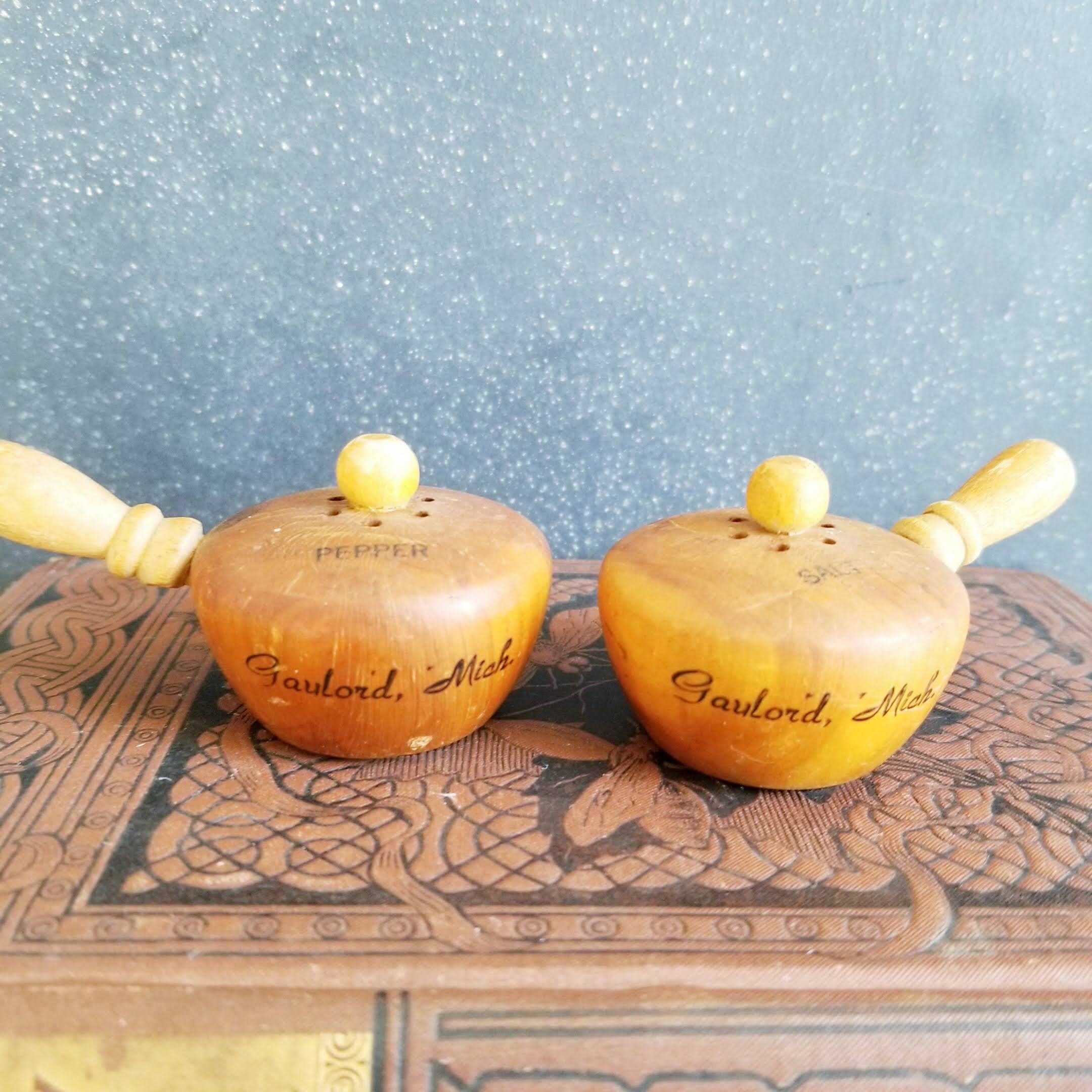 Little wooden pots salt & pepper shakers, souvenir from Gaylord, Michigan.