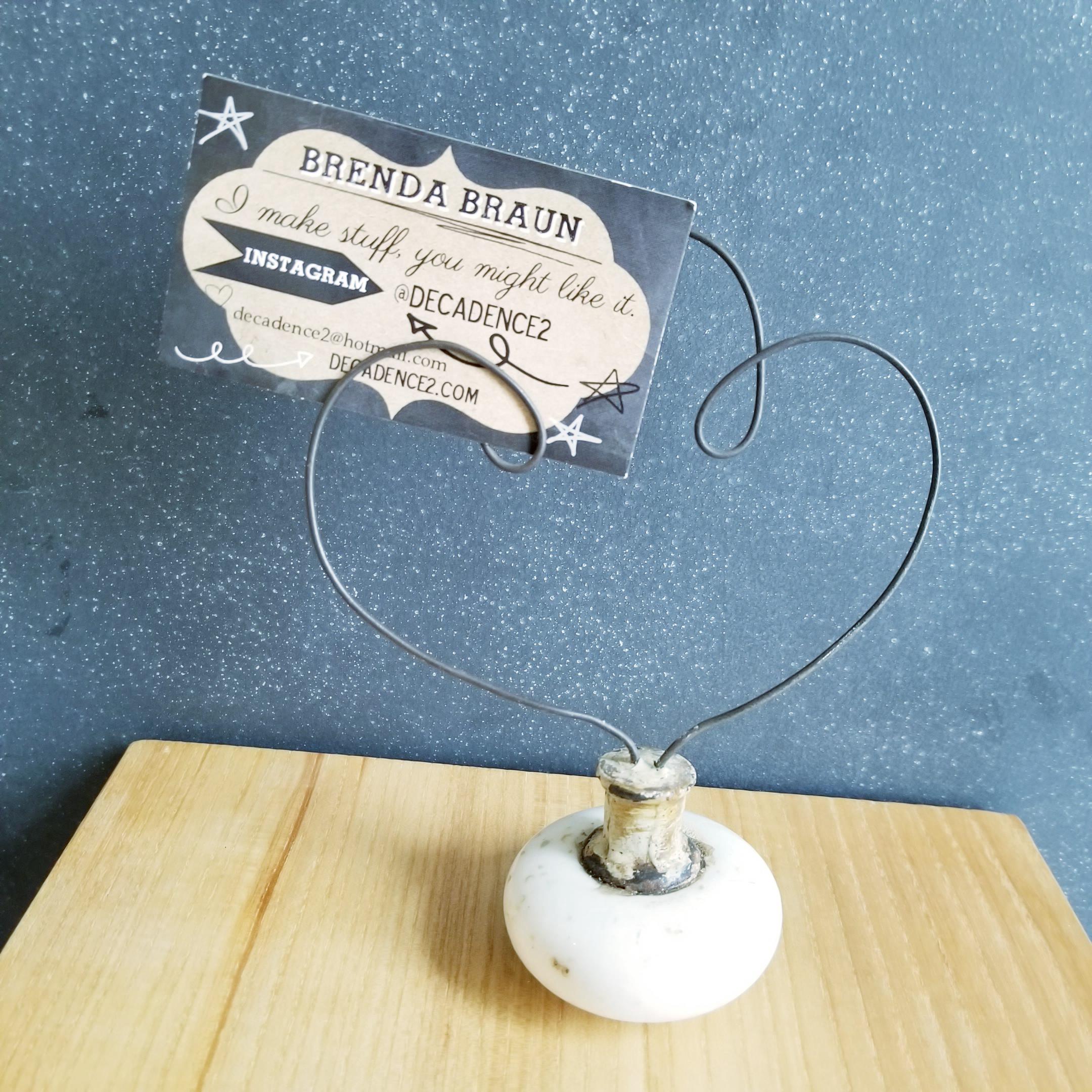 Created from a vintage door knob and sturdy wire, display your favorite photos or artwork tucked in the spiral of the wire. Use at your wedding for table numbers or to display loved ones photos.