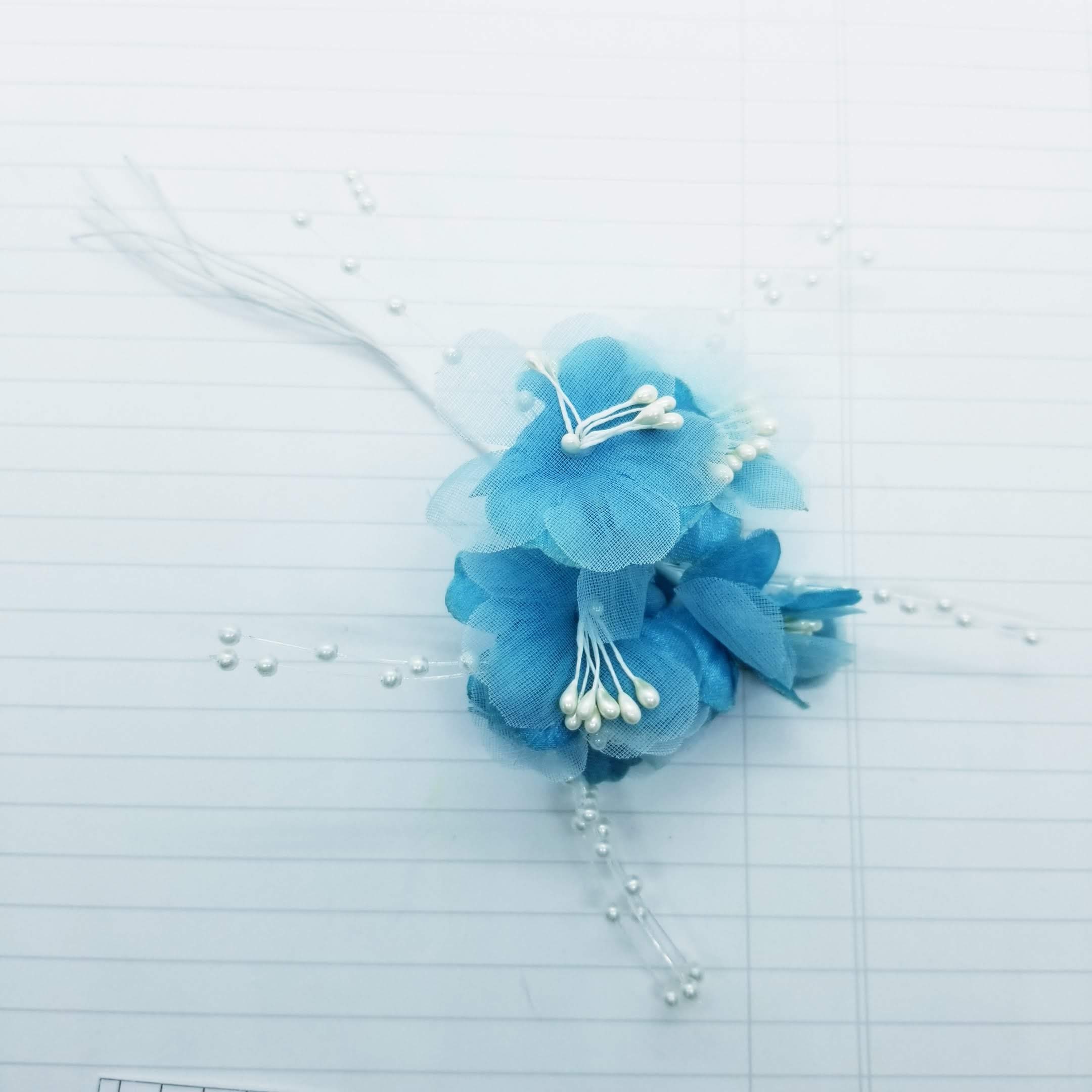 3 sprays of 6 light teal blue green satin flowers with pearl sprays flowers.
