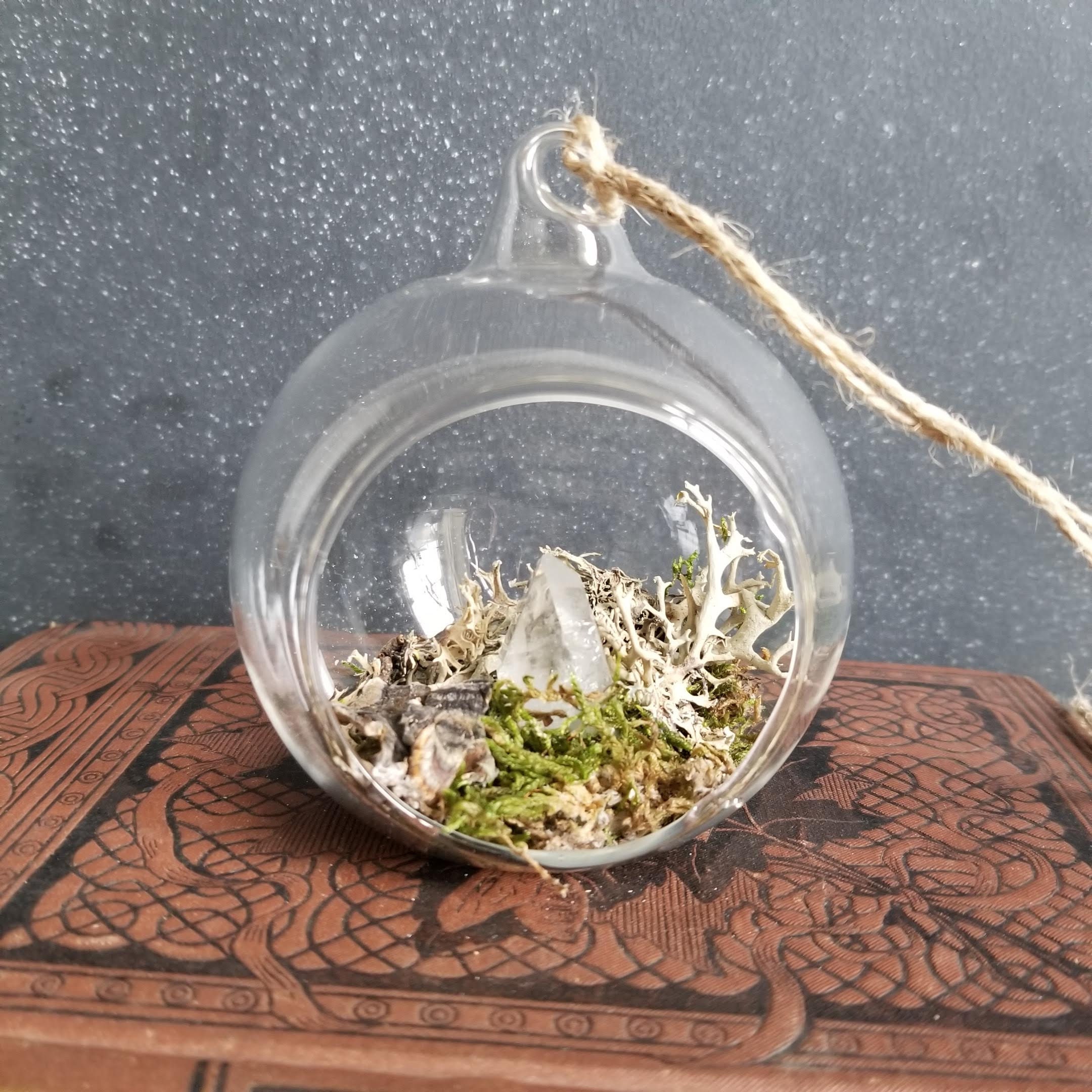 Woodsy hanging glass globe, tucked inside the globe is a mound of dried moss, clear quartz crystal point and dried treed fungi. You can suspend the globe from the long jute ribbon supplied, or take off the cord and place the globe amongst your books and forestcore collections.