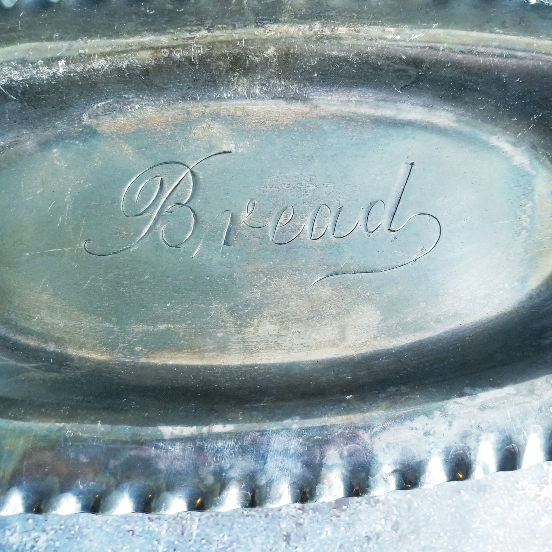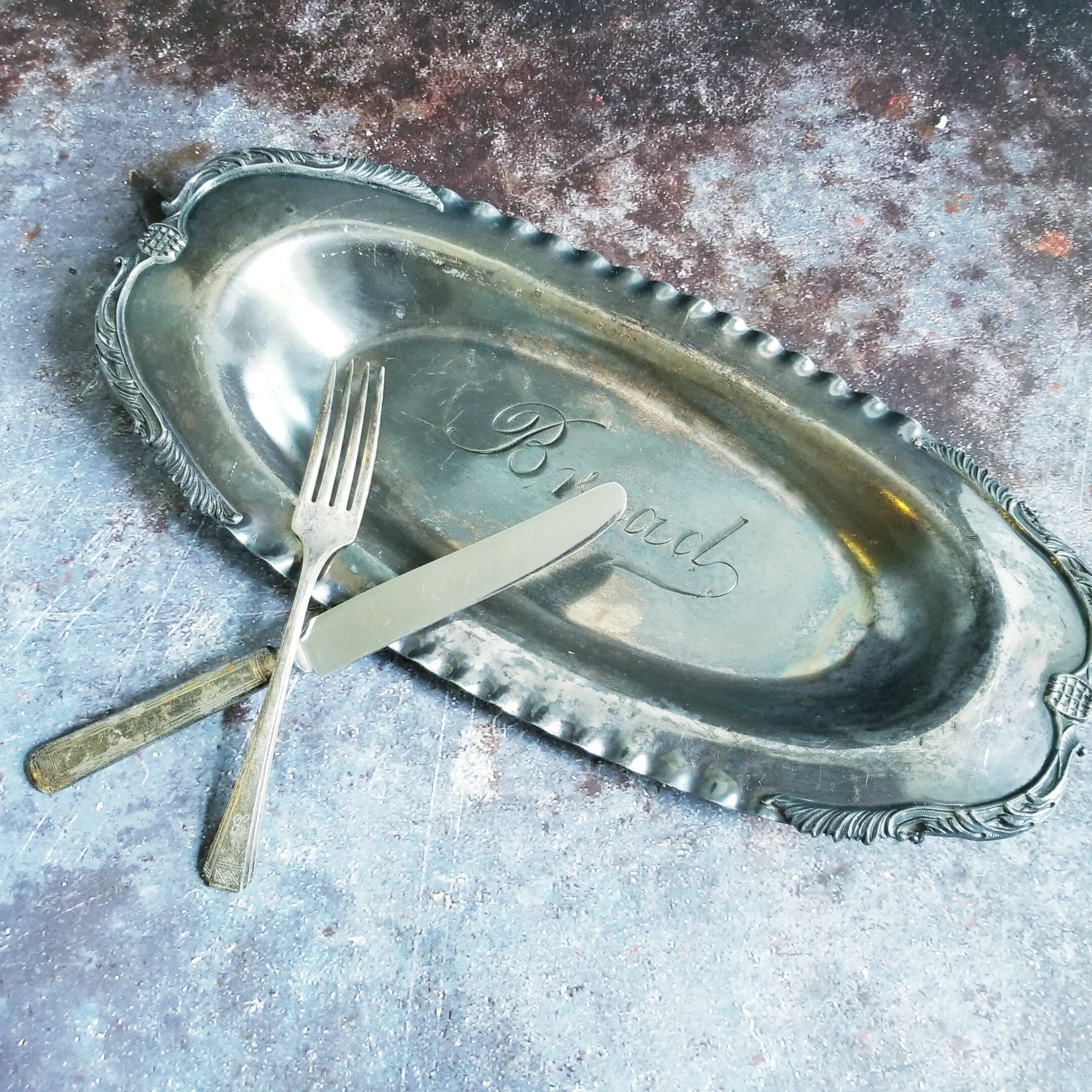 Vintage Silverplated ornate engraved bread platter. 14 inches long with BREAD embossed in the middle. Perfect for your food blog prop or special occasion.