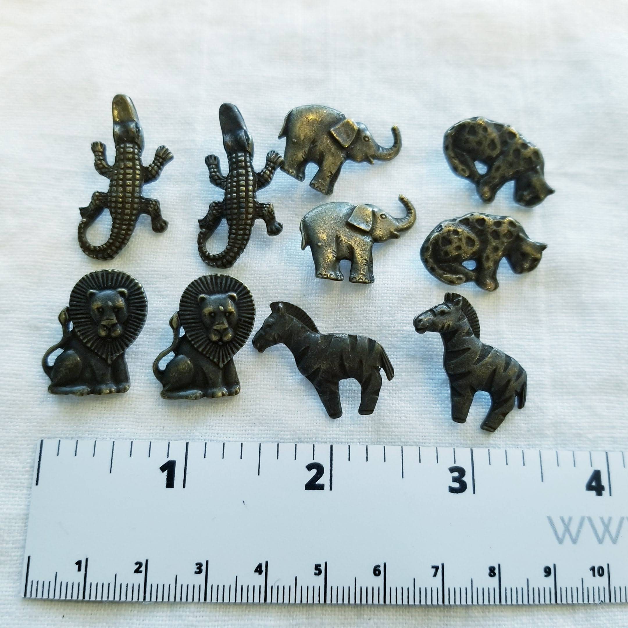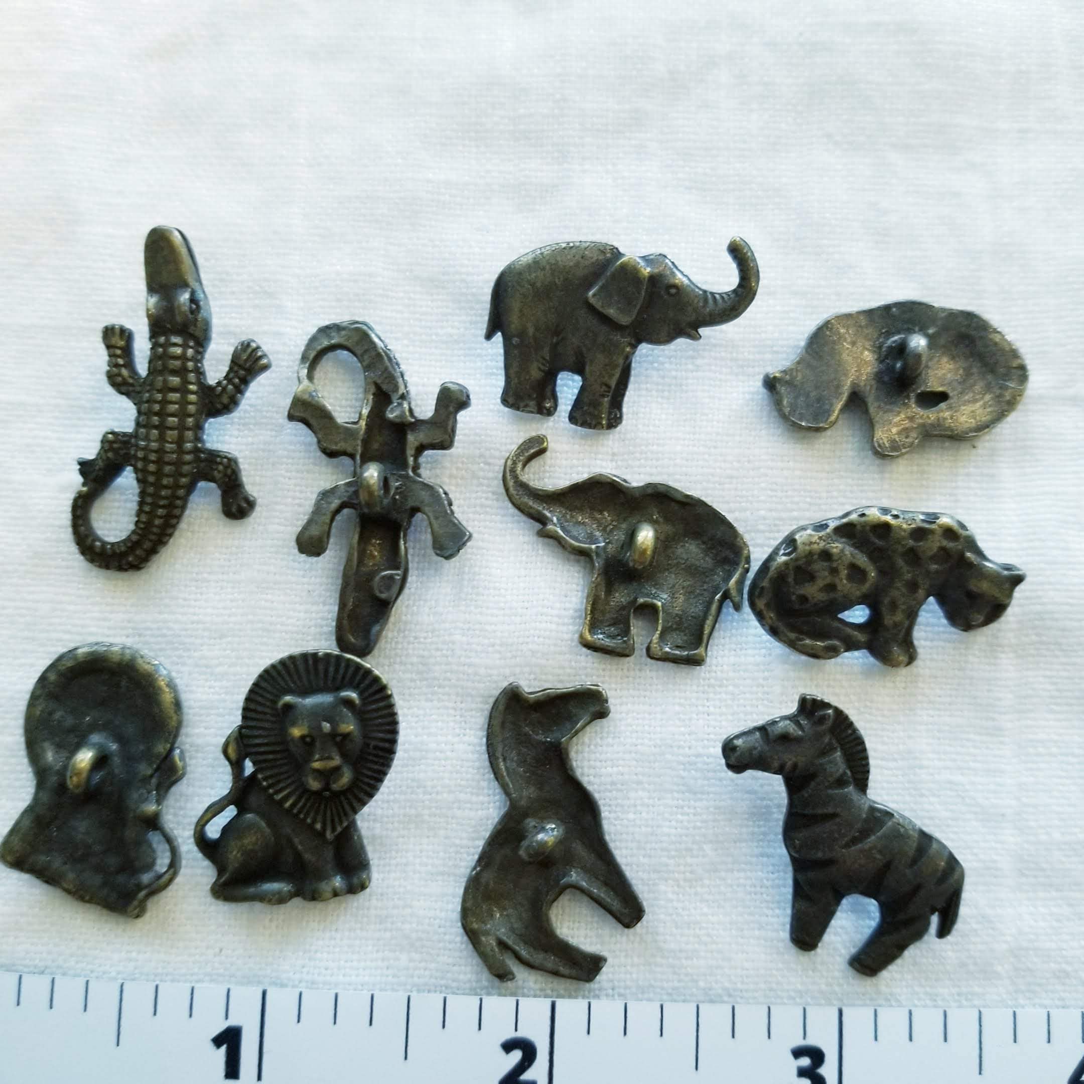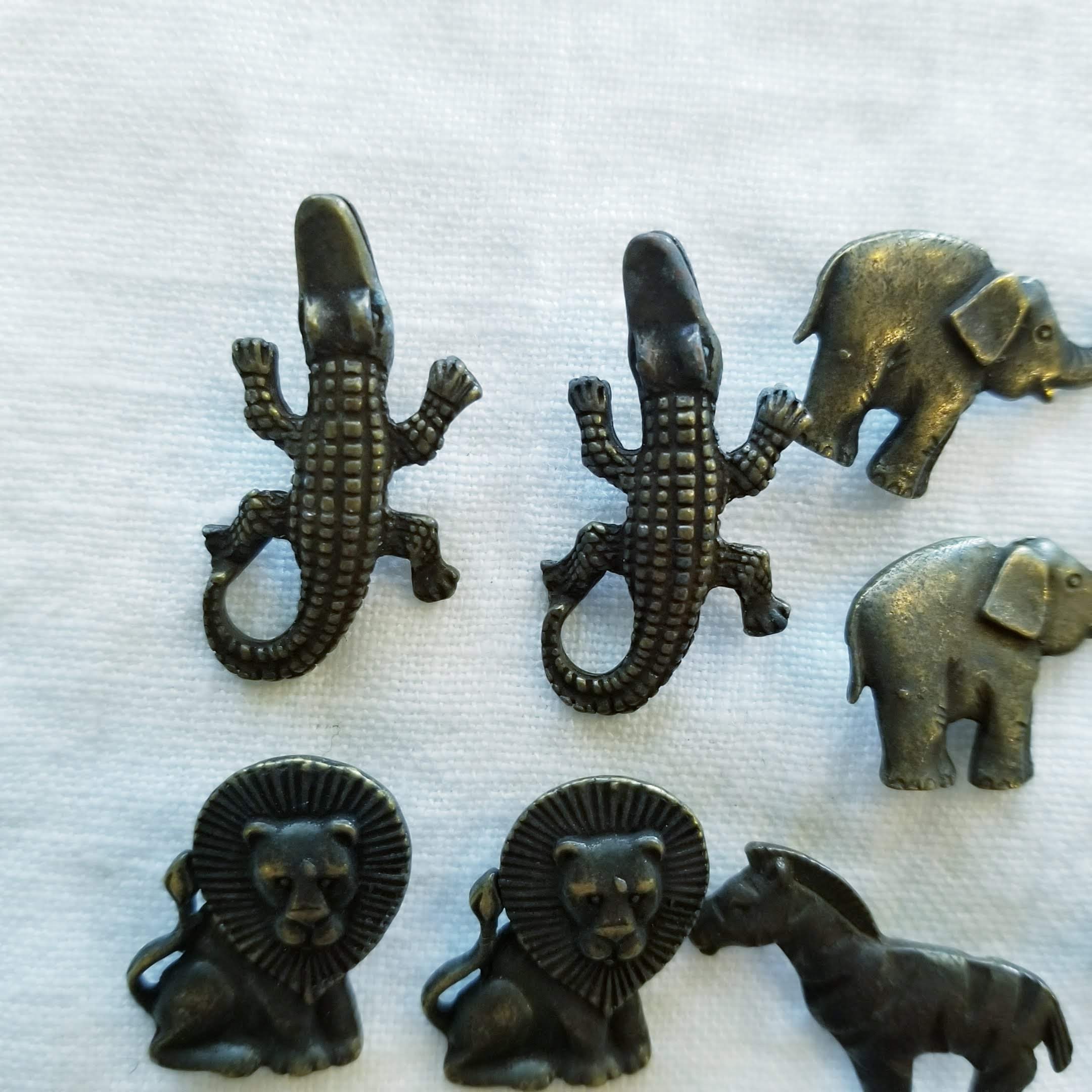 10 vintage animal buttons, bronze buttons, leopard, zebra, gator, lion, elephant buttons.