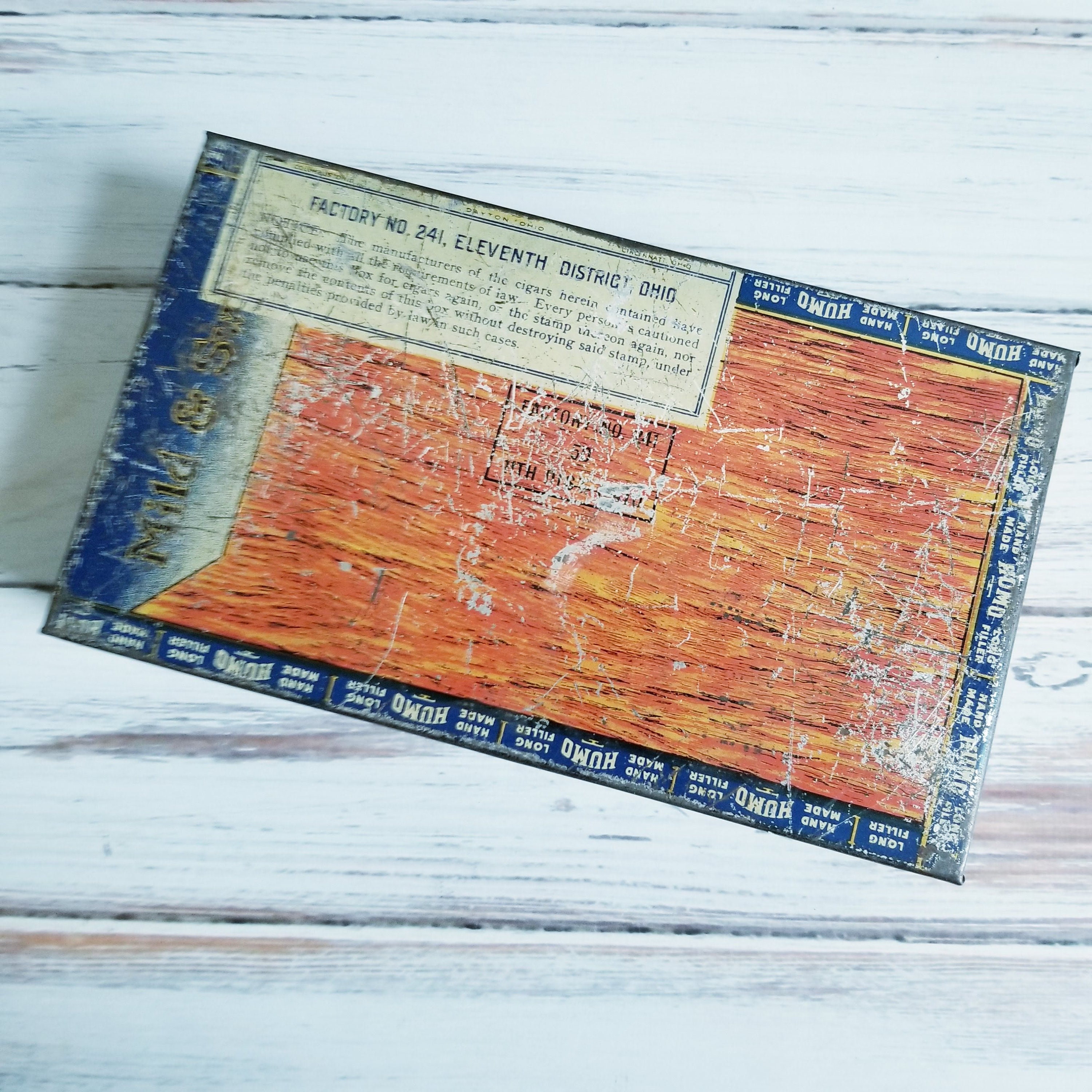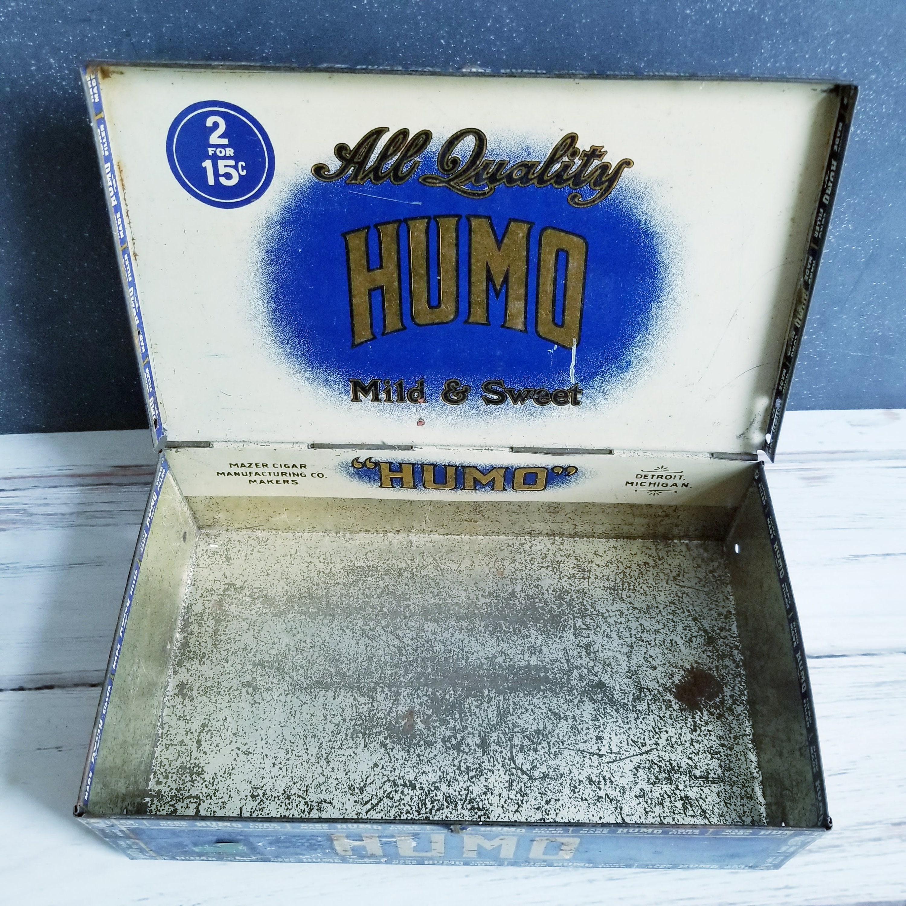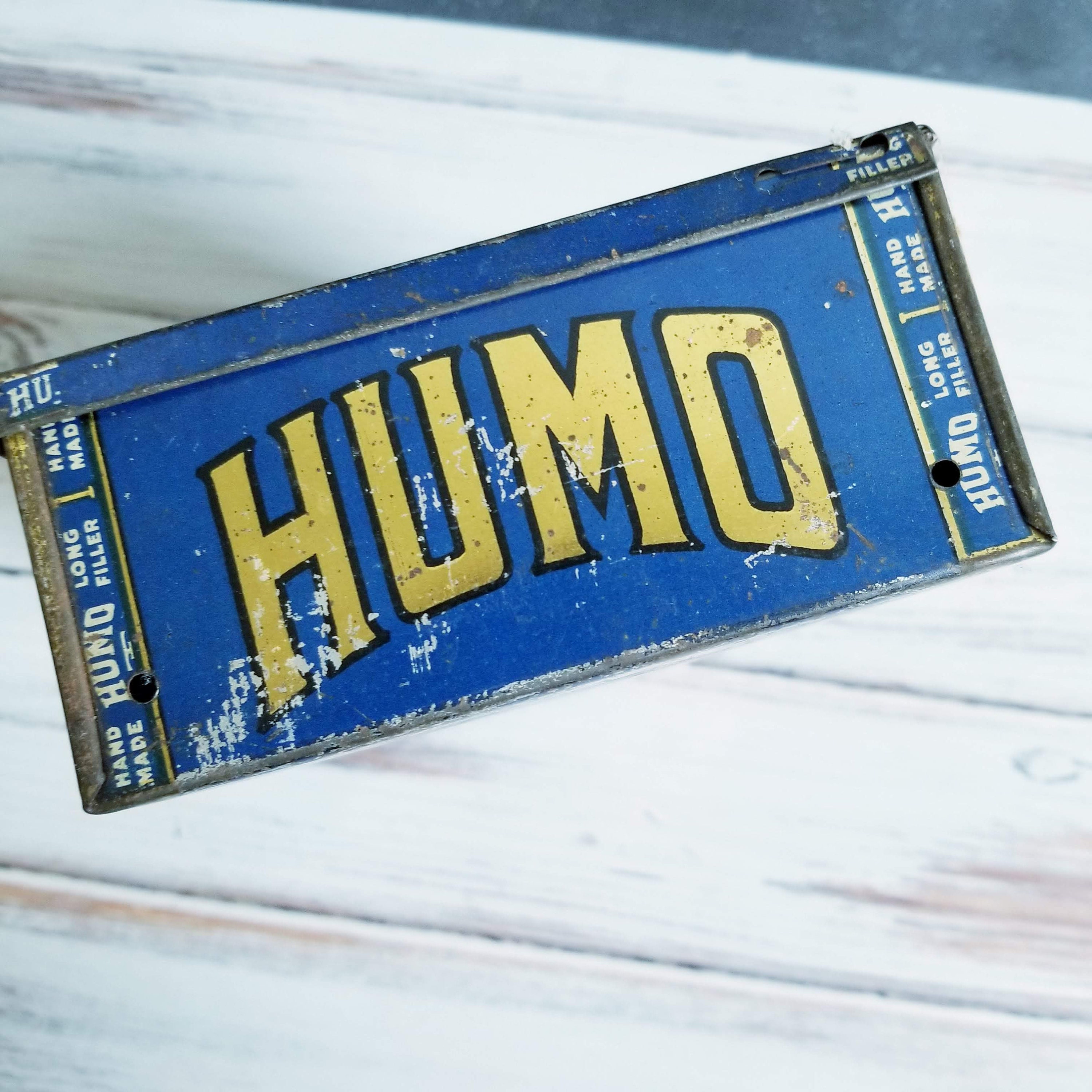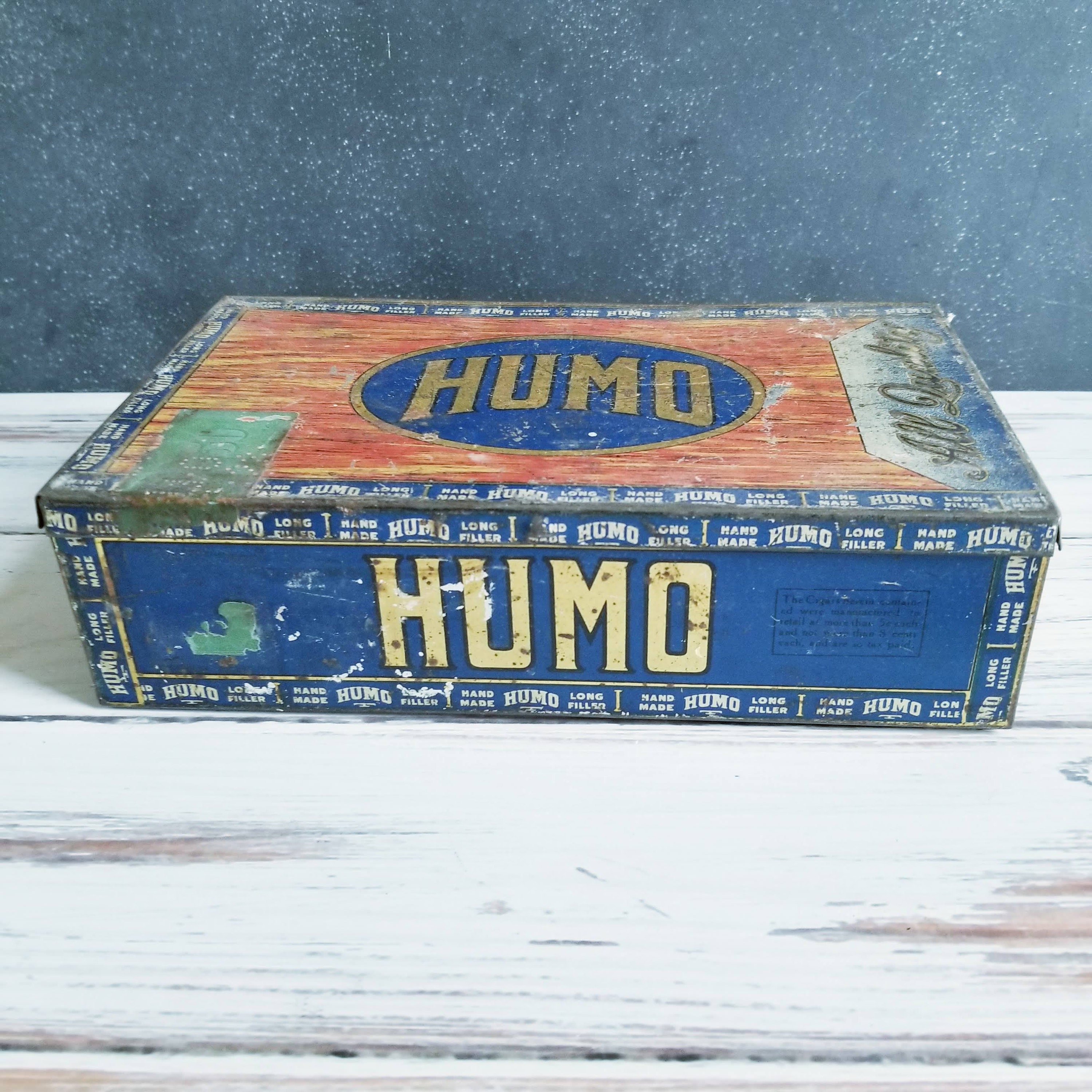 Vintage Humo cigar tin, good clear graphics inside, typical wear and tear on the outside. A great tobacciana collector tin or use for storage.
