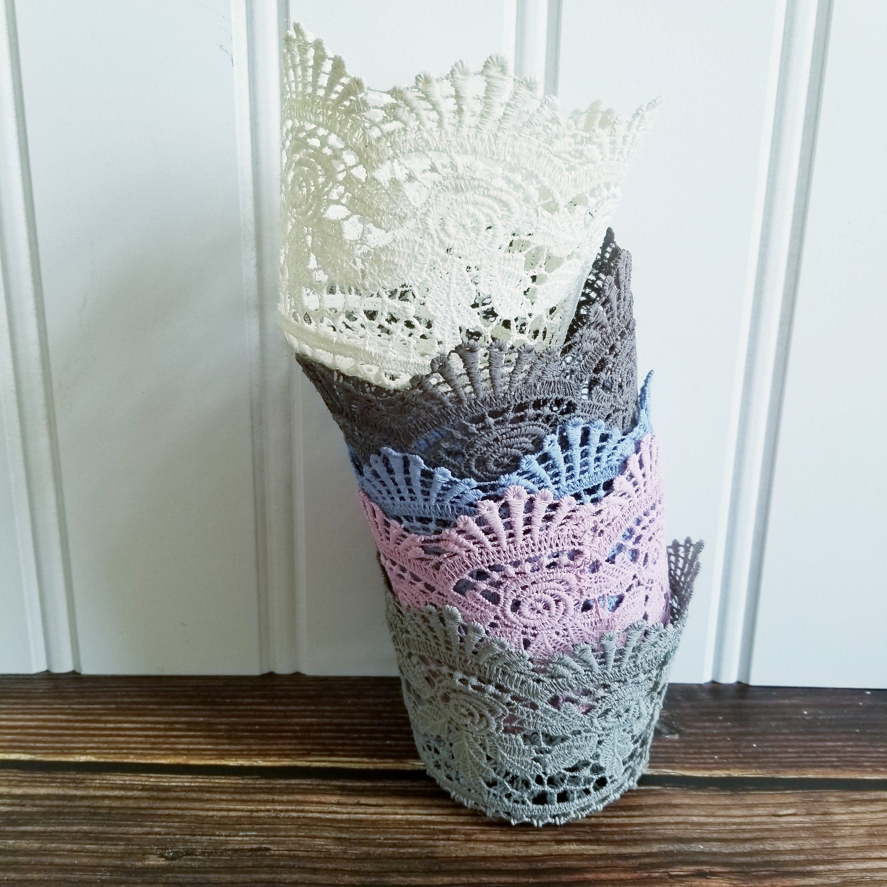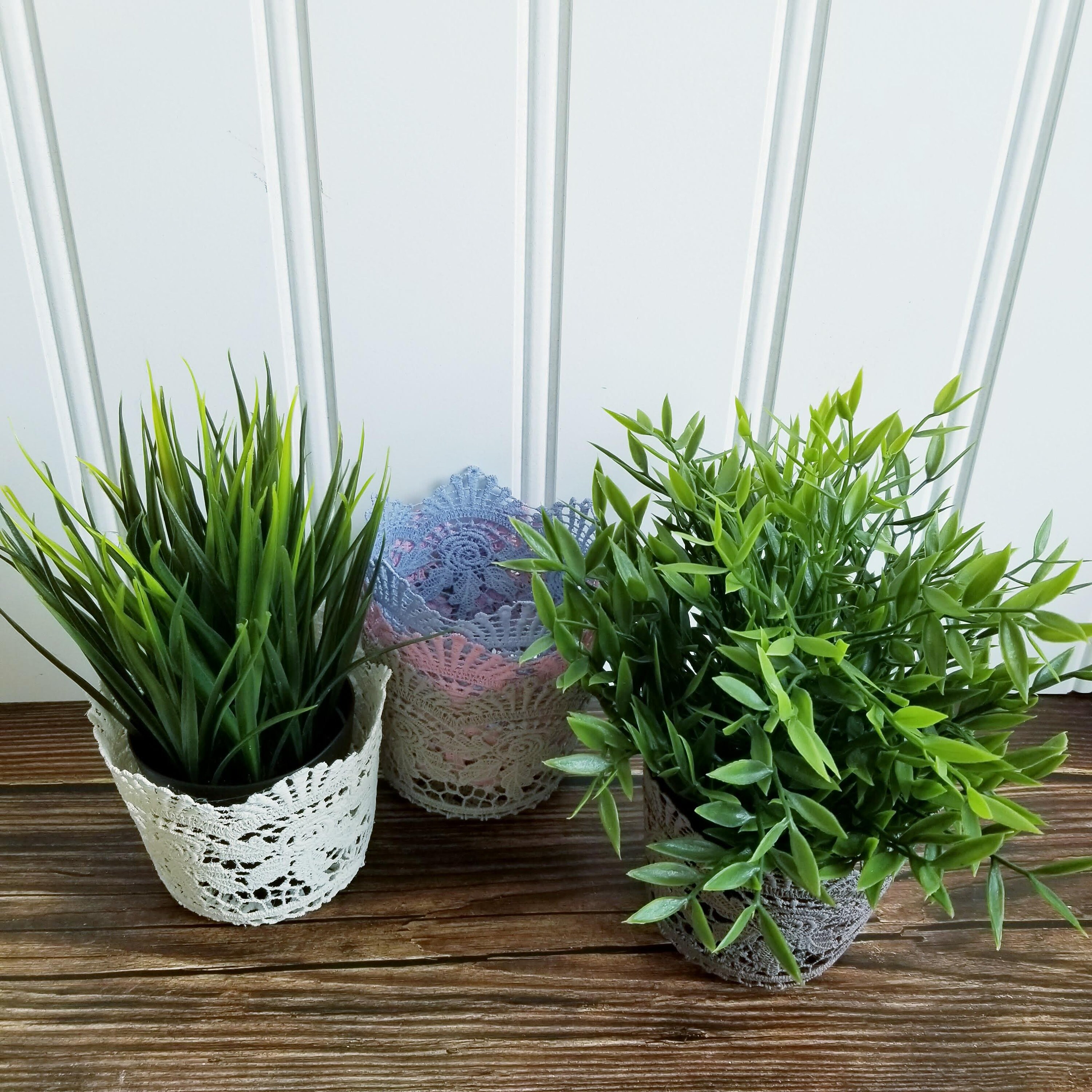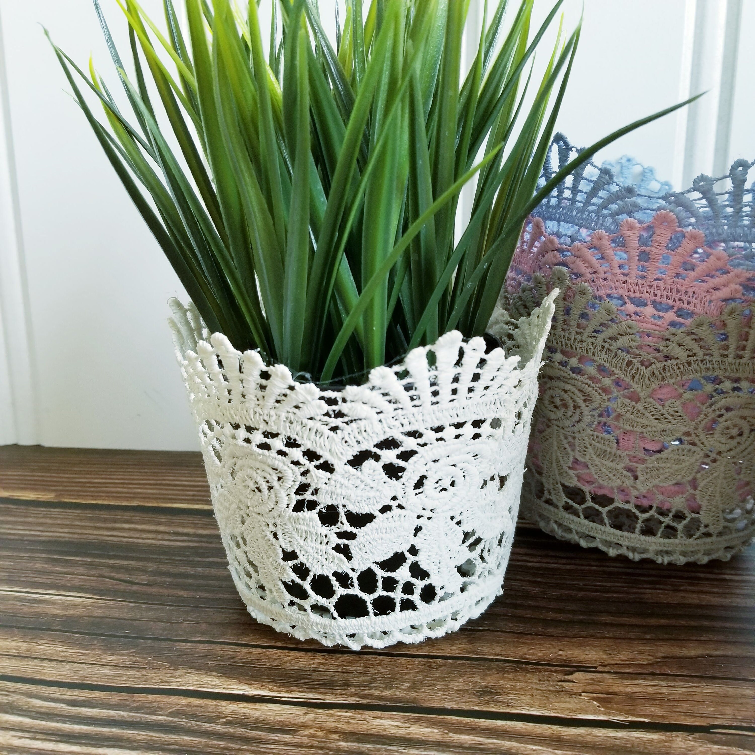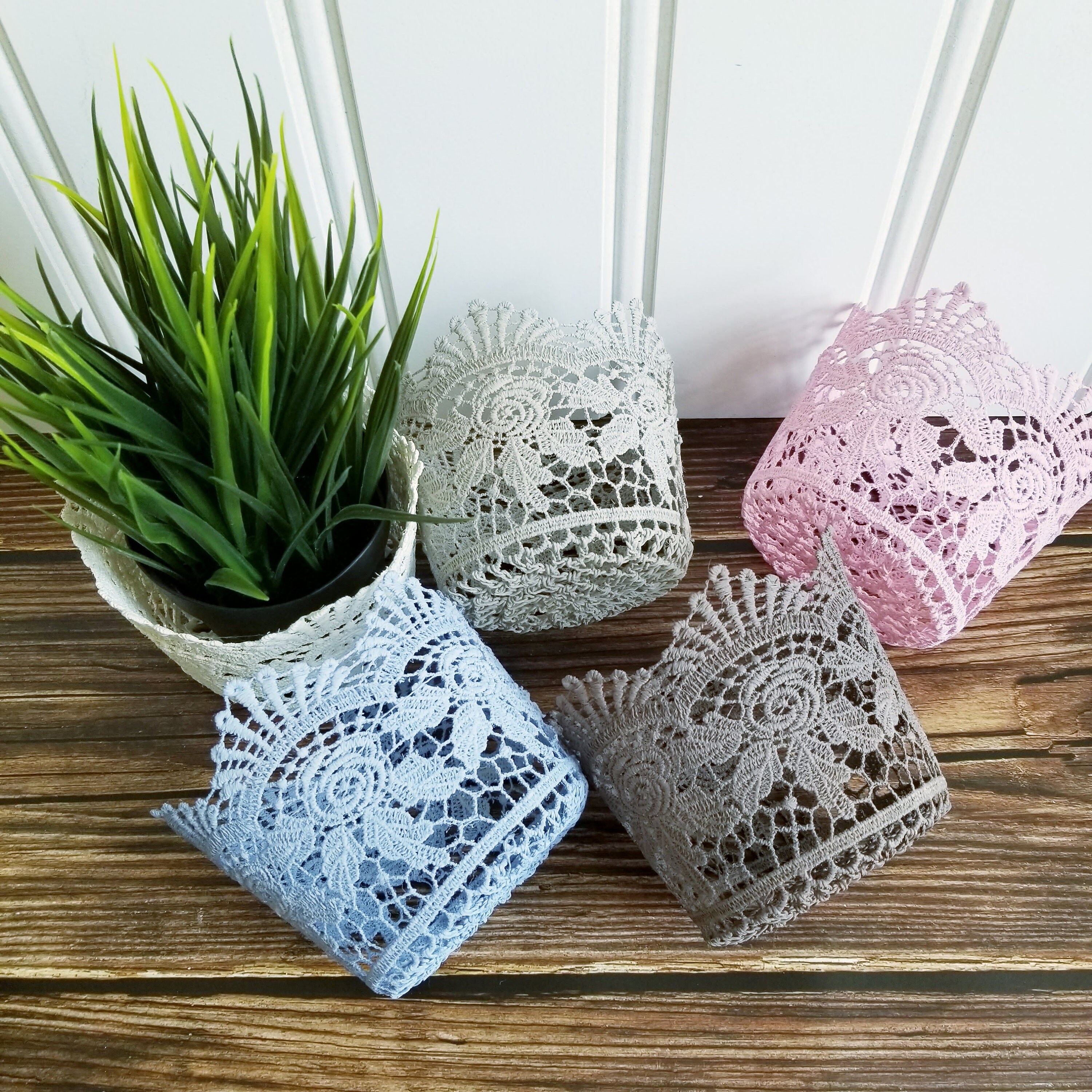 Set of 5 stiffened crocheted plant pot covers in white, blue, light grey, pink and dark grey. Lovely cottagecore decor.