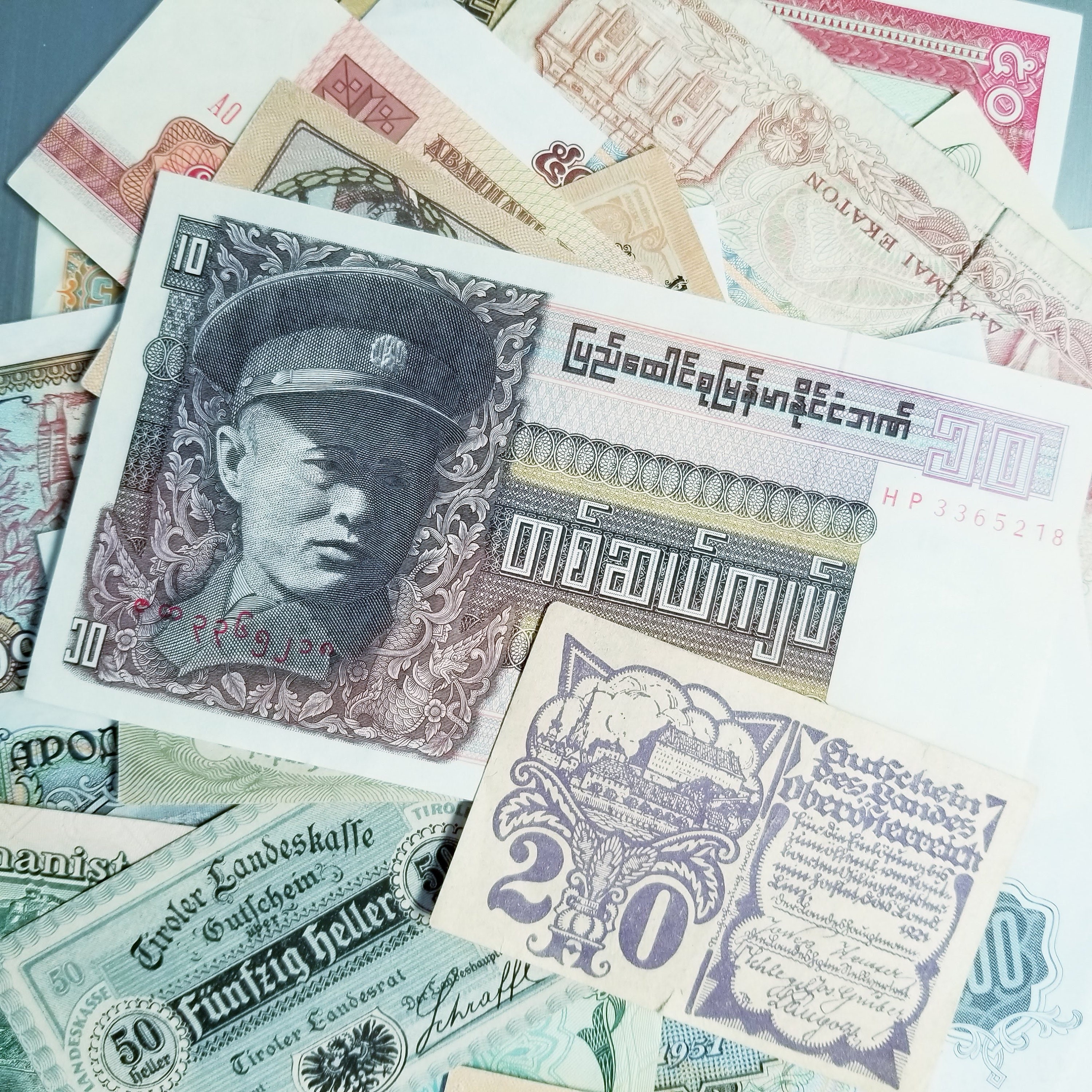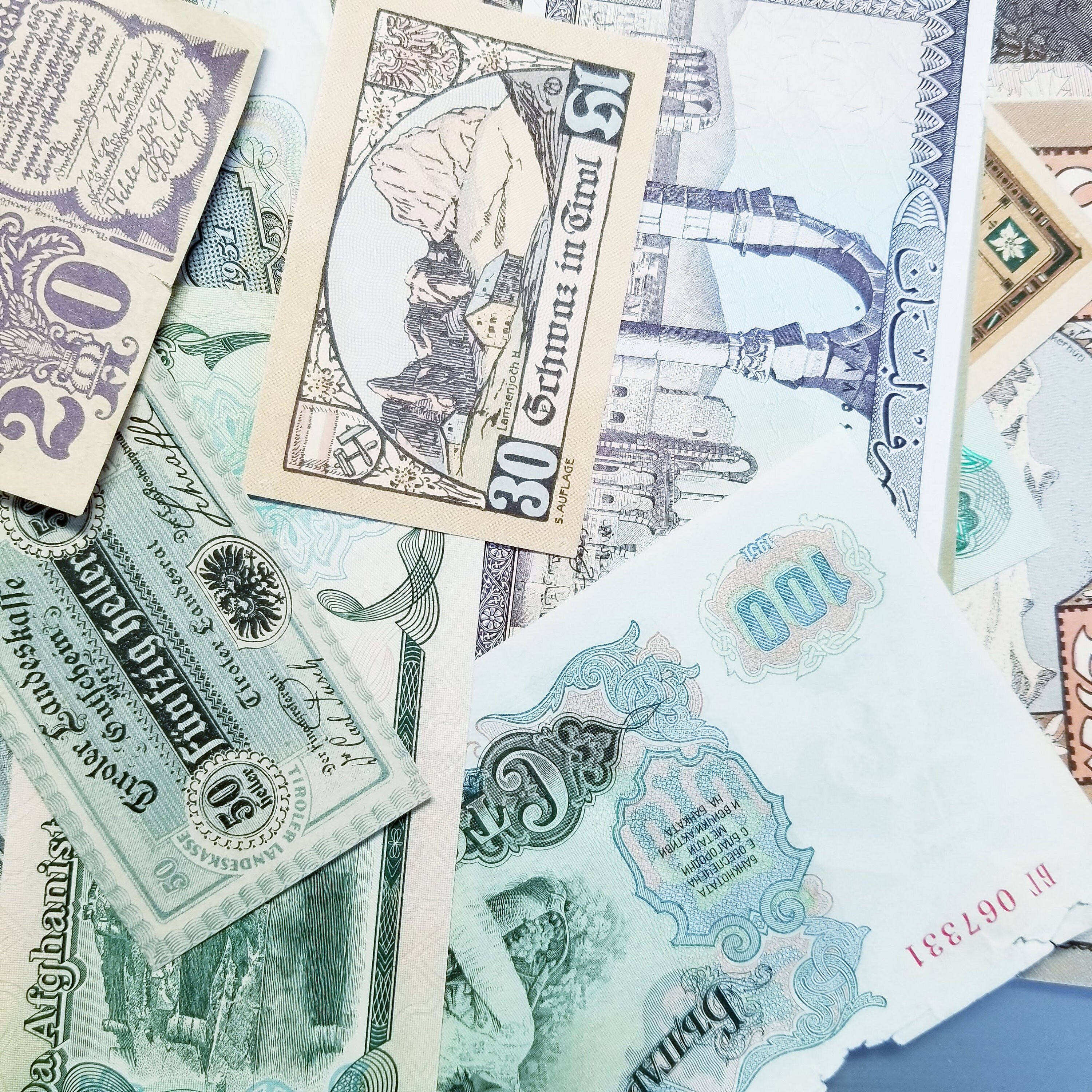 7 pieces of world paper currency, vintage and distressed.
