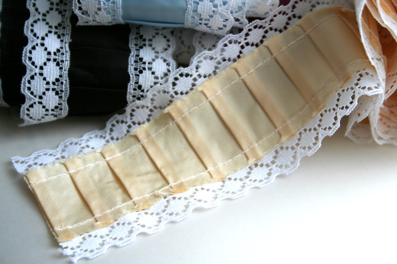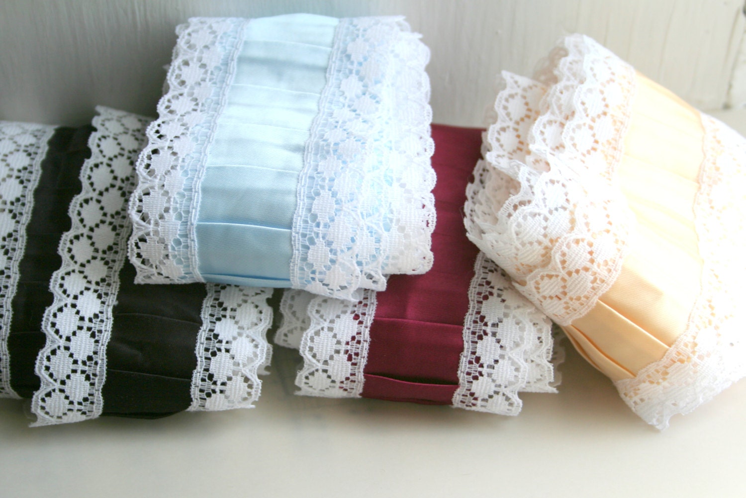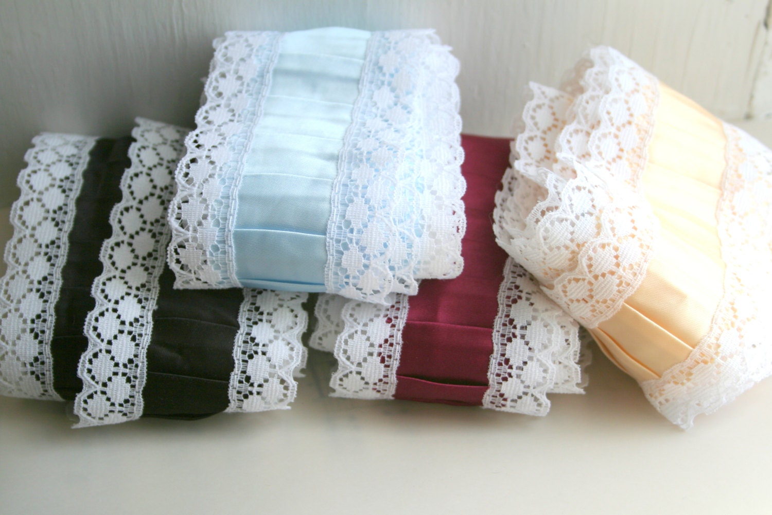 Gorgeous pleated satin ribbon with lace edging, perfect for straps, detail along a bodice or waist trim. Available in Ivory, Baby Blue, Black or Burgundy, all with white lace.