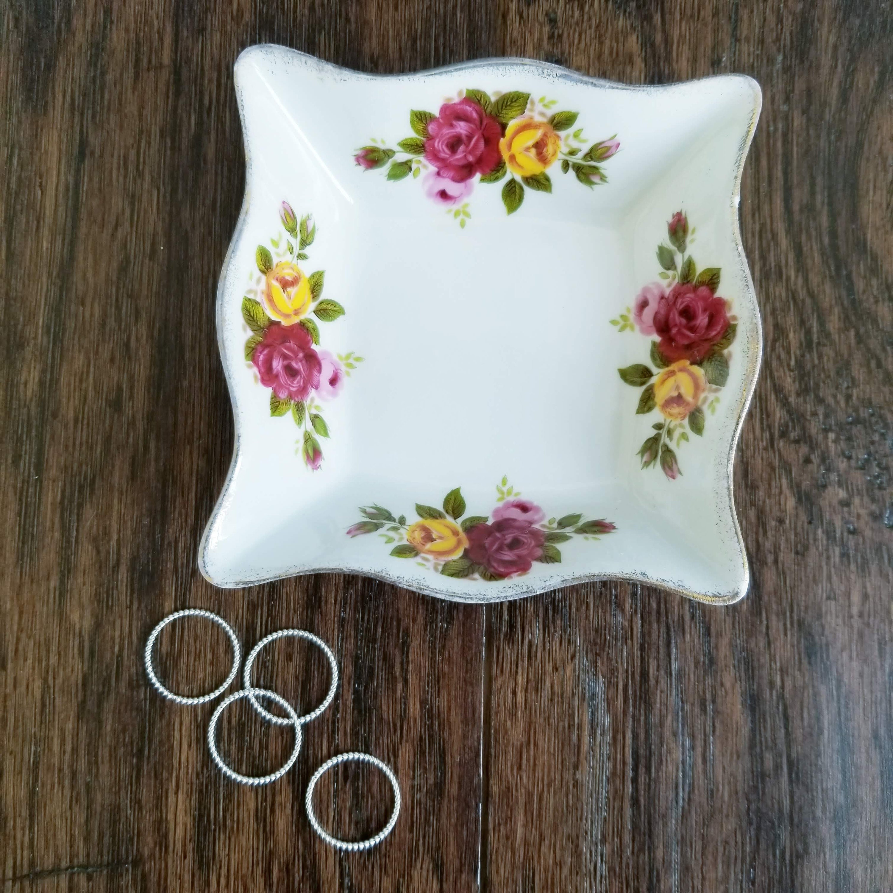 Square Cottage Rose patterned bowl with gold trim fine bone china. Made in Taiwan.