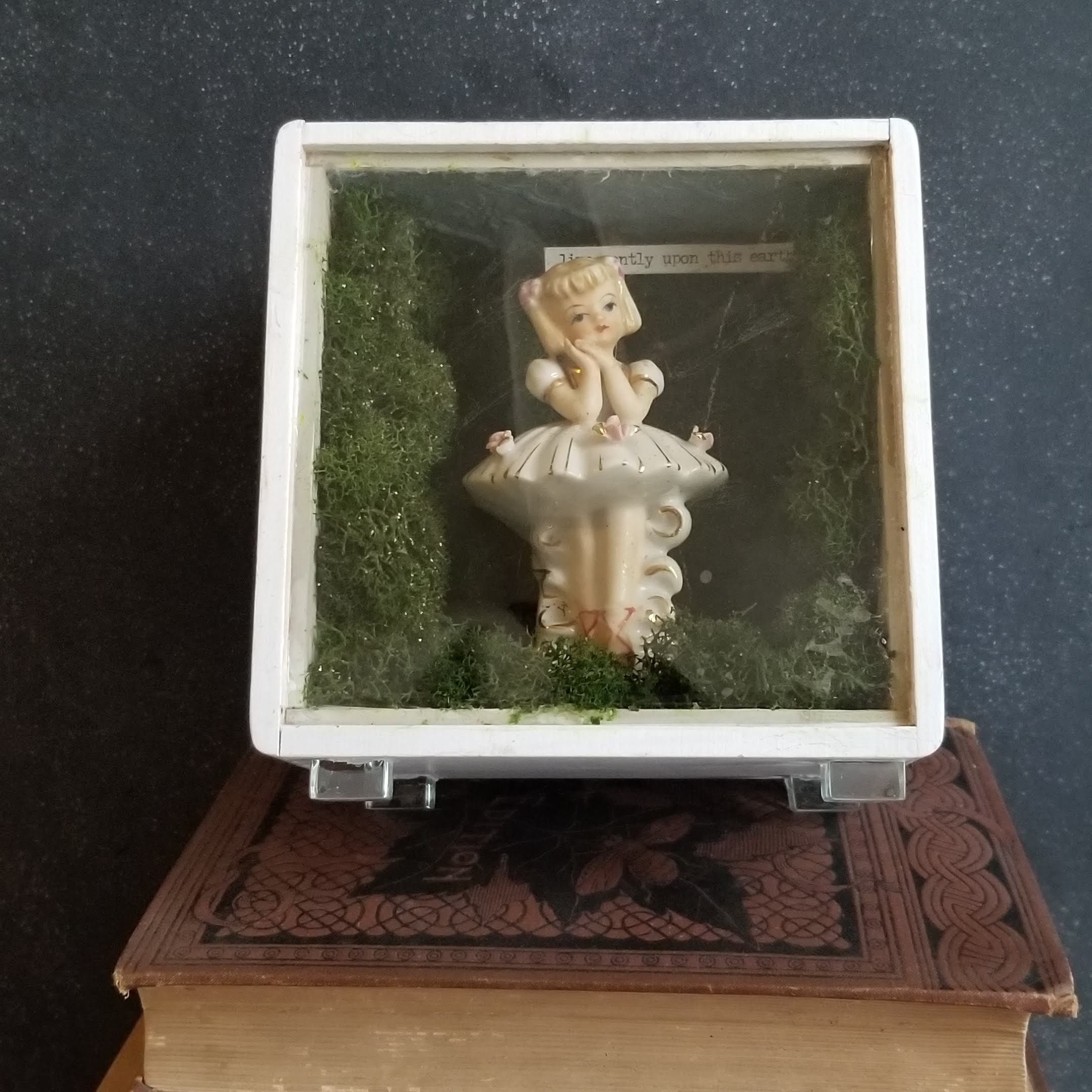 Forest Dancer is a small wooden box which contains a vintage girl ballet dancer figurine nestled in preserved moss, sprinkled with fine mica flakes that glitter softly. The box is sealed with a sheet of mica.