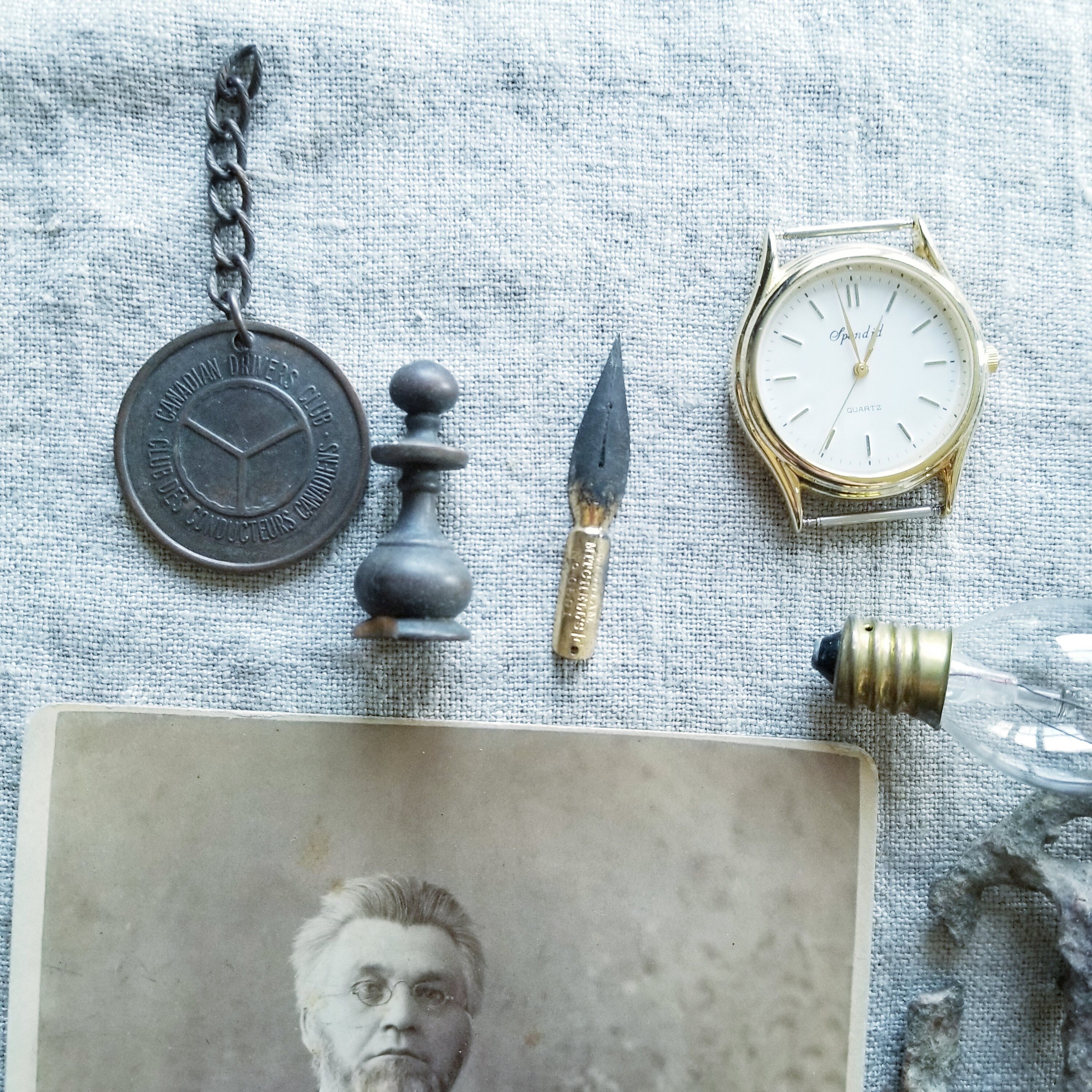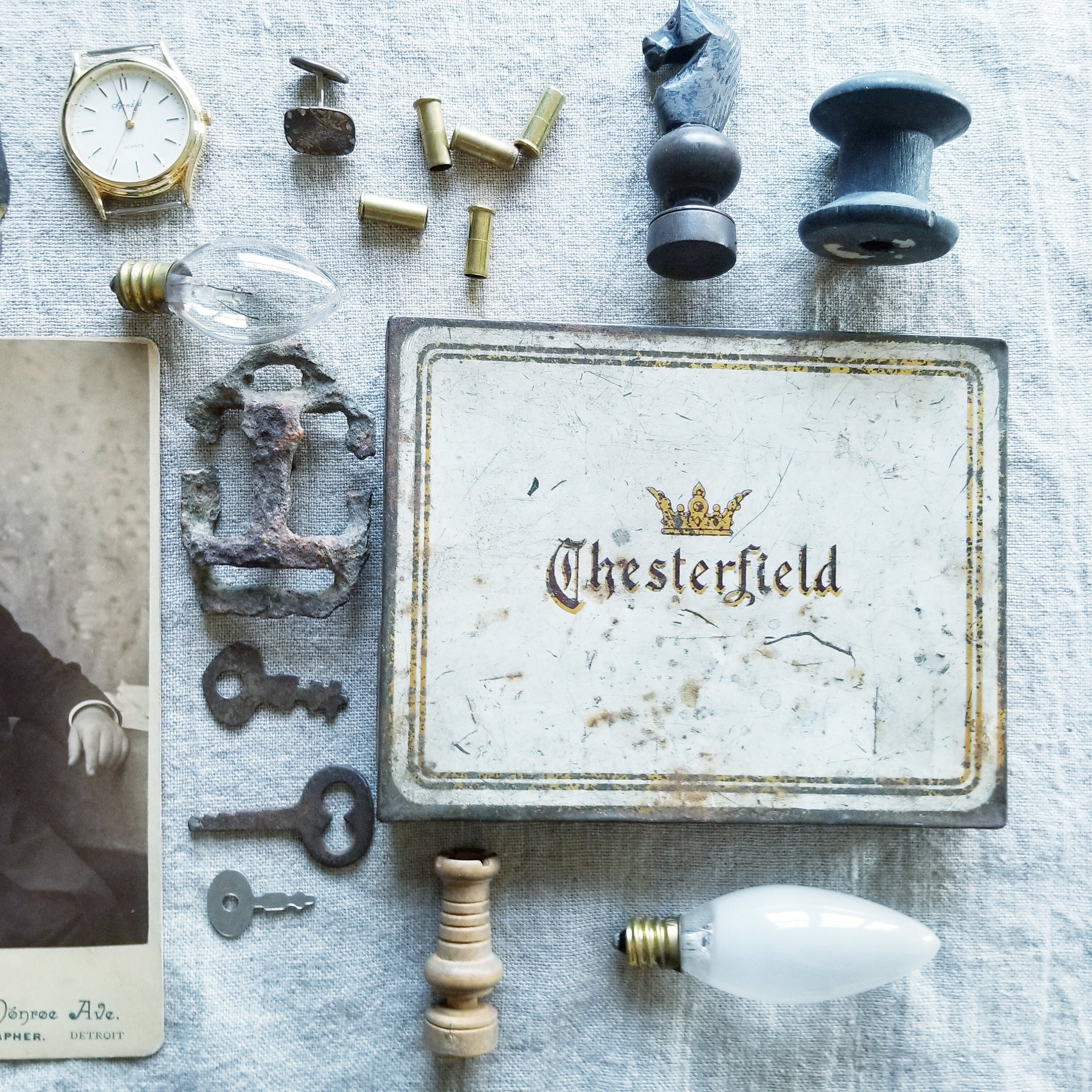 wooden spools, wooden chess pieces, watch face, pen nib, cigarette tin, keys, rusty weird thing, blown light bulbs, brass pieces.