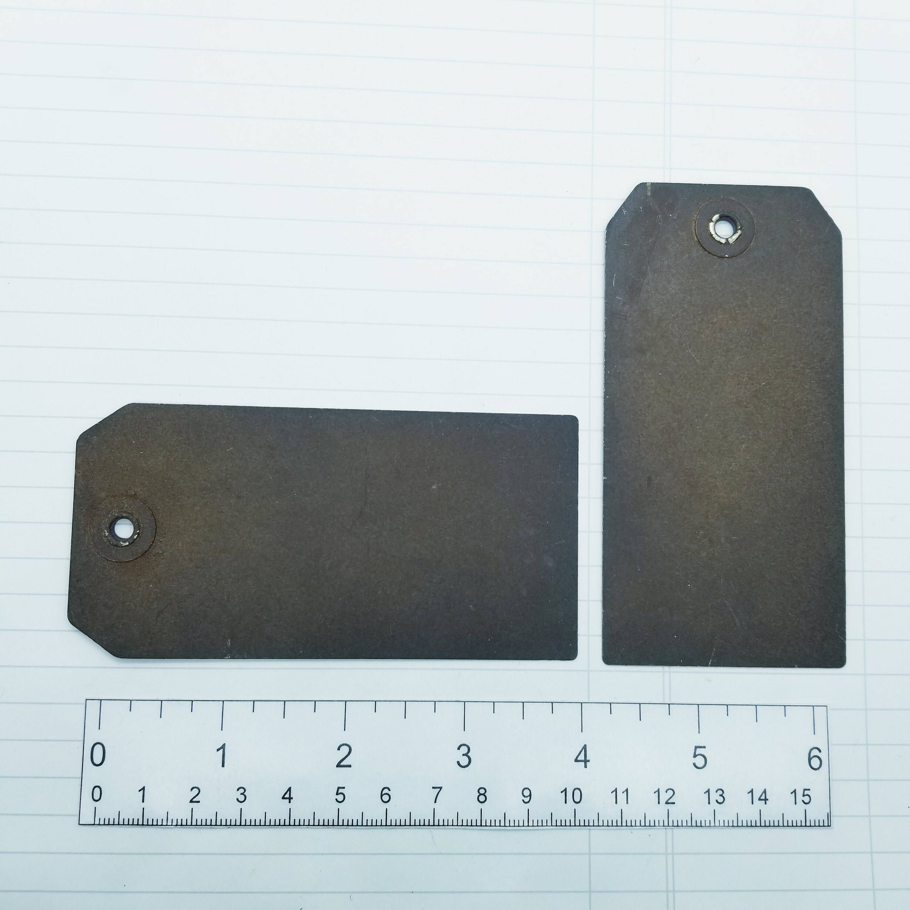2 rusty finished metal tags sized 4 1/4 inches x 2 1/4 inches.