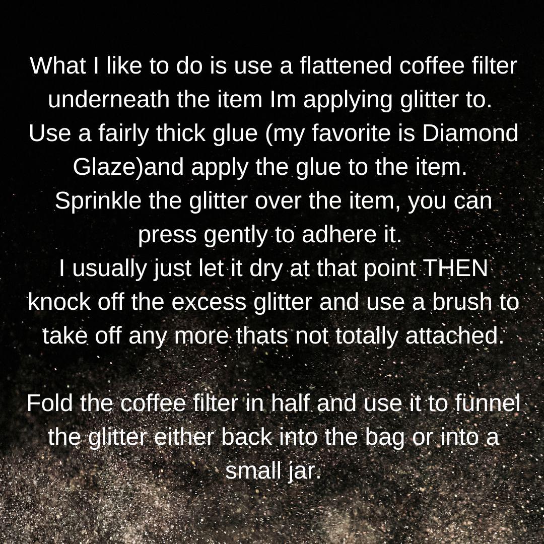 What I like to do is use a flattened coffee filter underneath the item Im applying glitter to.