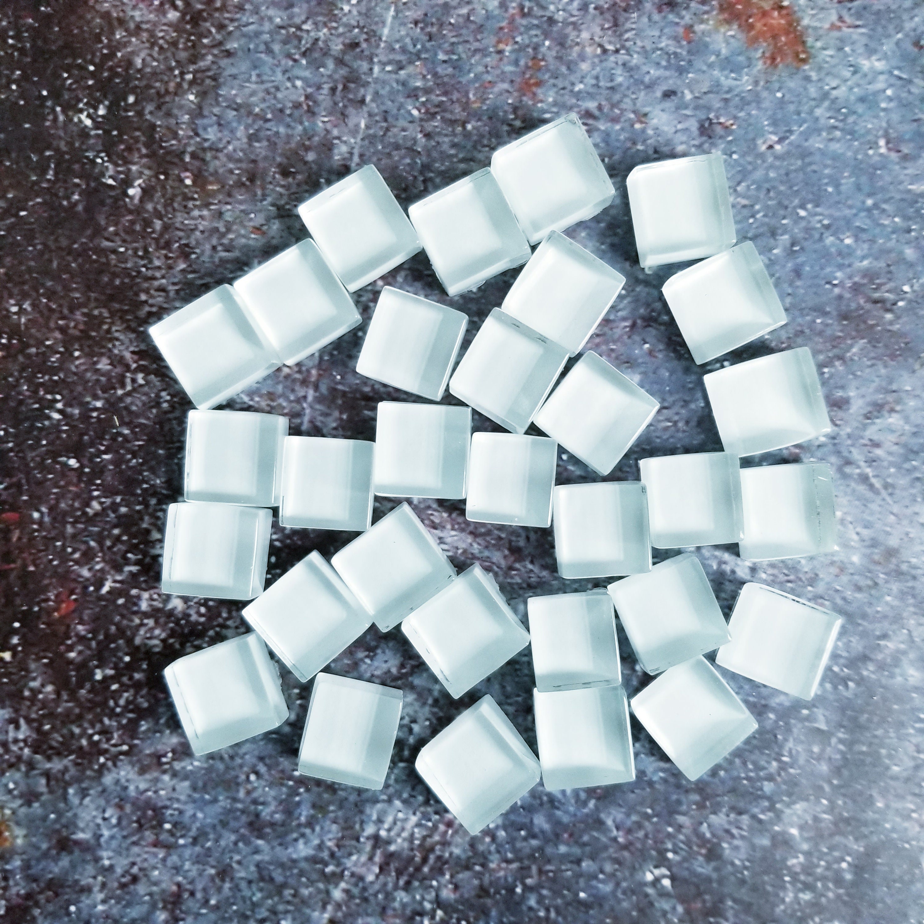 30 pieces of square glass tiles, 15mm across, 7-8mm high.