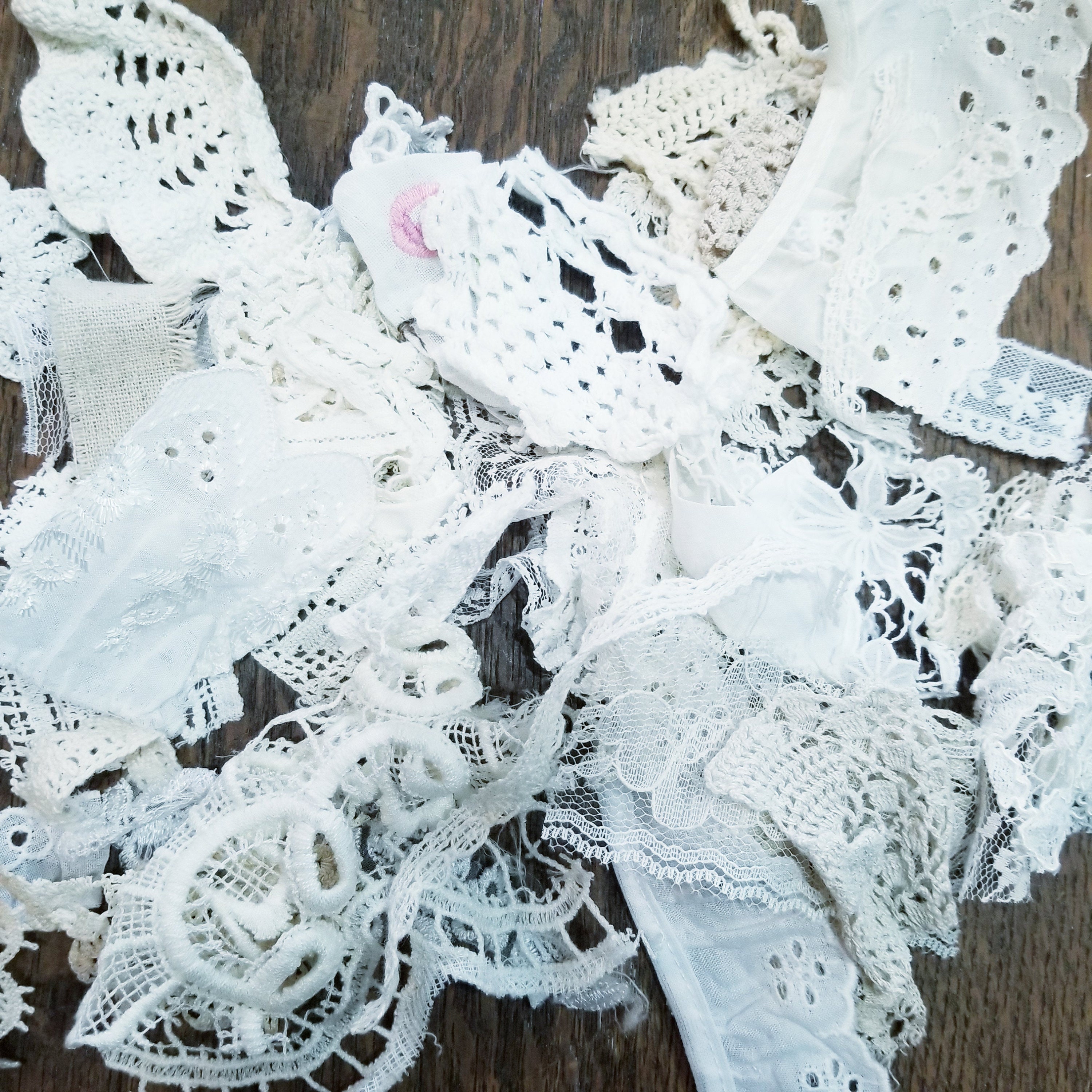 Snipped bits of handmade and vintage lace and trims. Perfect for junk journals or slow stitching.