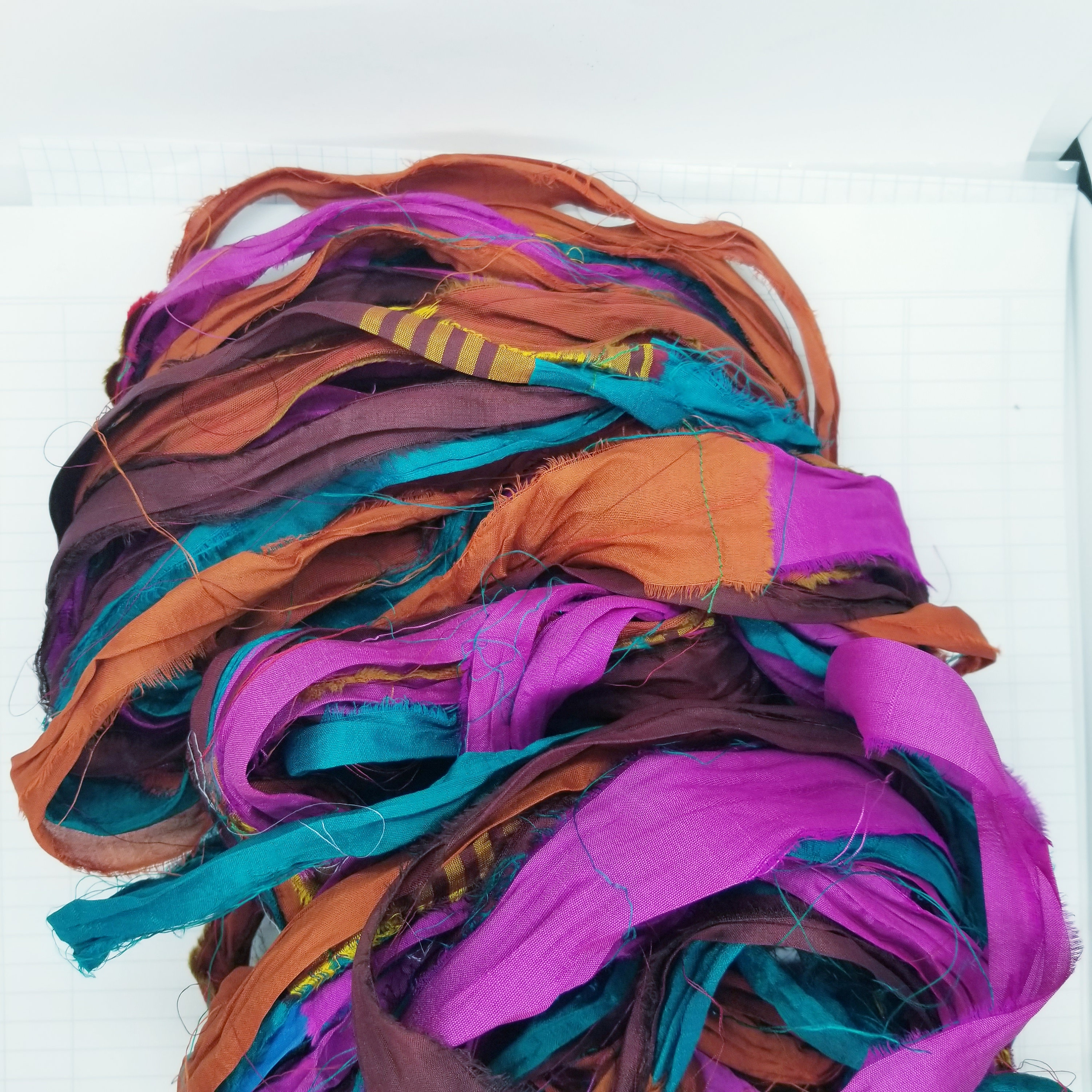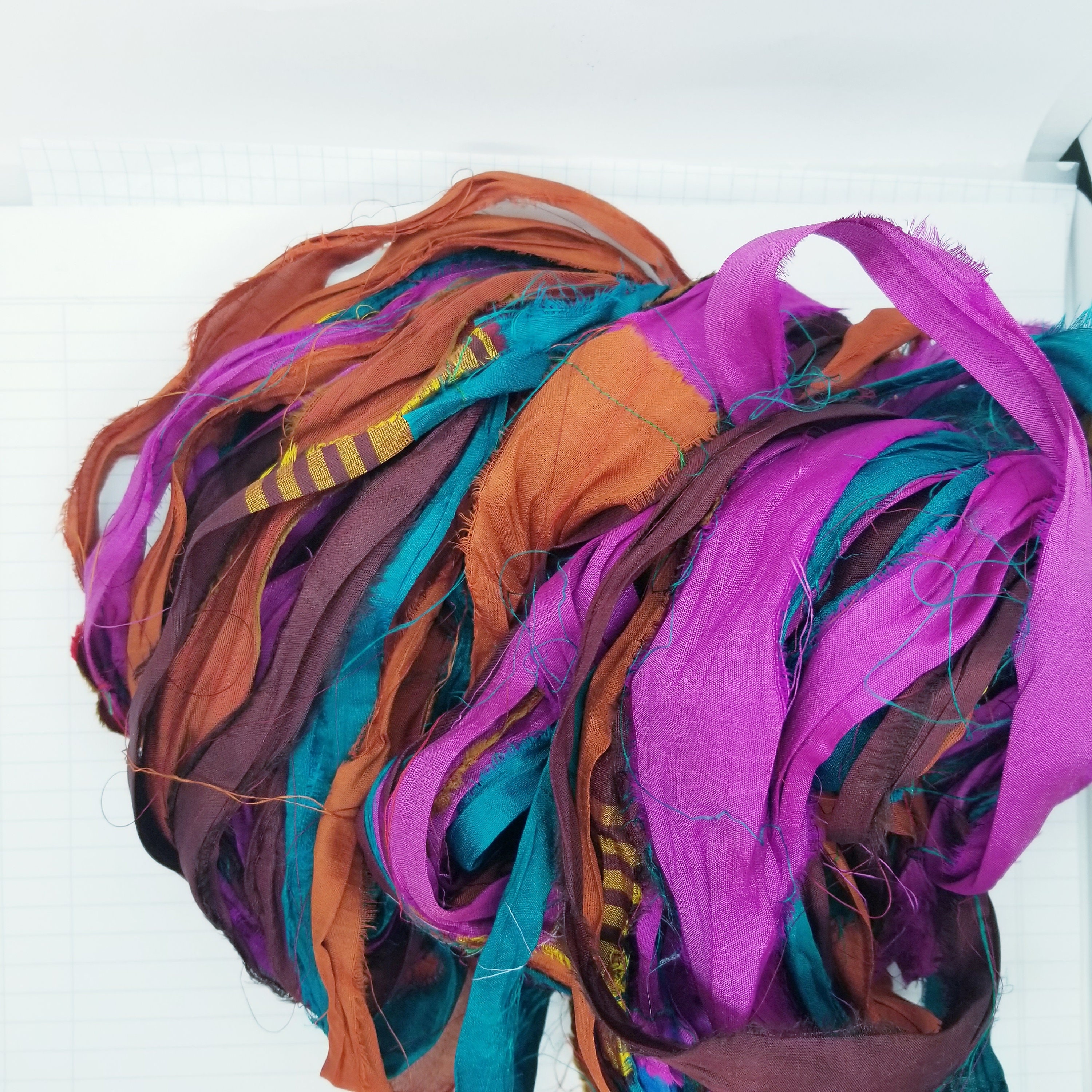 Crafted from luxurious silk sari waste (ends pieces from the fabric yardage not from used saris), our ribbons boast a delicate texture and vibrant hues that will elevate your projects to new heights.