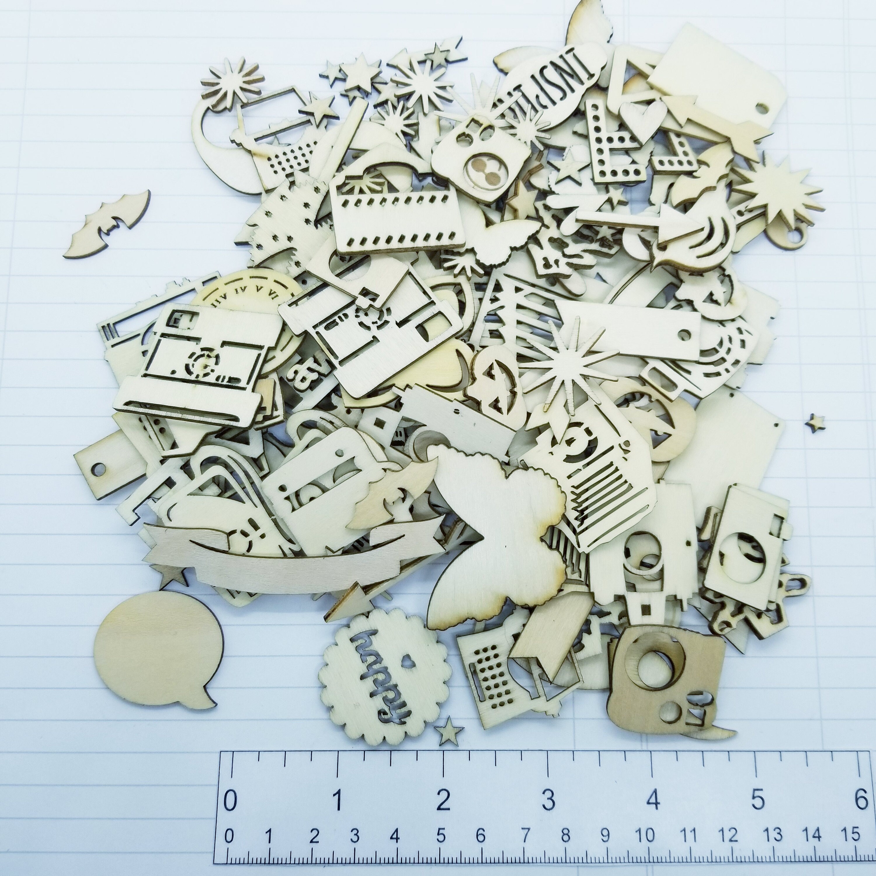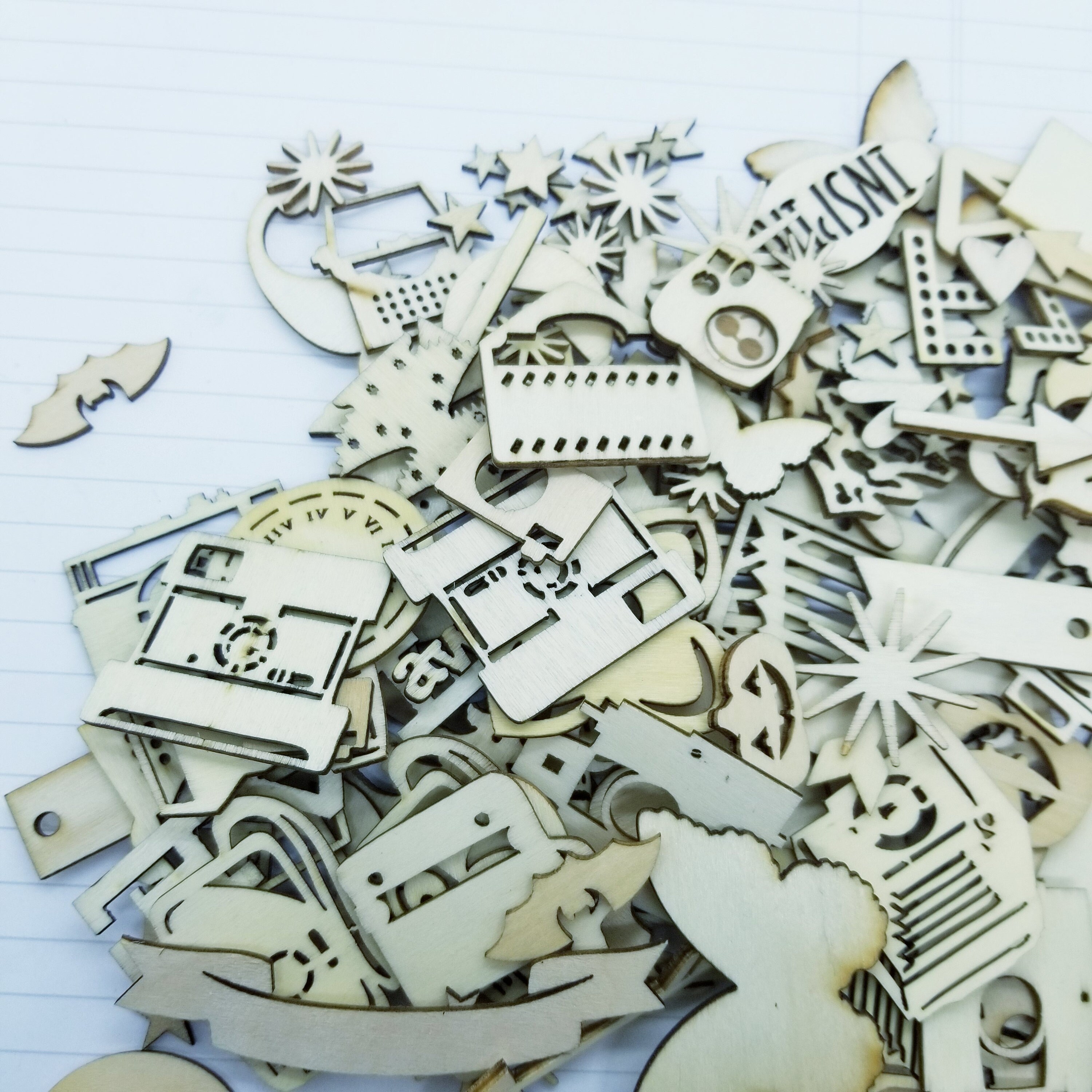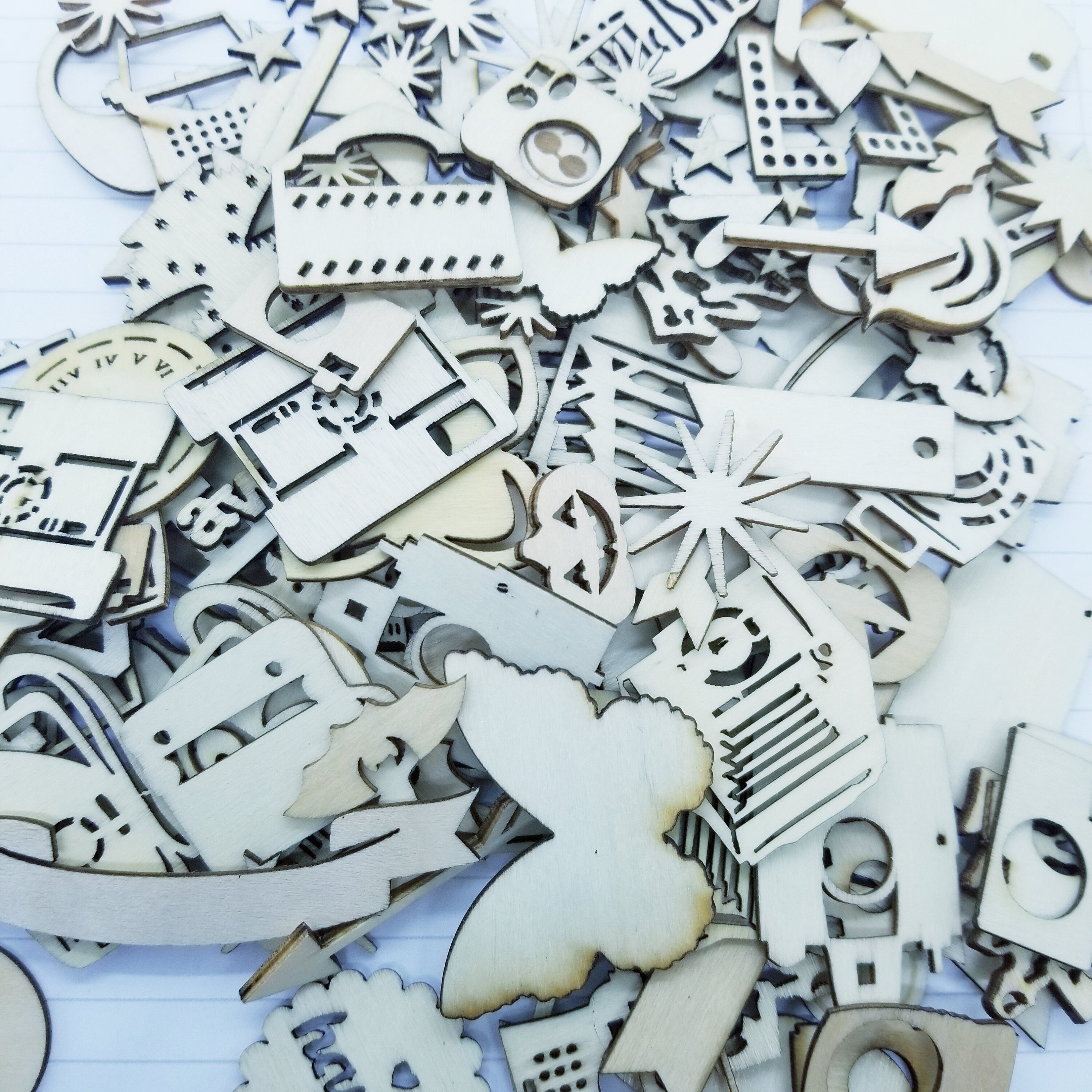 Lots of goodies in this bundle of 100+ laser cut wooden ephemera for scrapbooking, collage art or junk journaling.