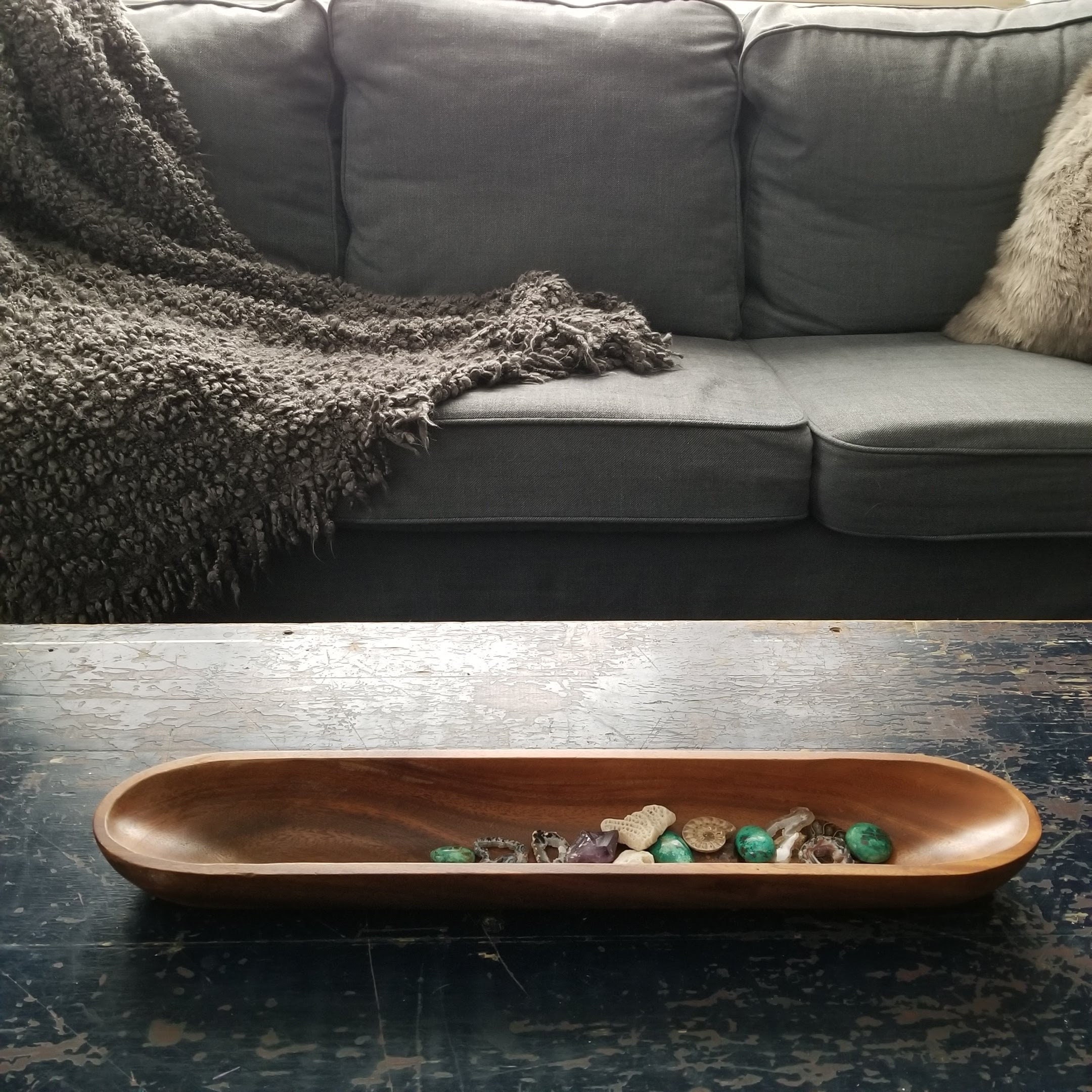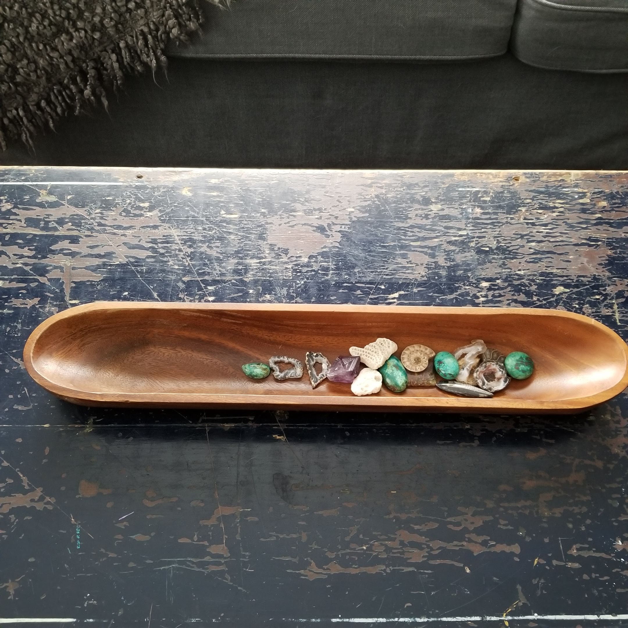 Gorgeous carved monkey wood bowl, long and skinny which works well on tablescapes or buffets.