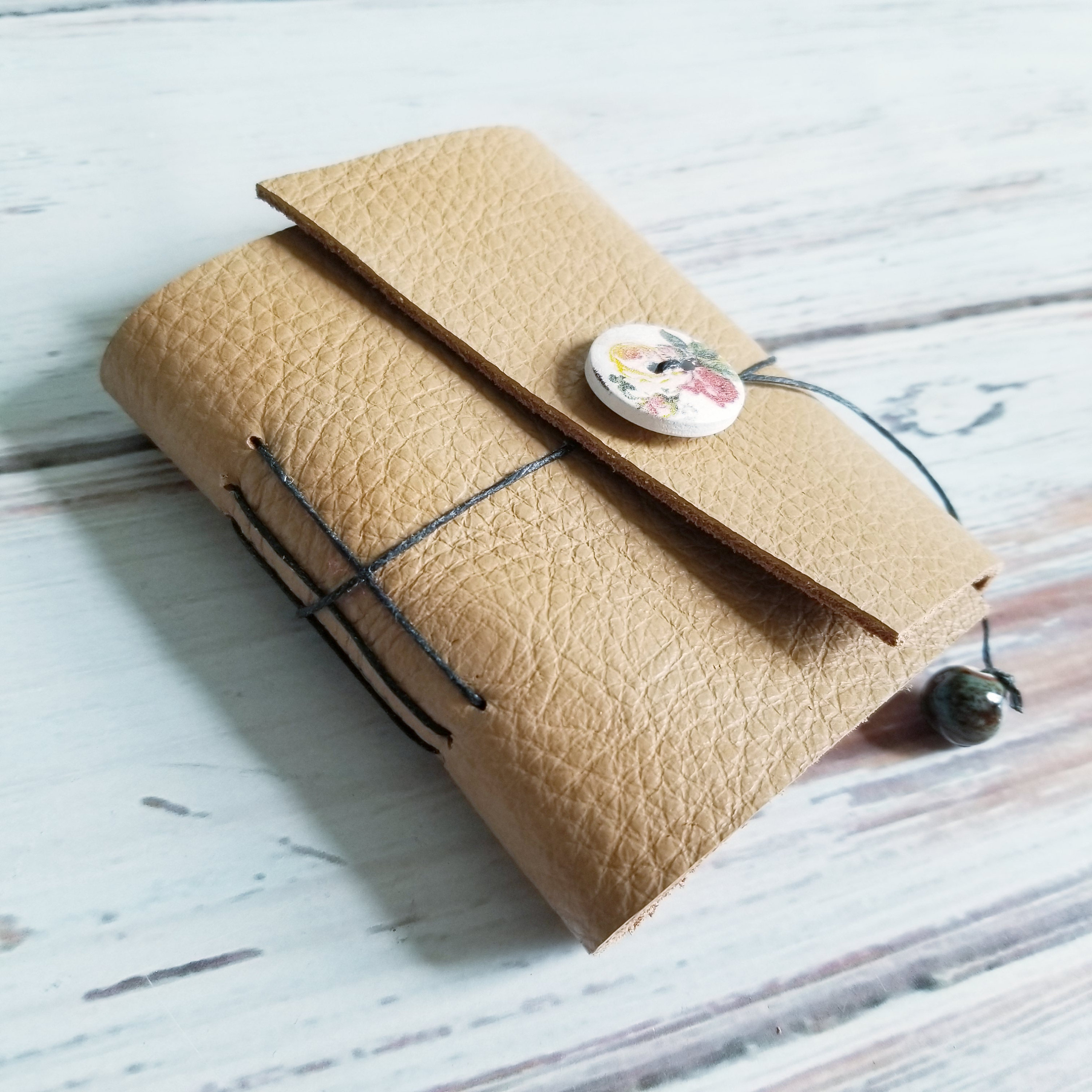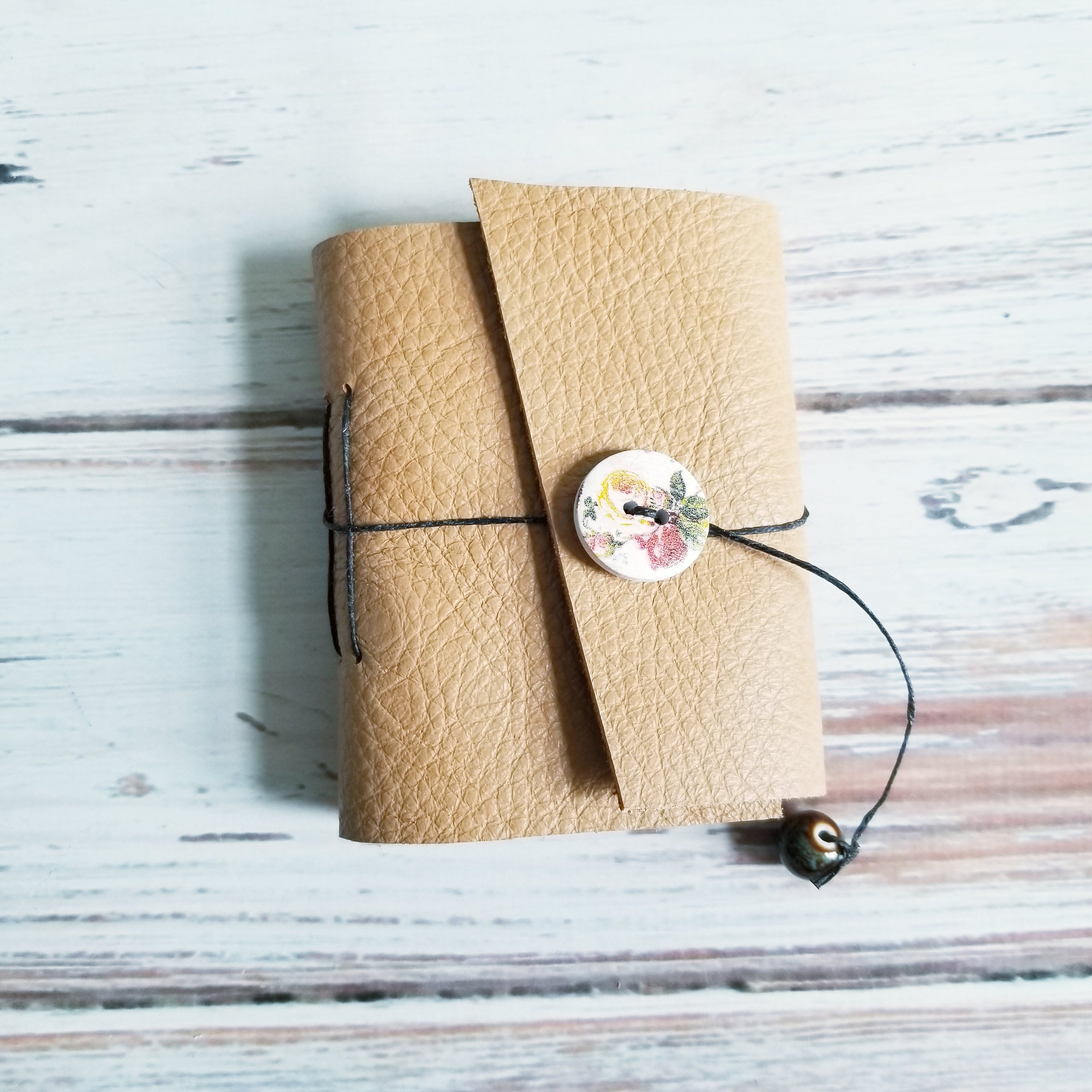 Reclaimed Leather Mini Notebook- Pebbled Texture Fawn brown with roses button closure