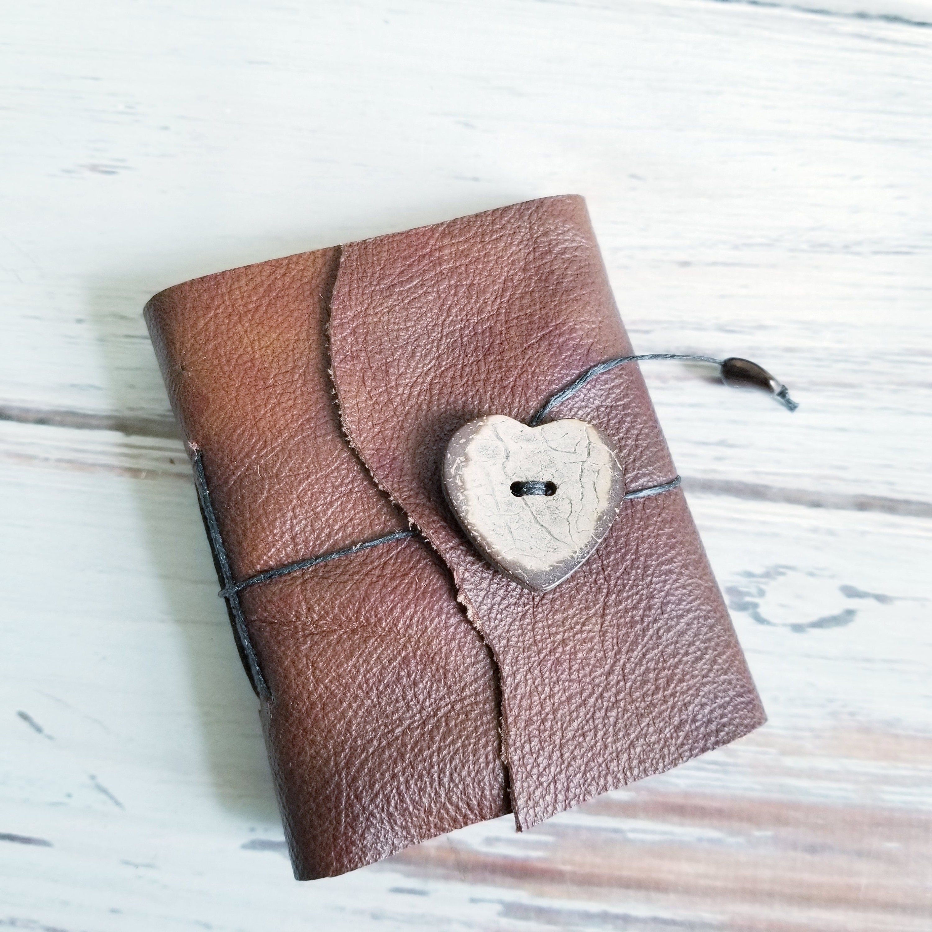 Reclaimed Leather Mini Notebook- Soft Brown with wooden heart button closure