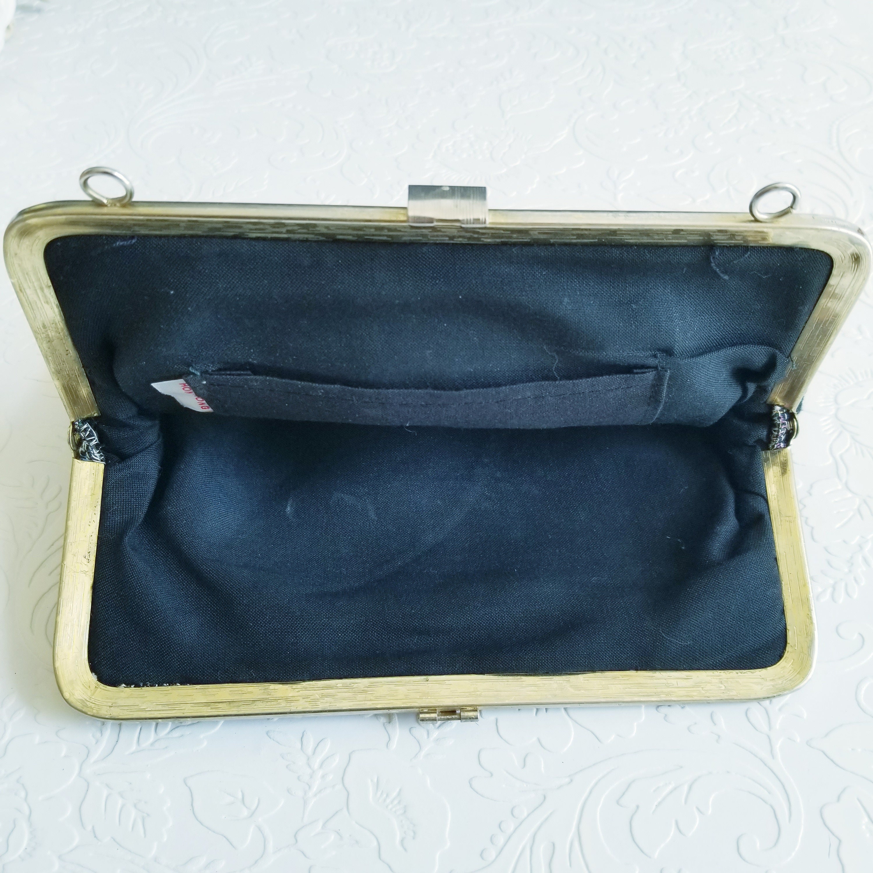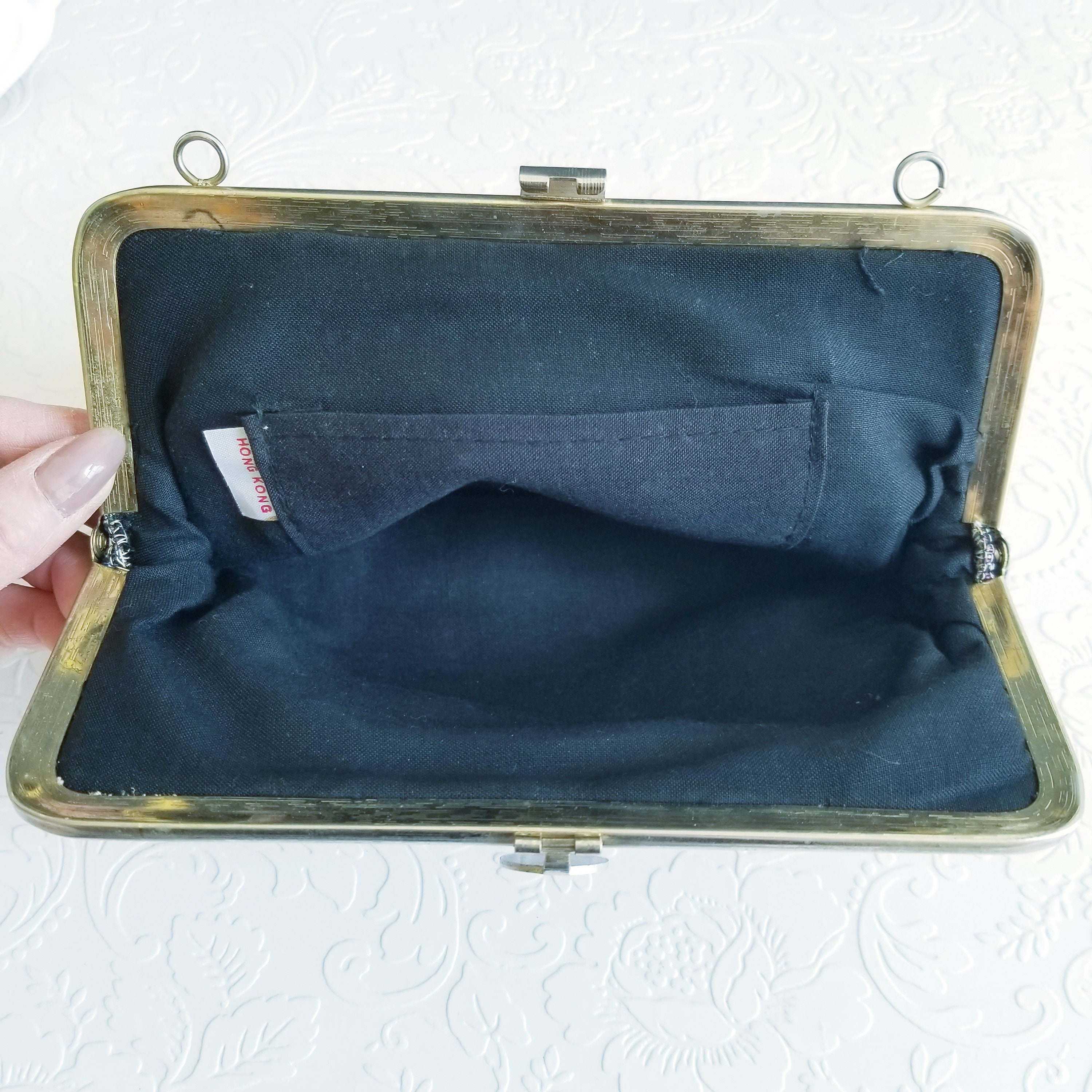 Pretty vintage black tapestry purse, missing the strap/chain/handle.