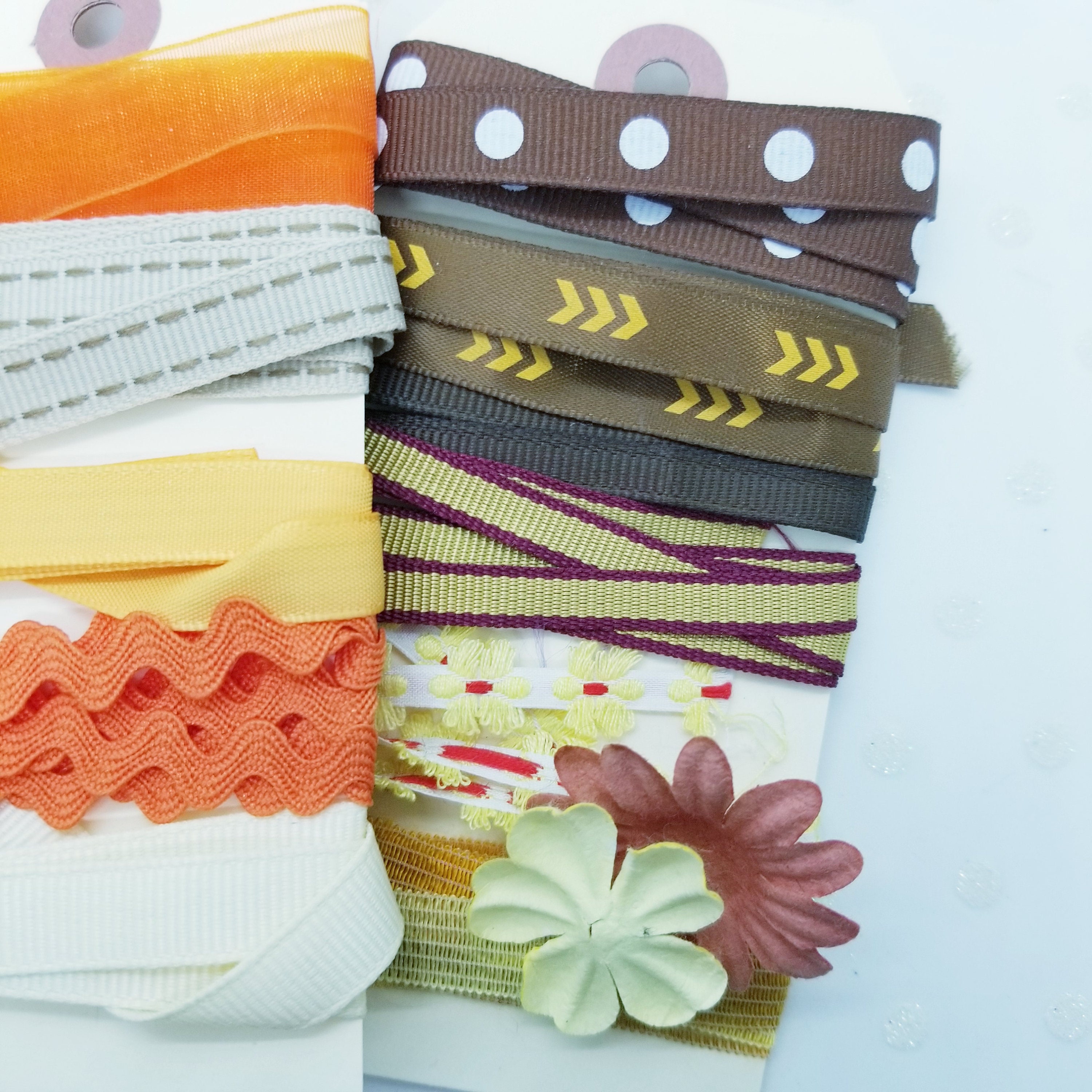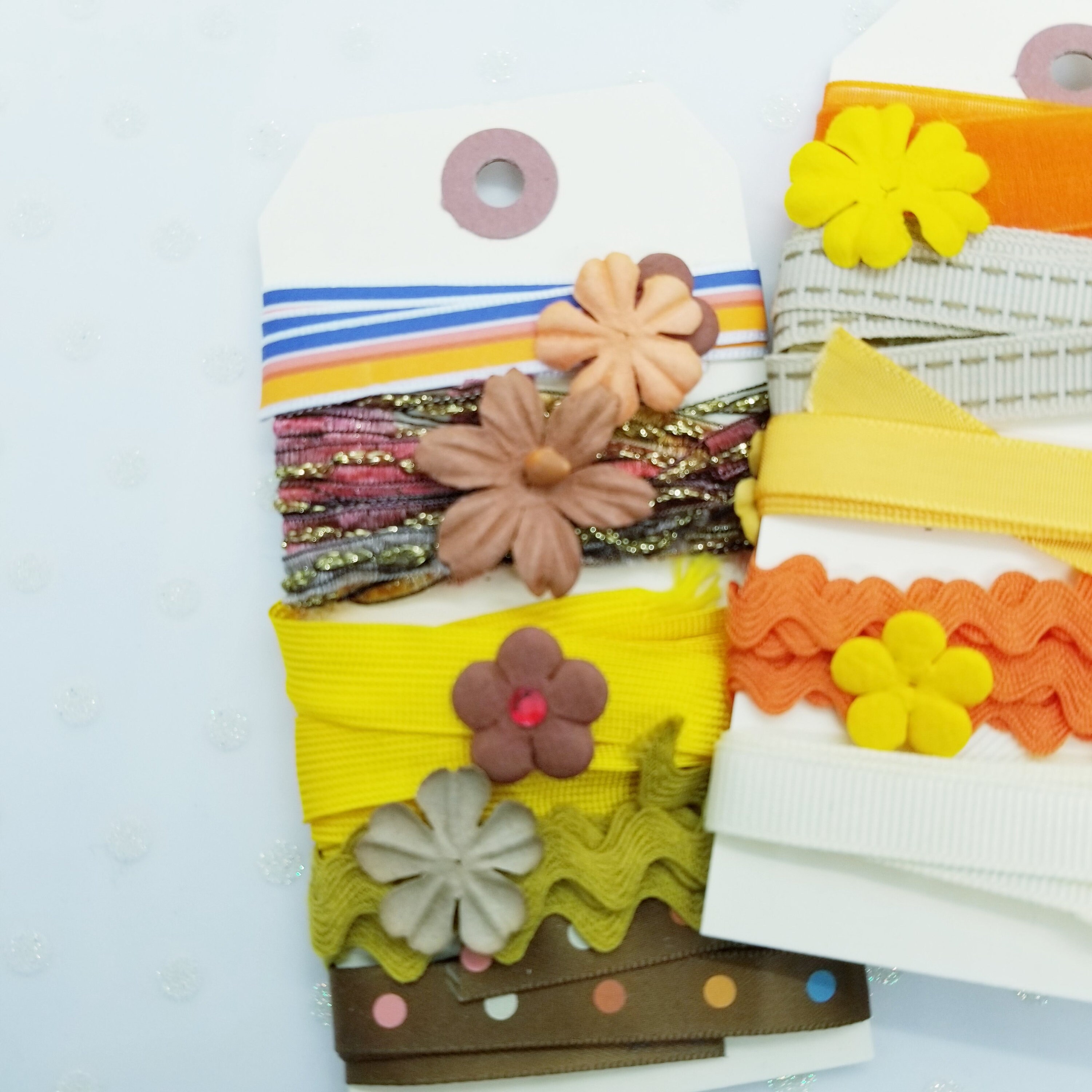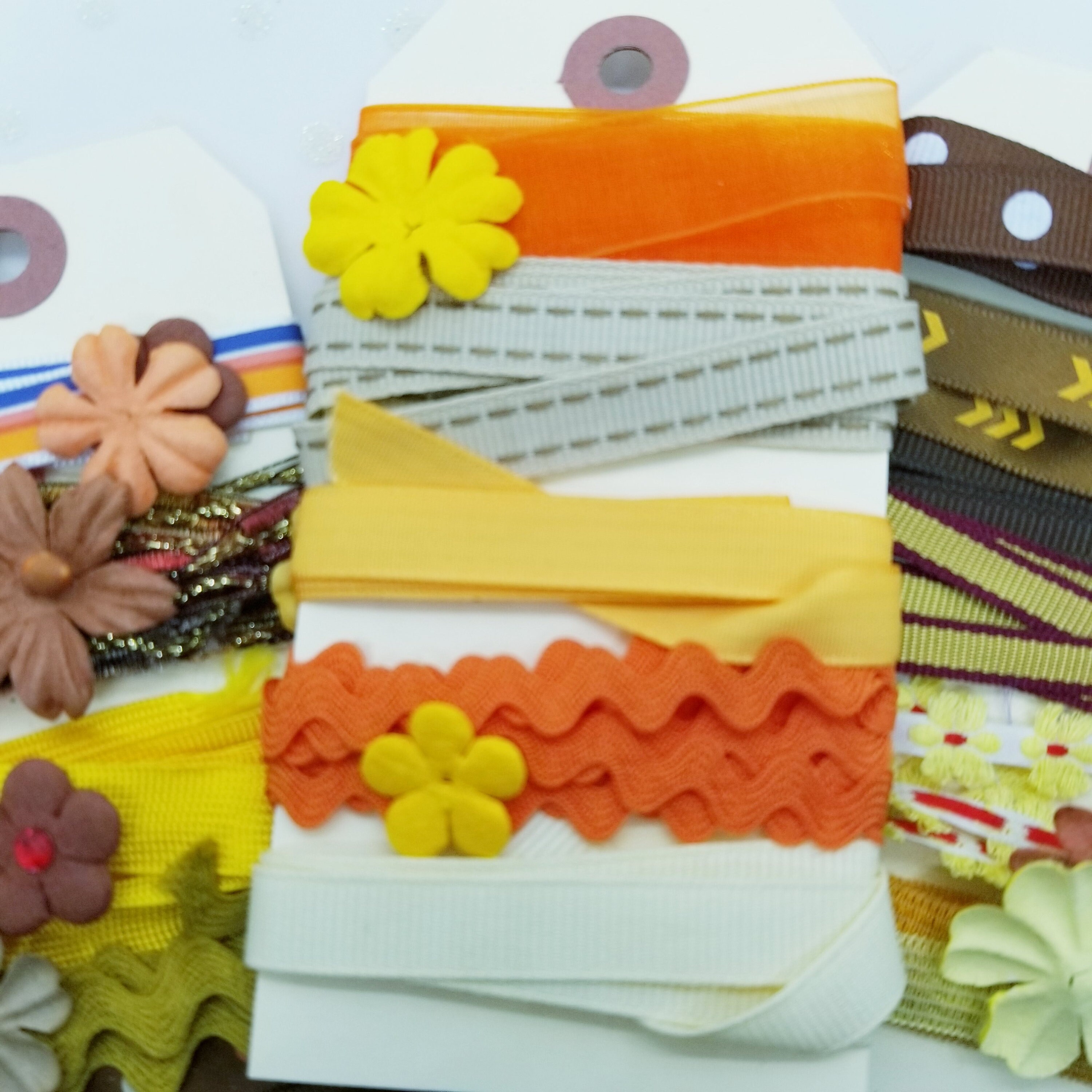 Package of 3 manilla tags wrapped with 15 pieces of various vintage and newish ribbons and trims. Various lengths of at least 1 foot long trims from my personal studio stash.