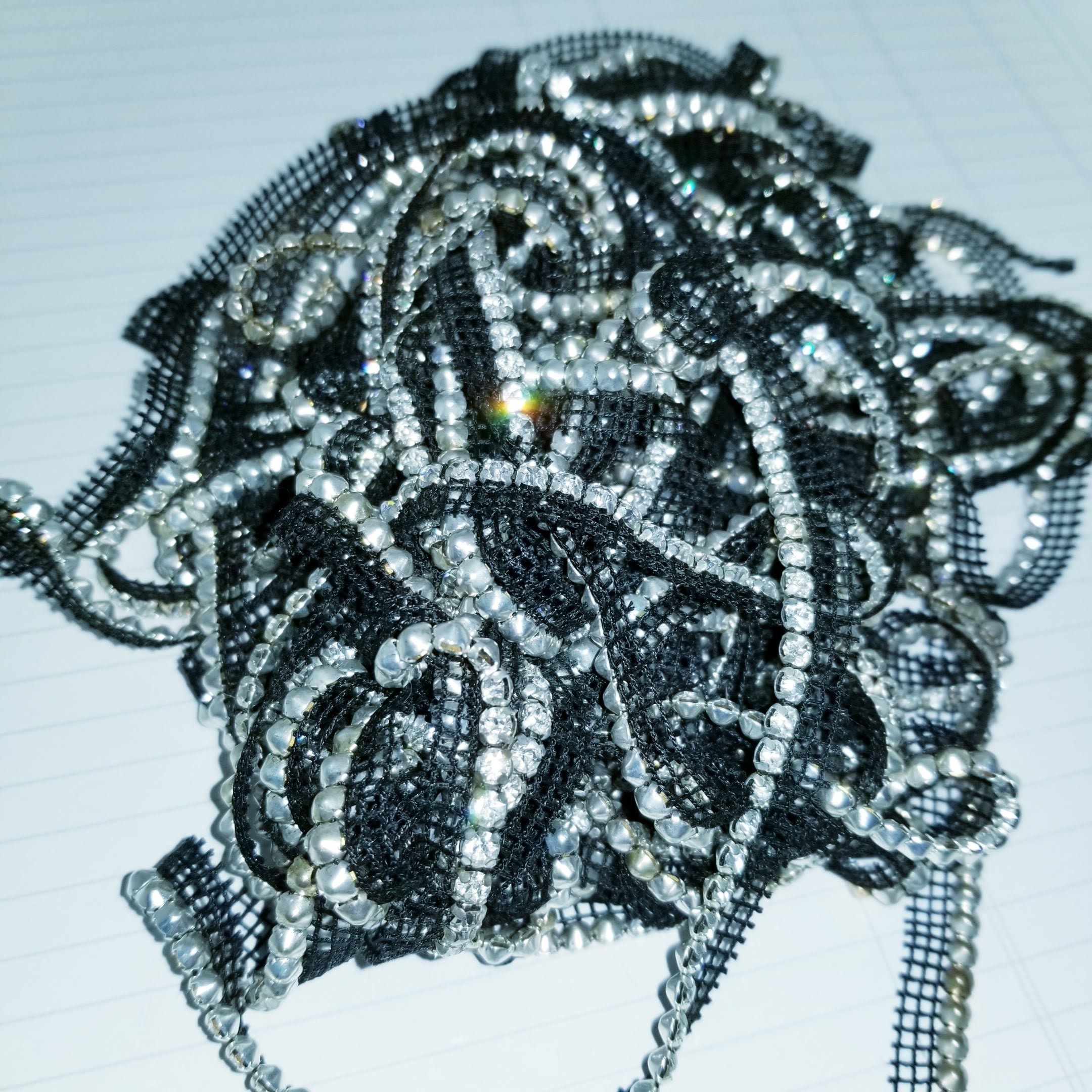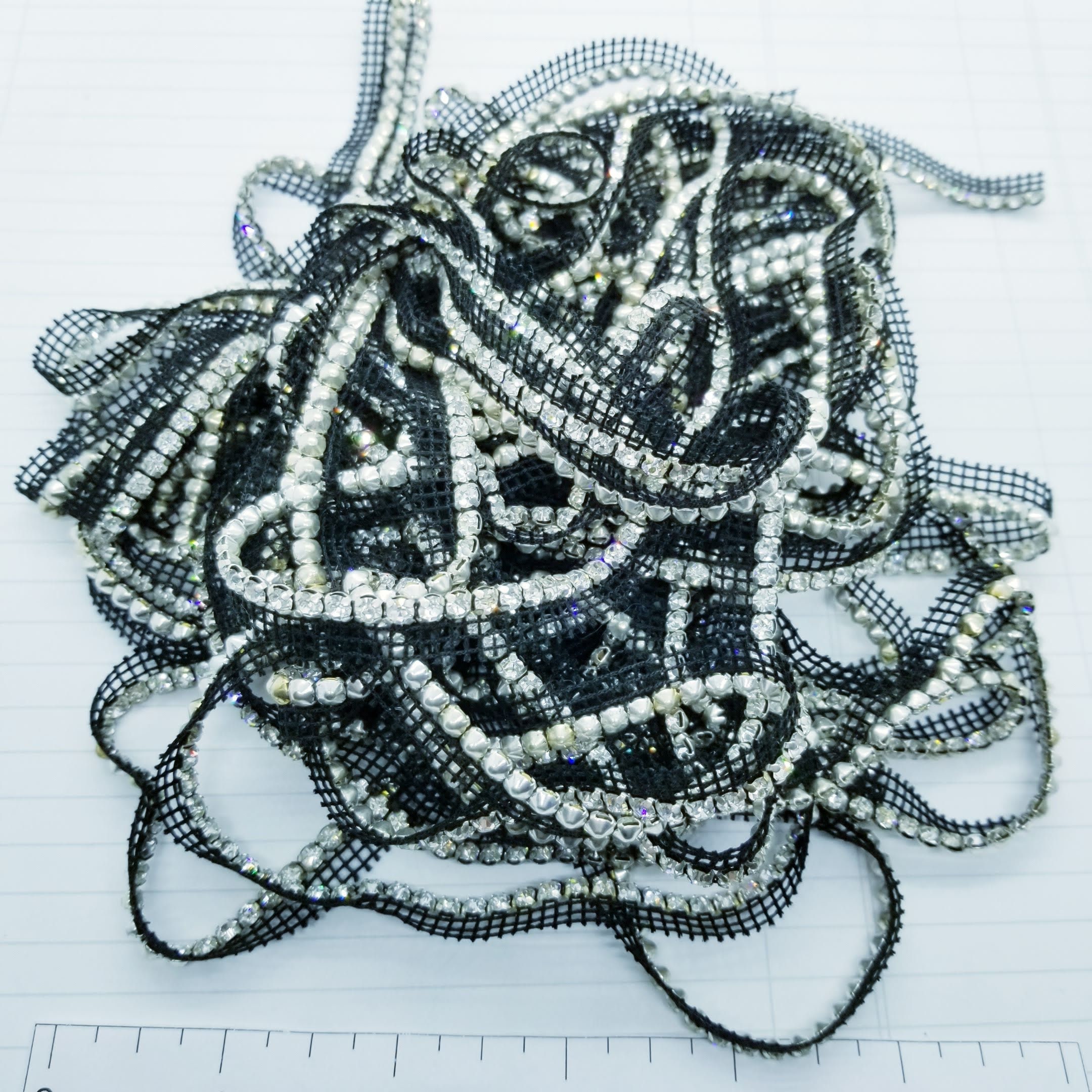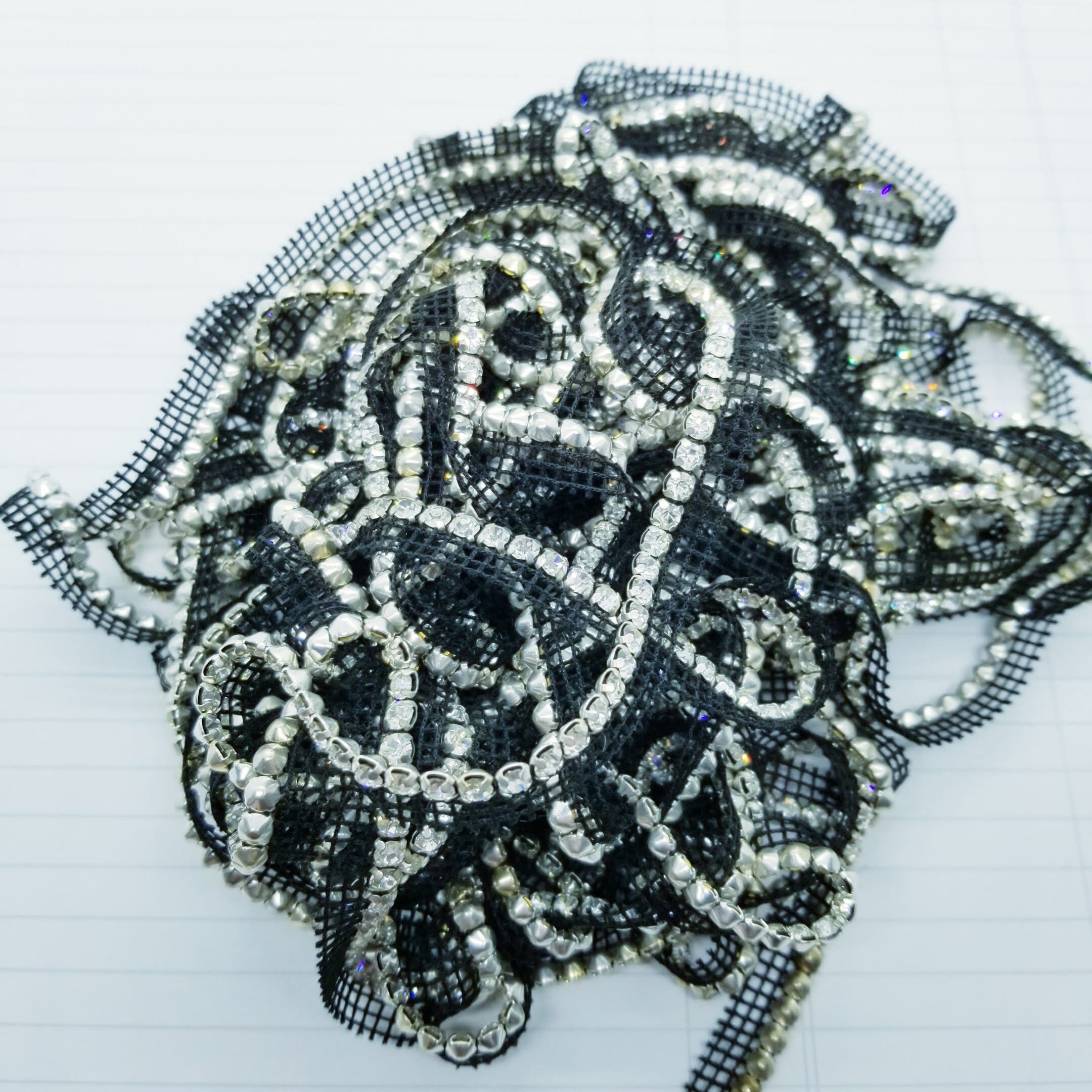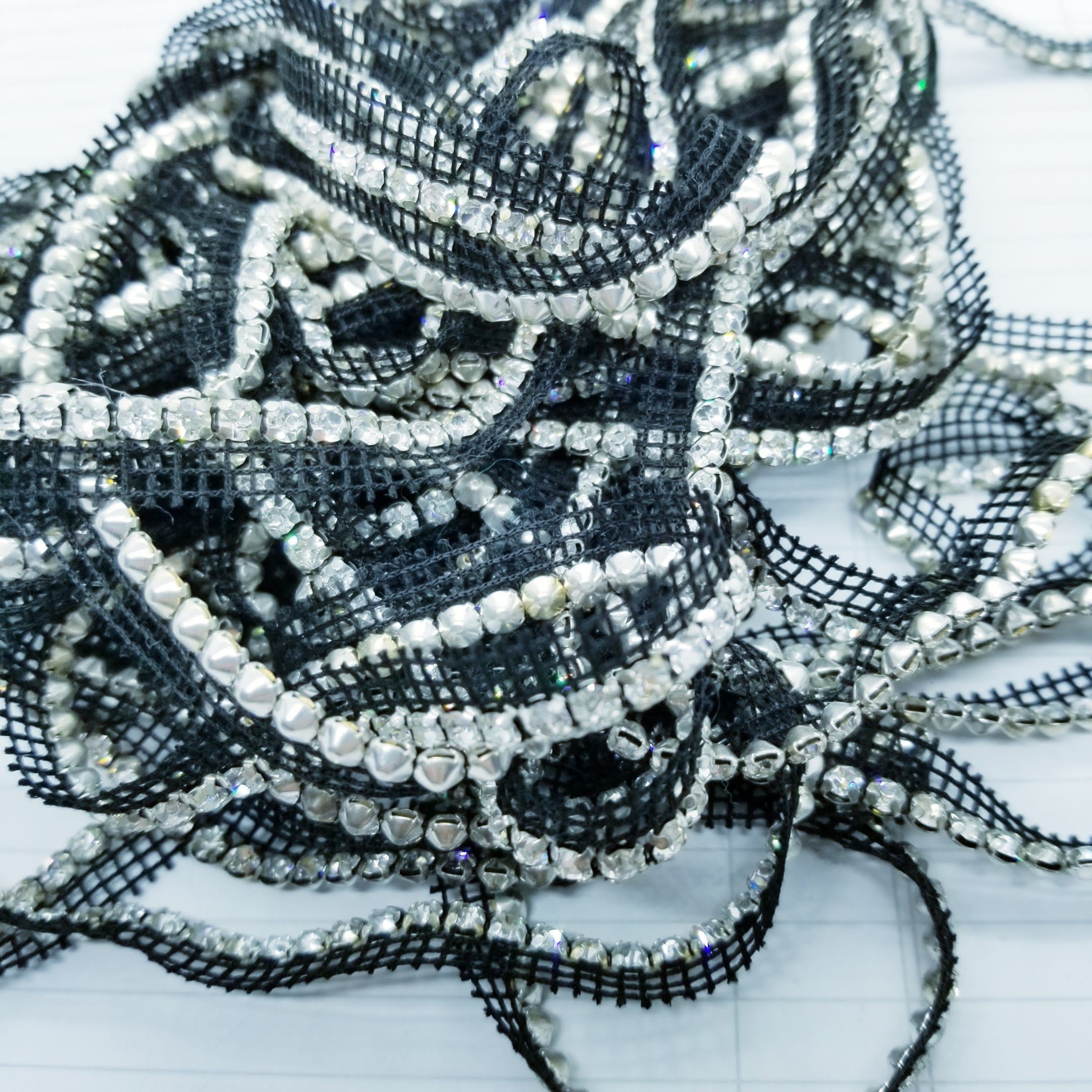Super sparkly rhinestone strip on a black mesh backing, sew into your garments or add to assemblages, collages or junk journals. Easily snipped off the backing.