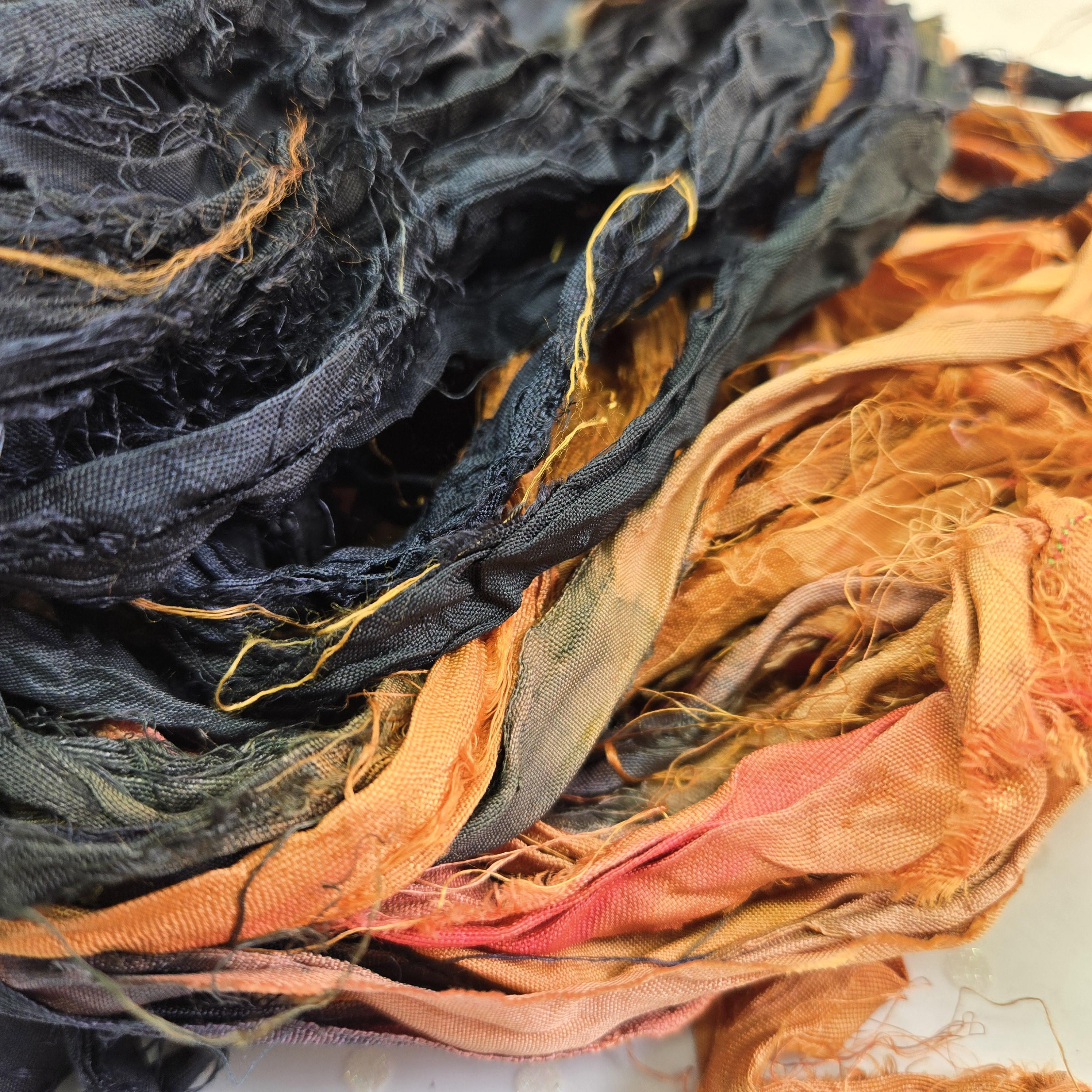 Perfect for junk journals, assemblage, collage or quilting arts. 4 Yards of torn edge, hand dyed silk sari, recycled fabric.