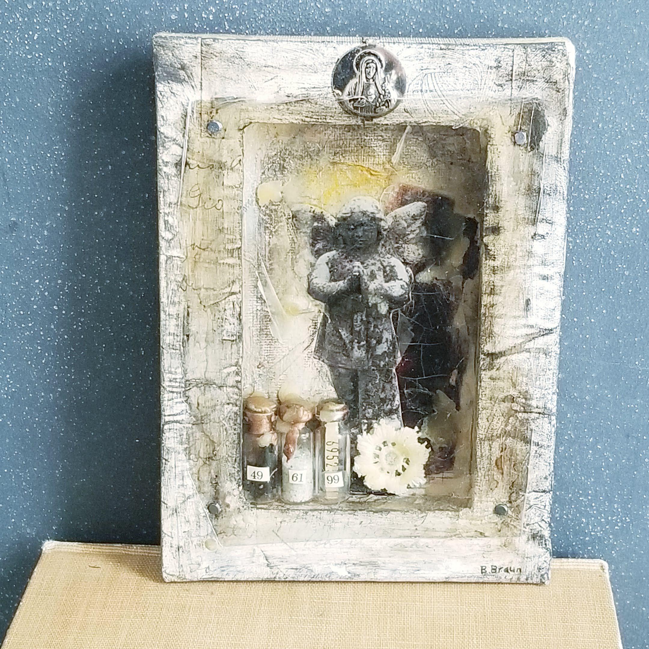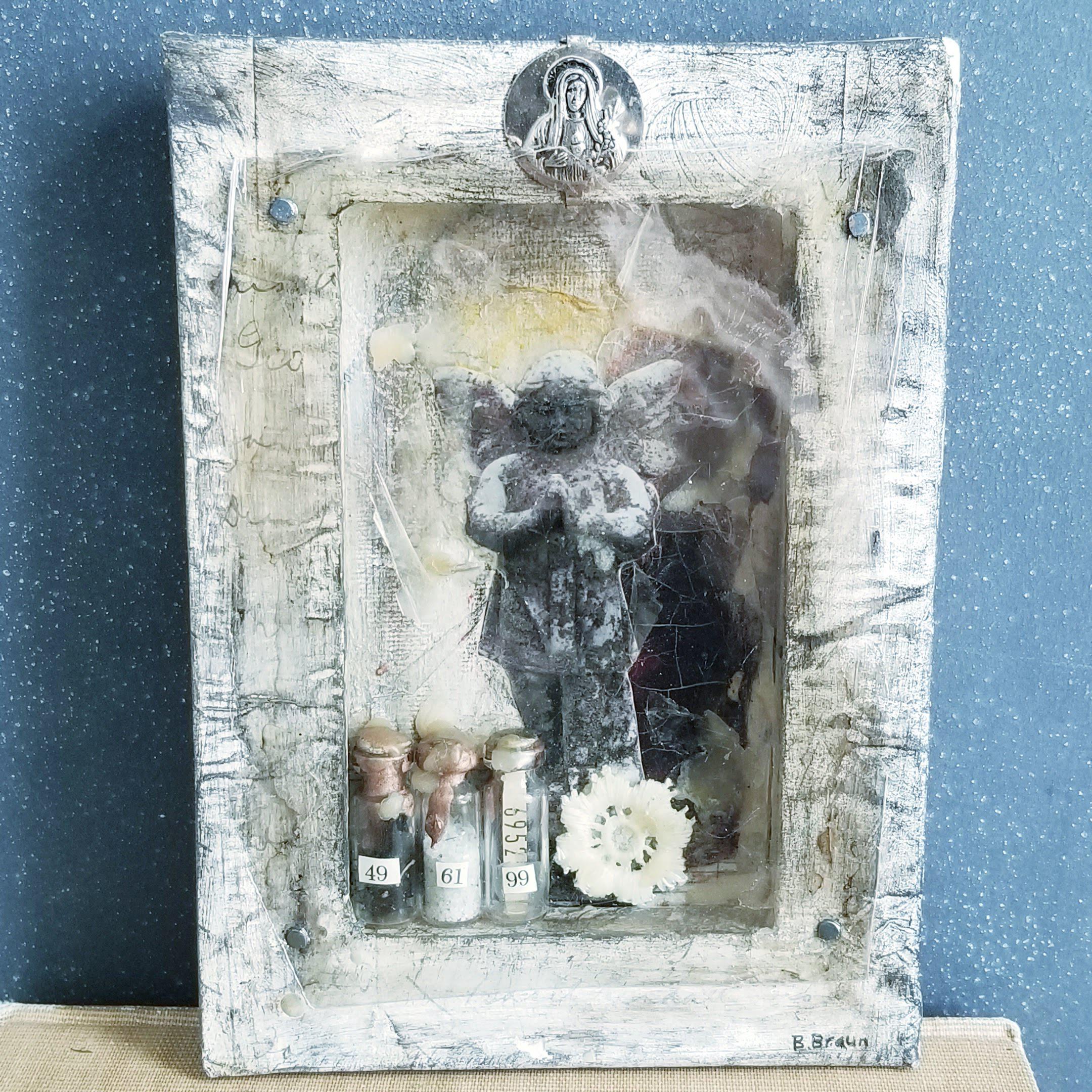 Angel collage built inside the reverse of a stretched canvas. I've layered my own photograph of a cemetery angel along with dripped beeswax, small bottles containing beads and salts, all contained within the niche and covered with a sheet of mica.