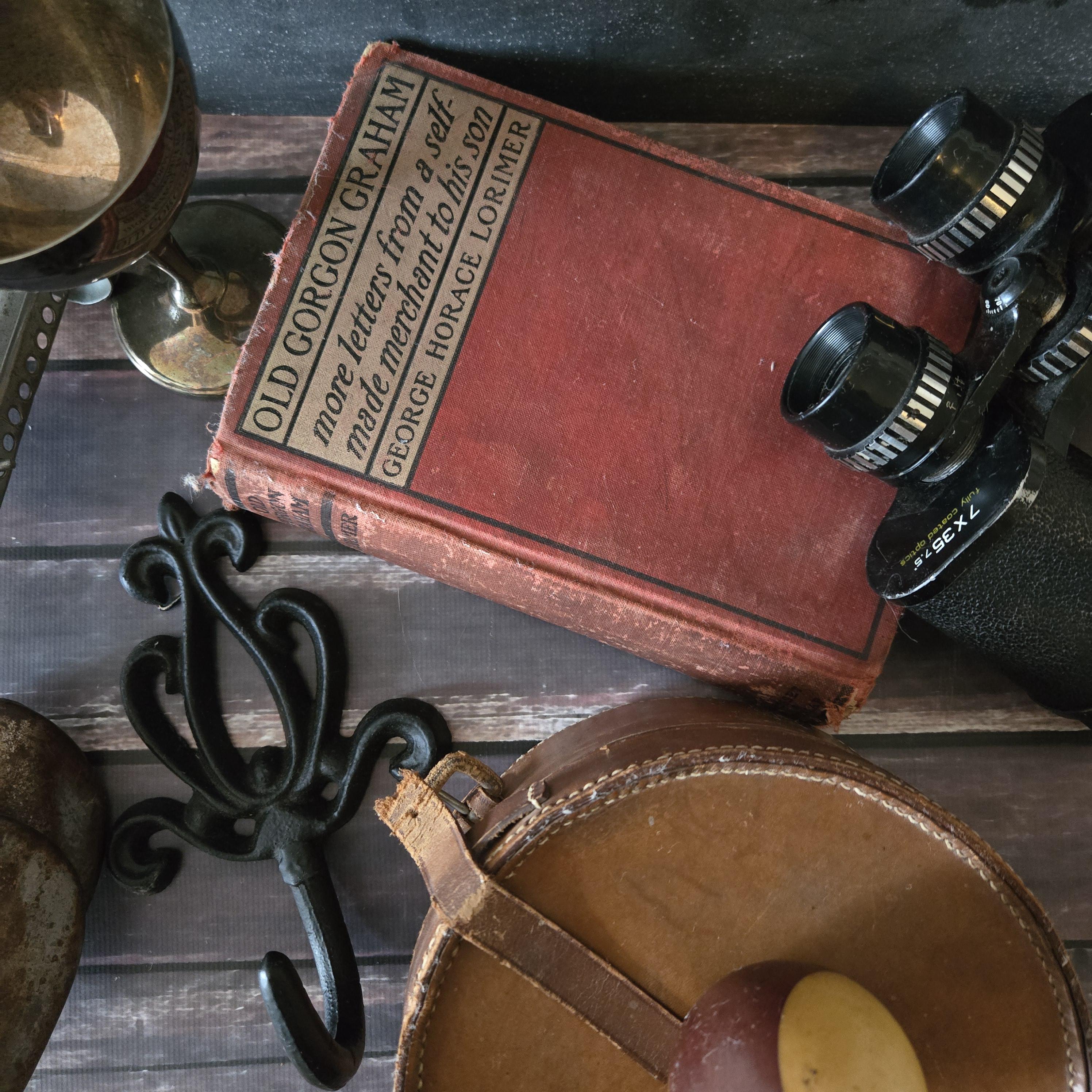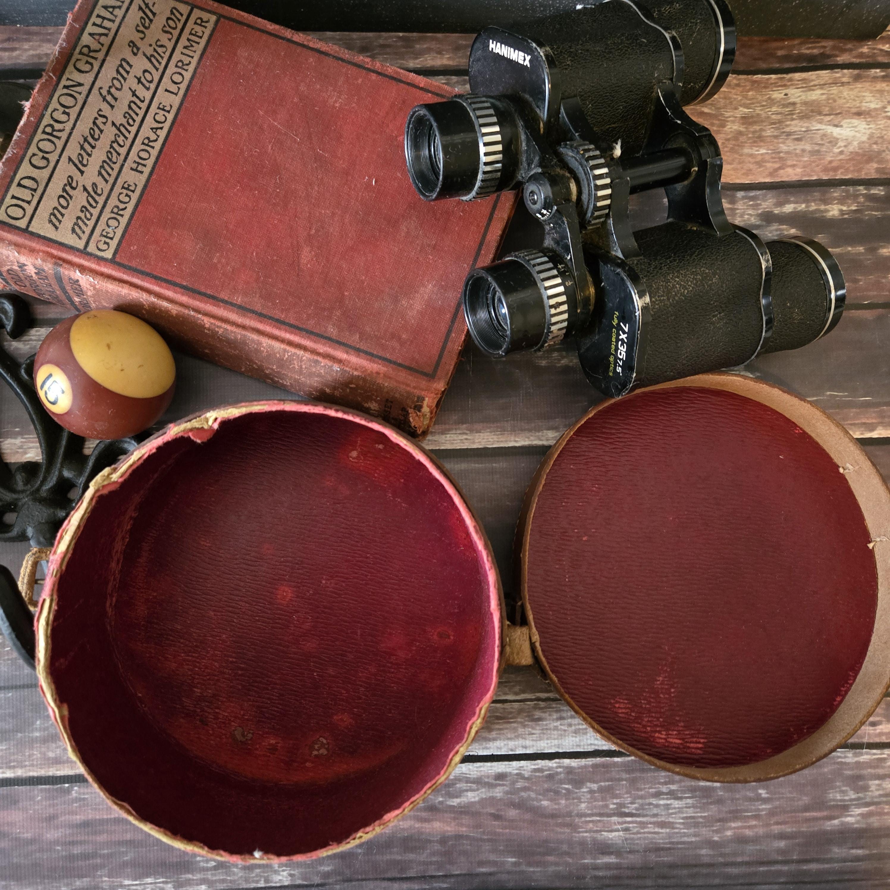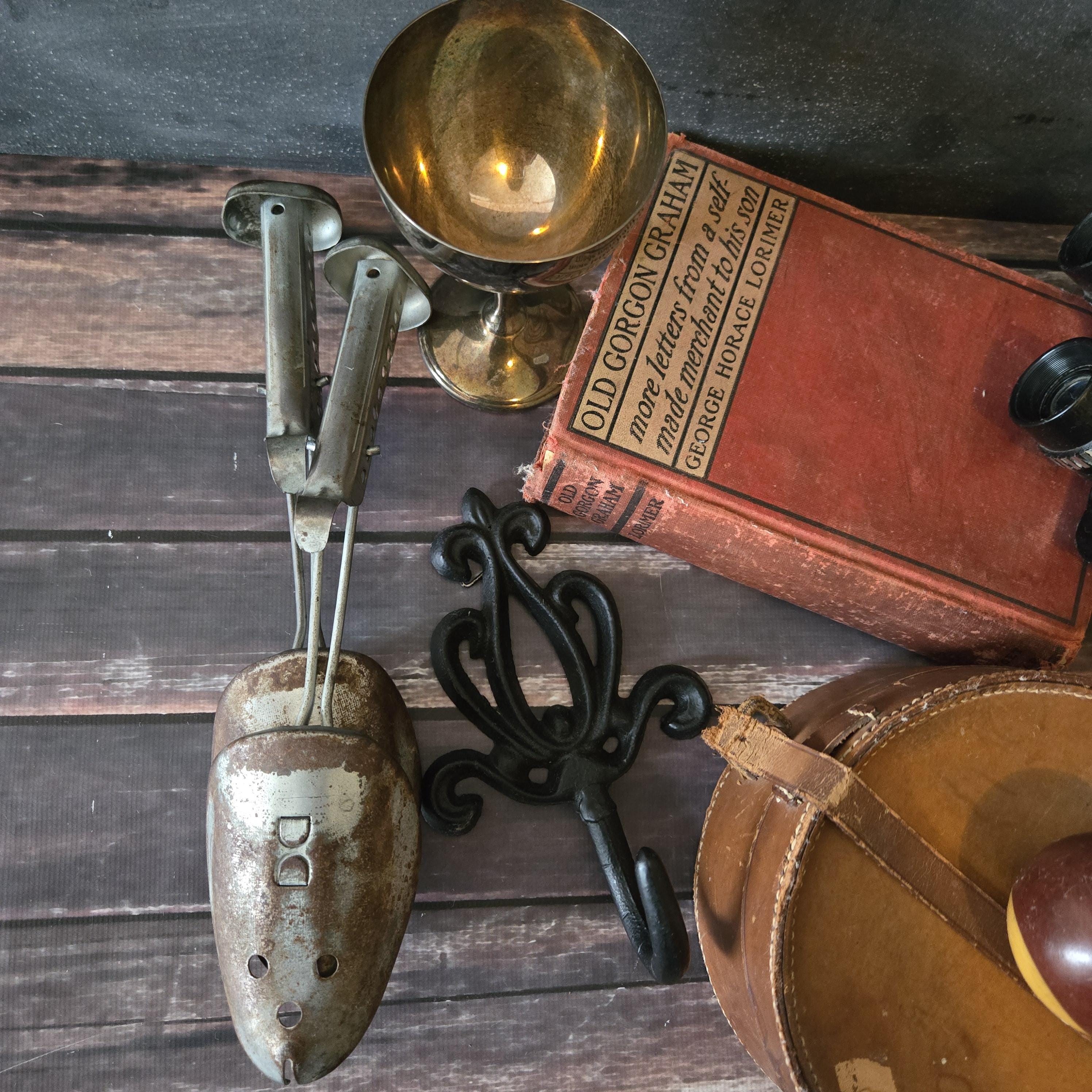 Gleaned from the hunting vacation home in the hills: leather collar box, shoe stretchers/forms, binoculars, goblet, pool ball, book and black hook.