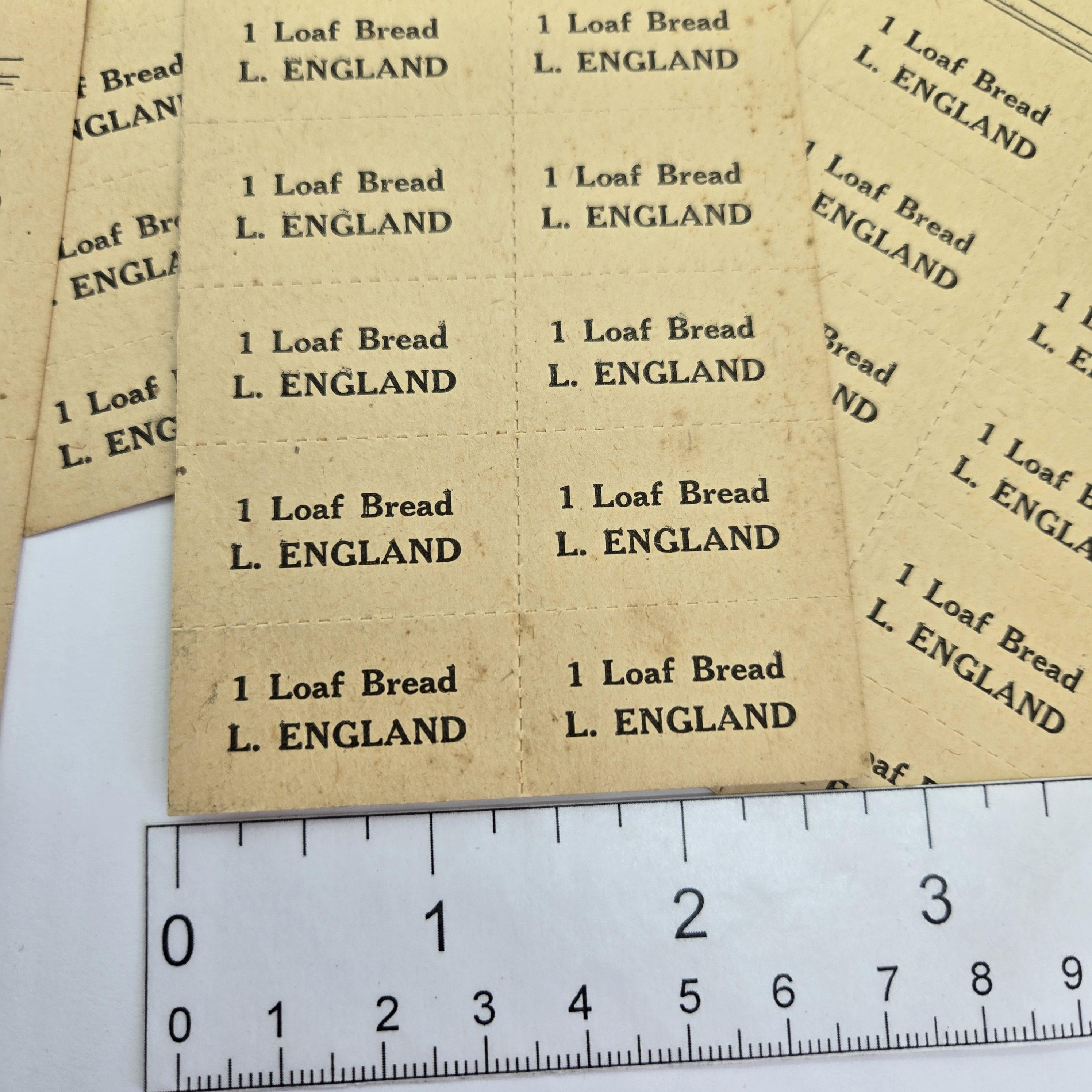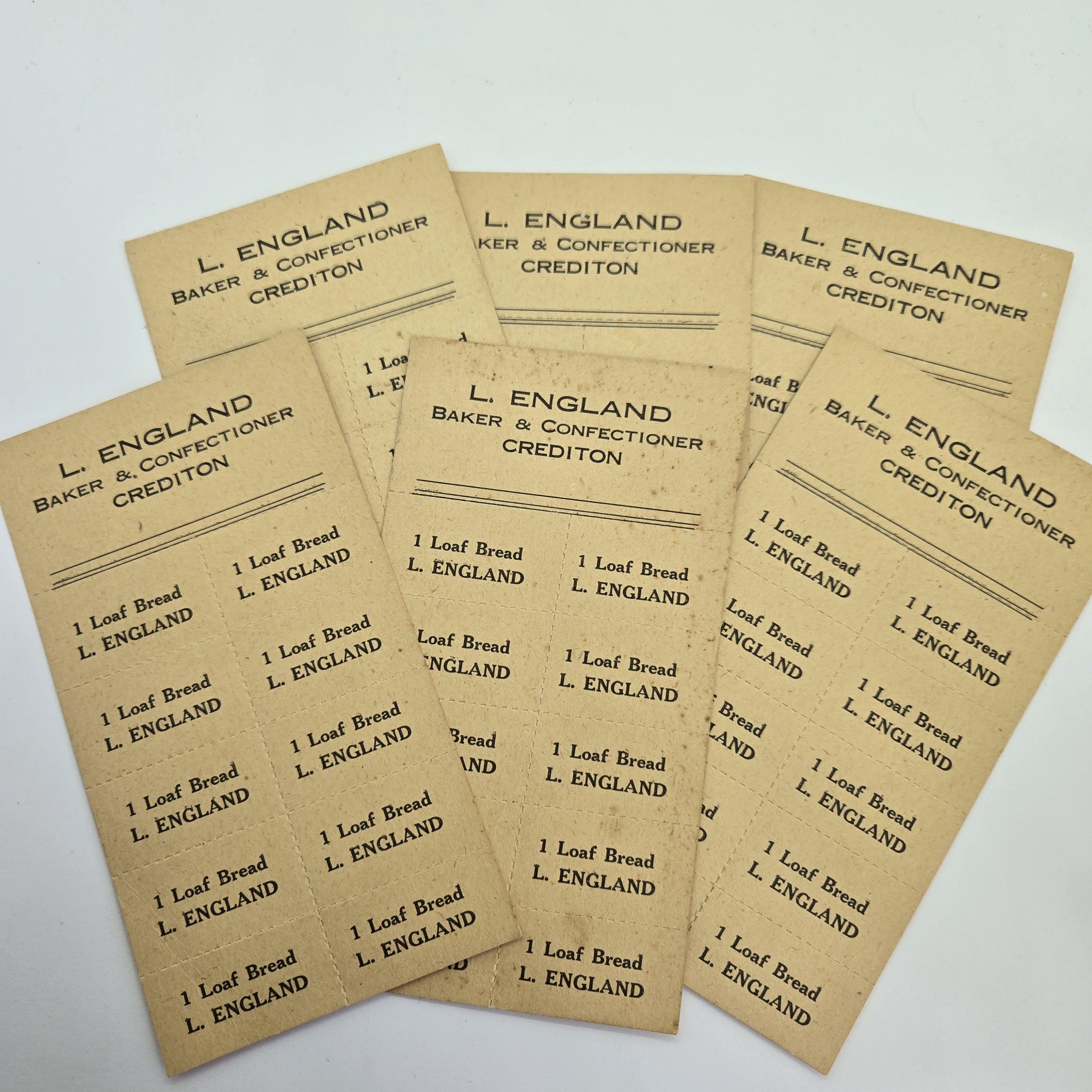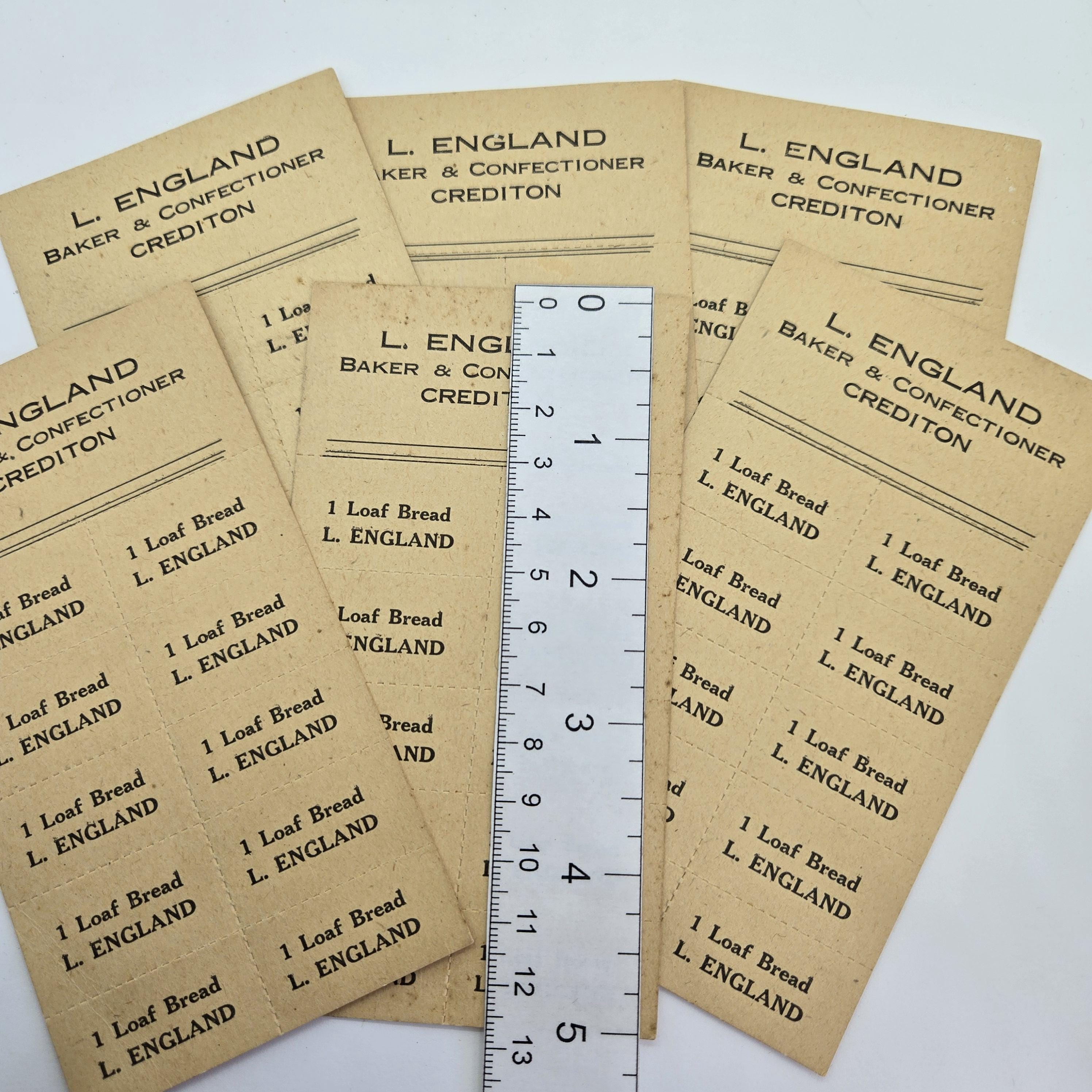 3 Vintage Bakery Token Sheets,L. England Baker & Confectioner Crediton, each sheet is 2 3/4 inches x 5 inches, use as background for collage, cut up and use for atc's, backgrounds for mini collages and on greeting cards.