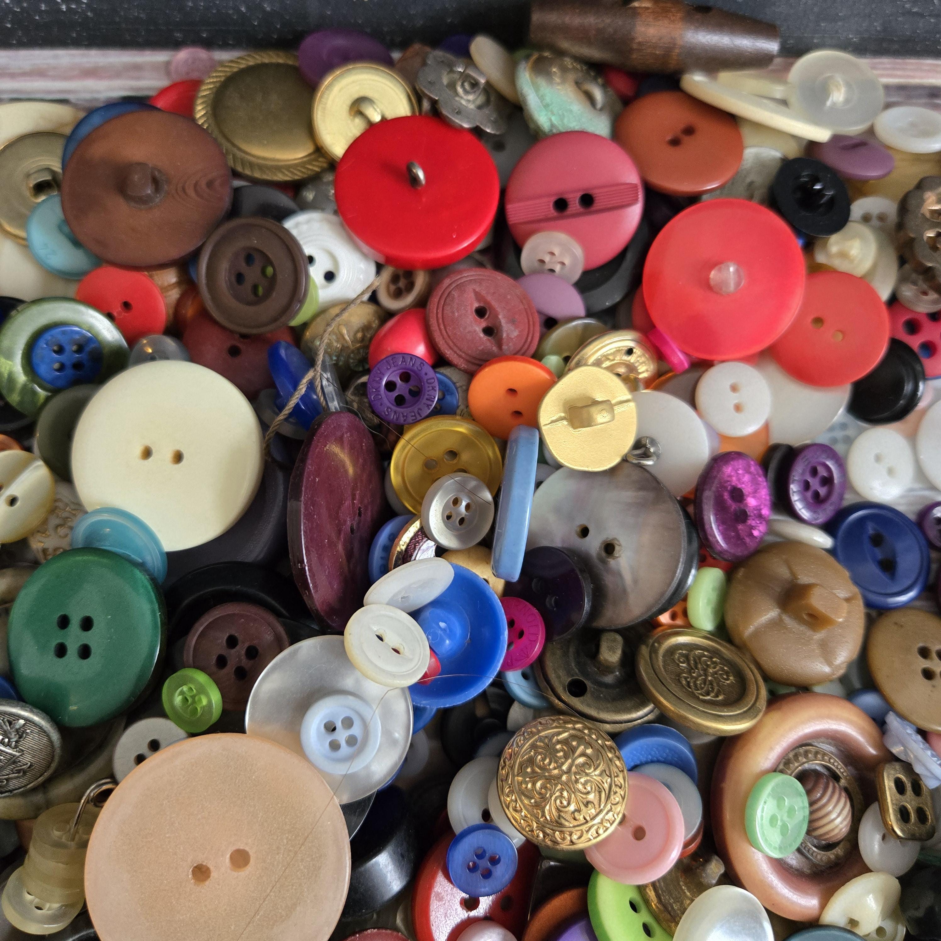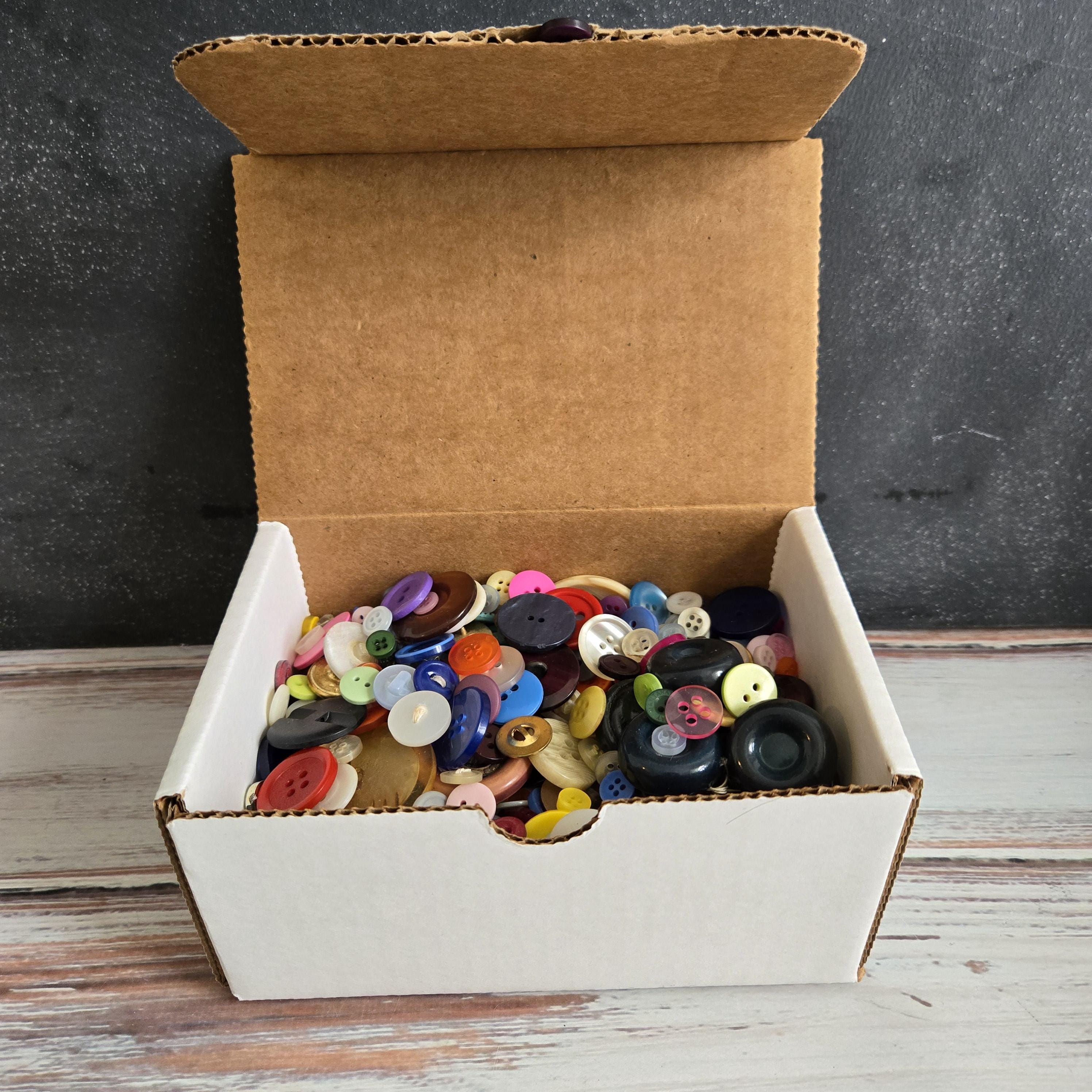 Lots of vintage buttons, good selection of colors and sizes packed into a box.