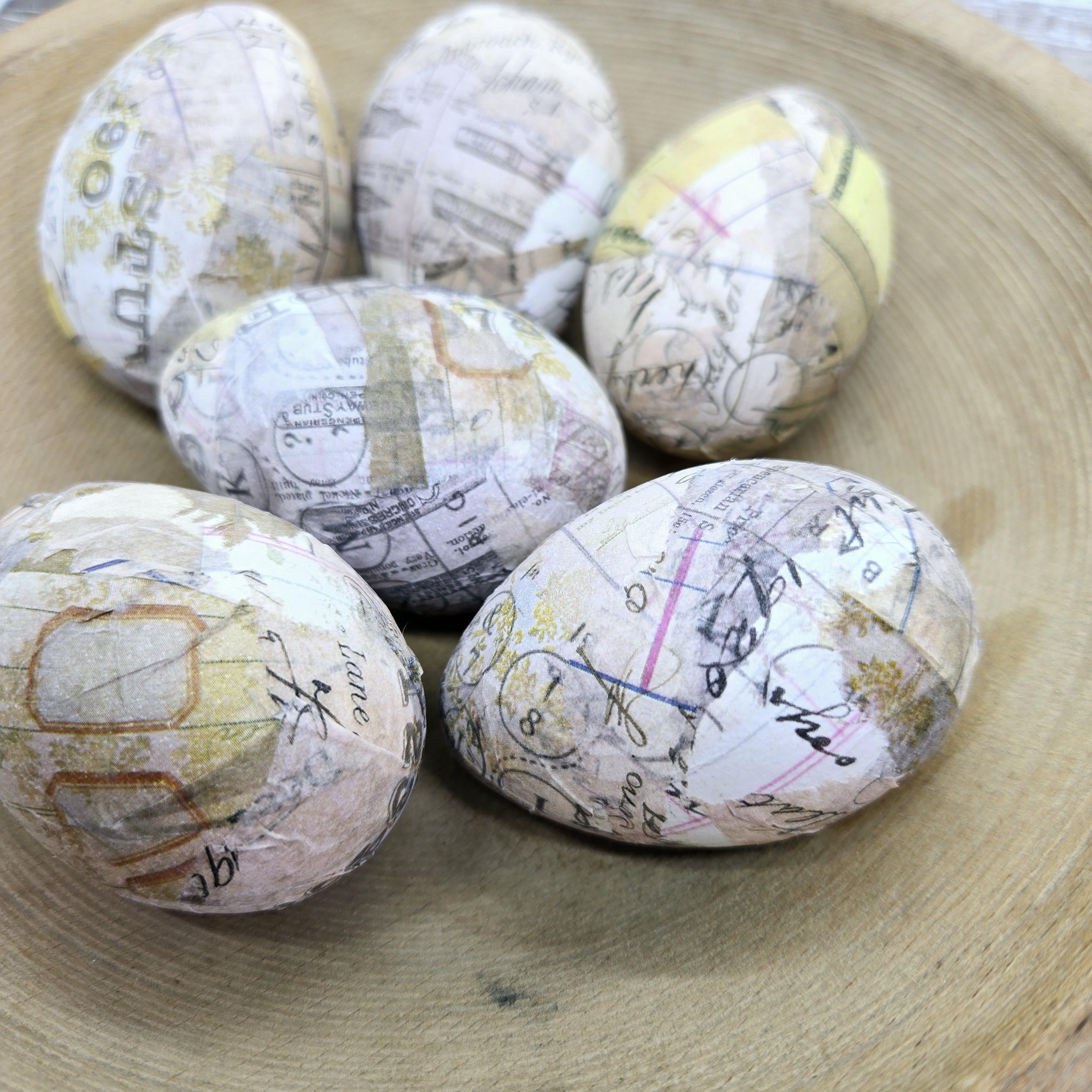 Rustic collaged hollow plastic eggs- approximately 2 1/2 to 2 3/4 inches in length.